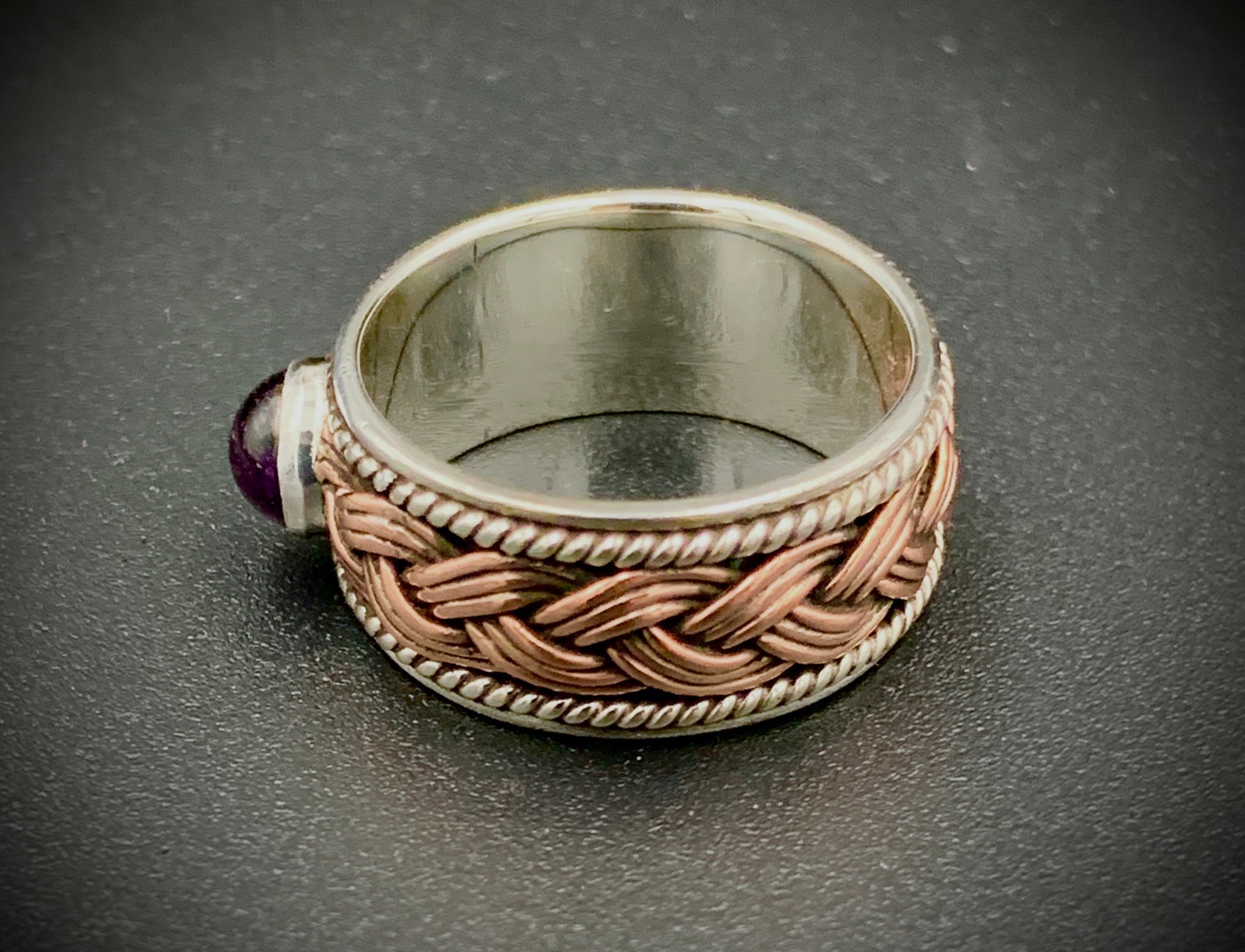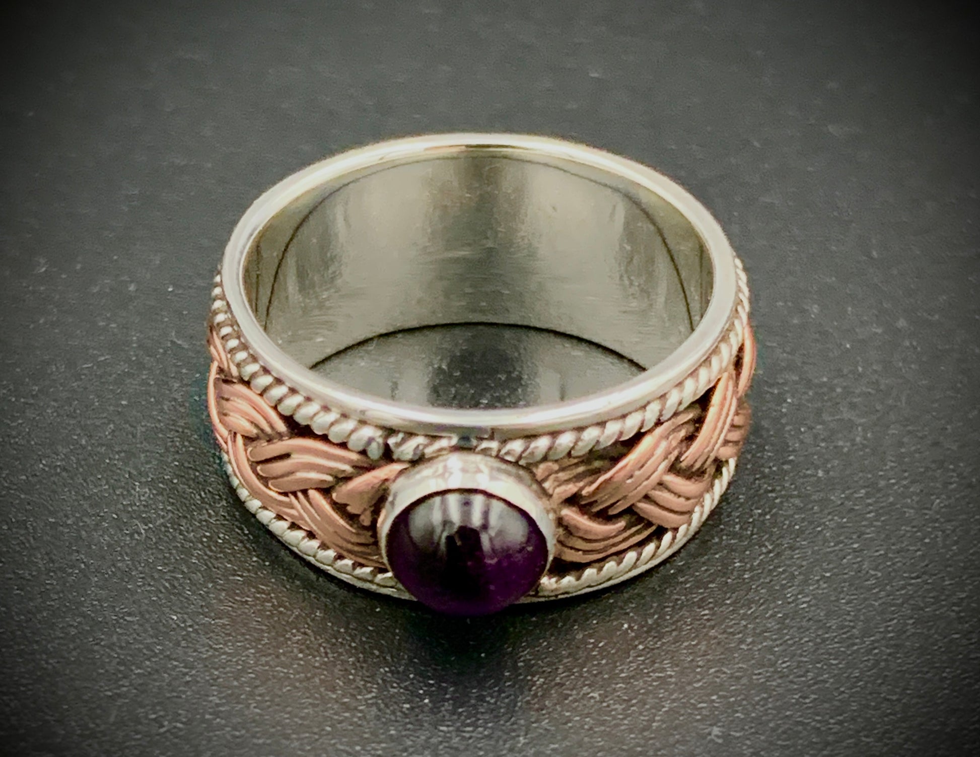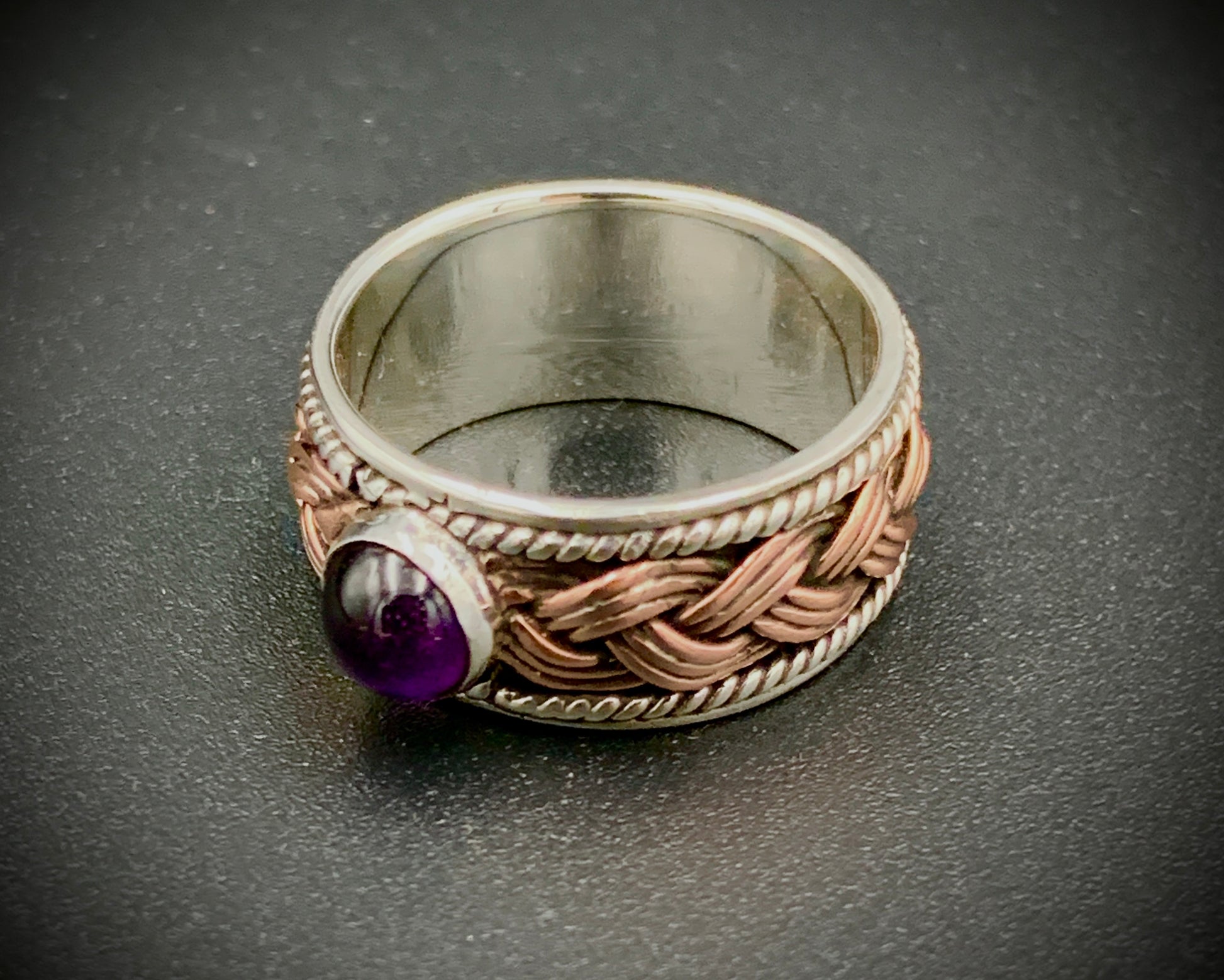 This one-of-a-kind ring is handmade from solid sterling silver and copper, custom-crafted into a timeless piece of art that is made to last many generations. This design uses hand-woven/twisted silver and copper wire soldered over a seamless silver band, featuring a vibrant amethyst cabochon bezel setting. This makes this ring full of interesting textures, yet extremely comfortable to wear, especially for those who cannot wear copper against their skin. All sheet material used in this piece was custom-crafted from hand-poured molten silver/copper in my solar-powered, off-grid studio.
