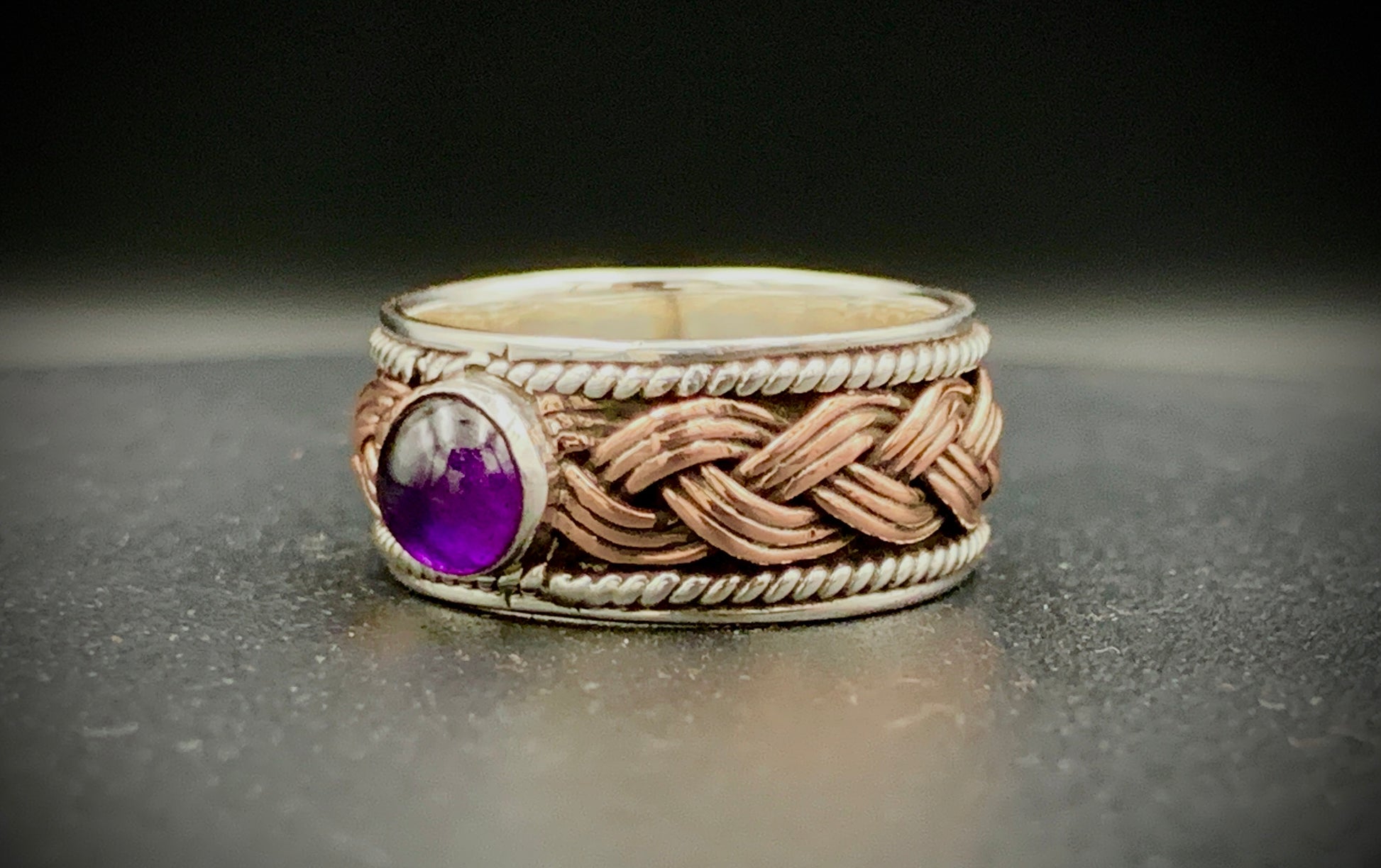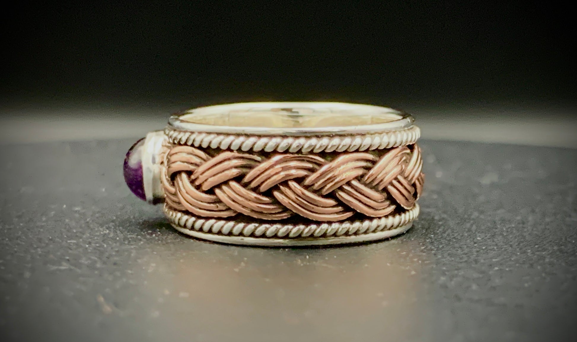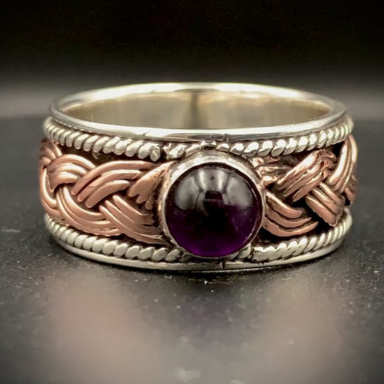 This one-of-a-kind ring is handmade from solid sterling silver and copper, custom-crafted into a timeless piece of art that is made to last many generations. This design uses hand-woven/twisted silver and copper wire soldered over a seamless silver band, featuring a vibrant amethyst cabochon bezel setting. This makes this ring full of interesting textures, yet extremely comfortable to wear, especially for those who cannot wear copper against their skin. All sheet material used in this piece was custom-crafted from hand-poured molten silver/copper in my solar-powered, off-grid studio.