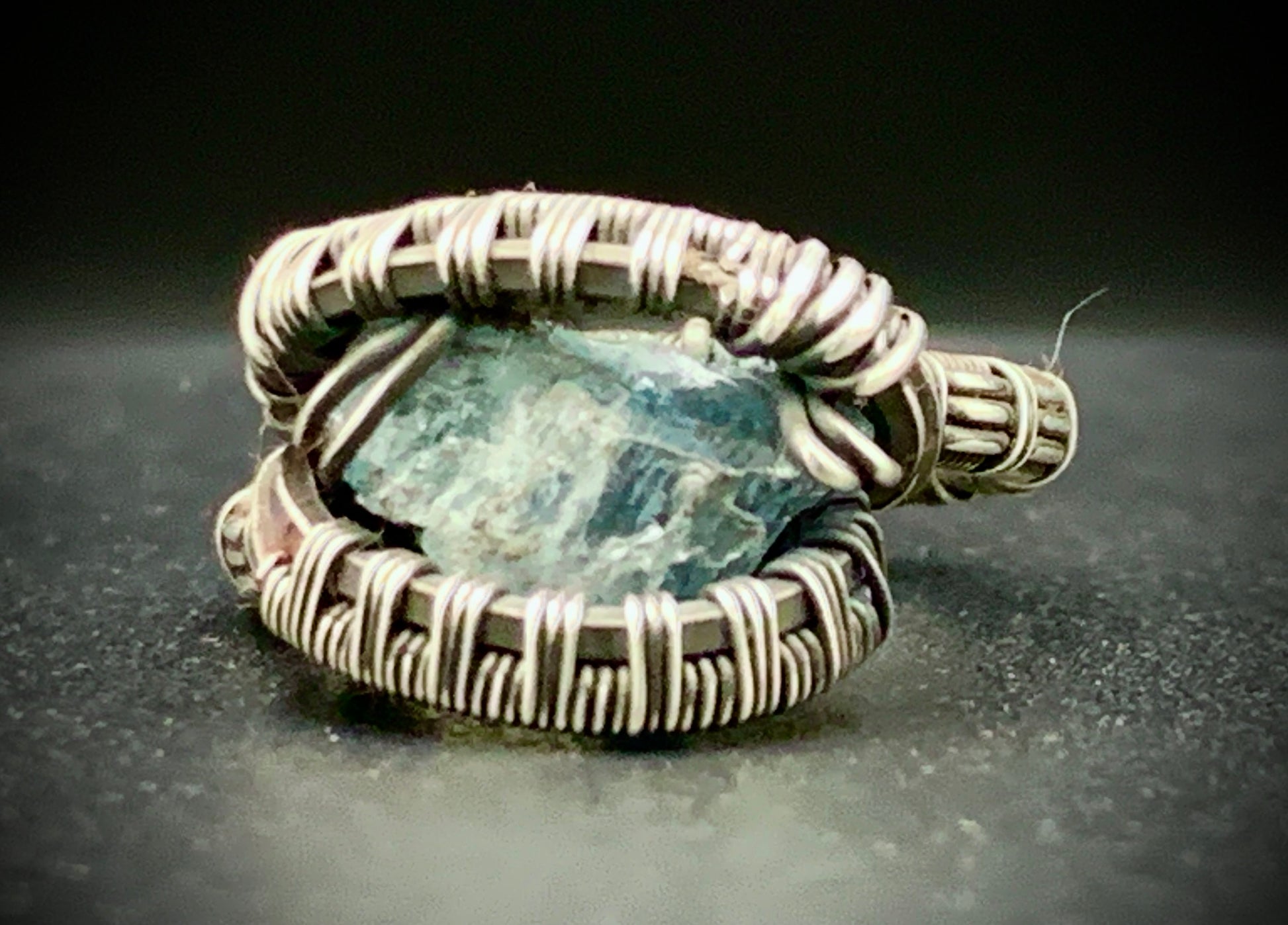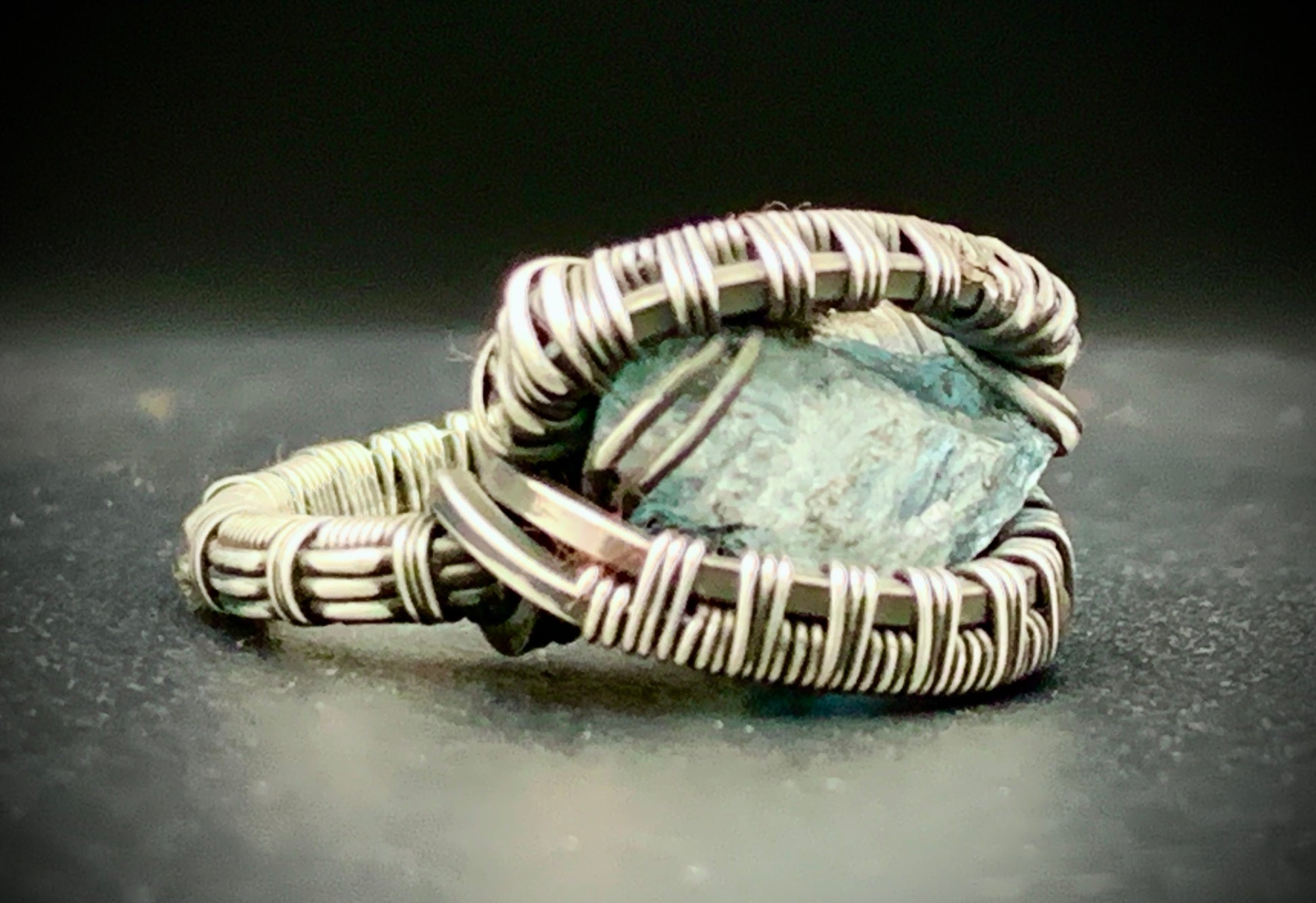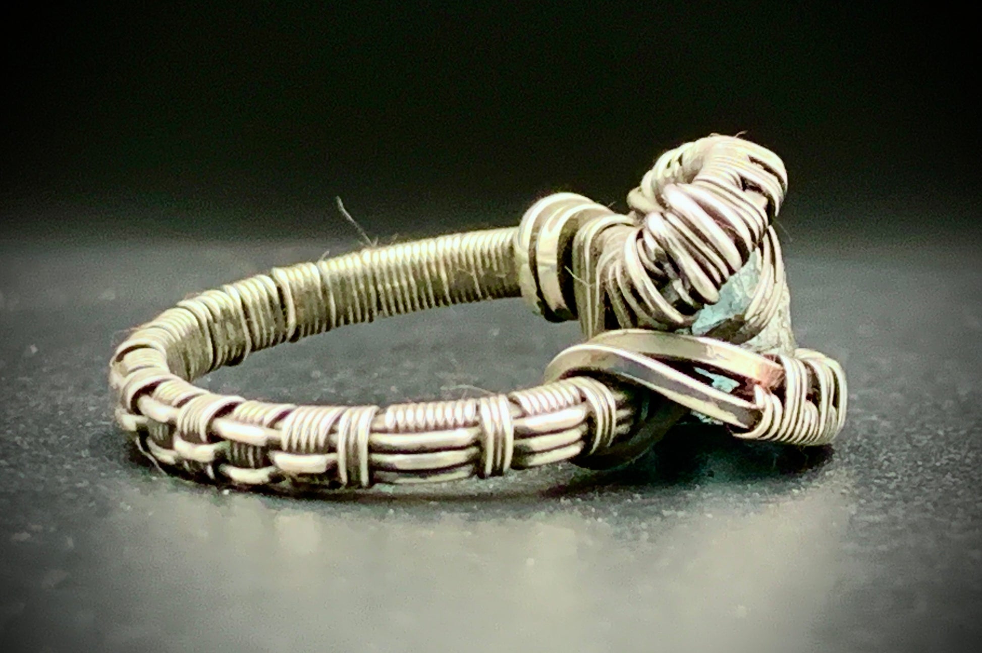 This one-of-a-kind ring is hand-wrapped with sterling silver wire, featuring a gorgeous piece of raw aquamarine woven into the braided design. Includes a unique, intricate weave-patterned band! Crafted with love in my 100% solar-powered off-grid silversmithing studio. Size 66