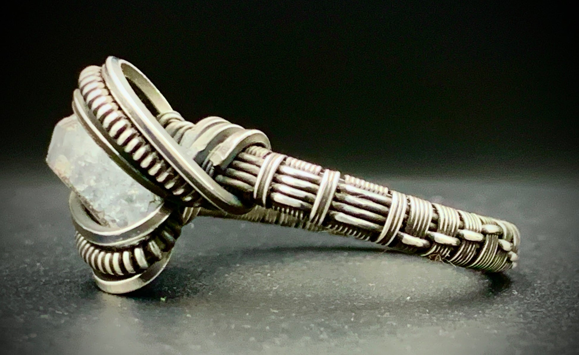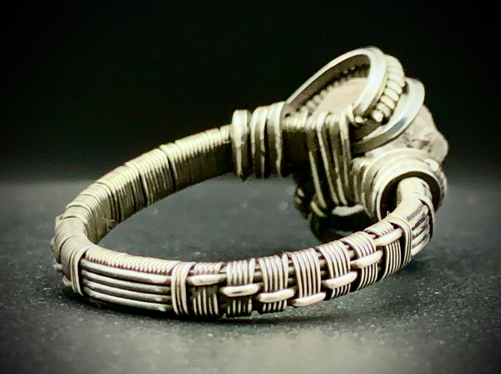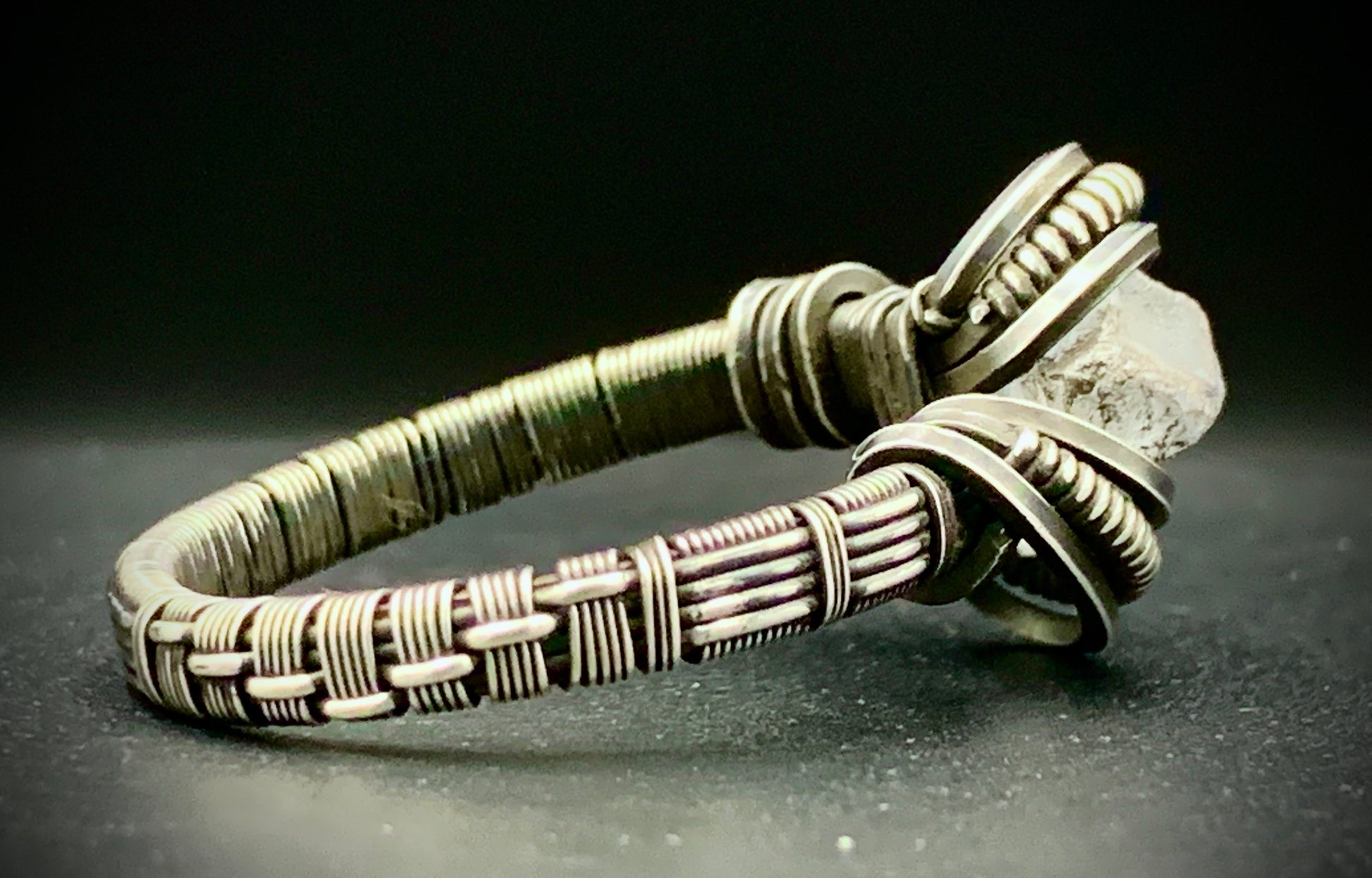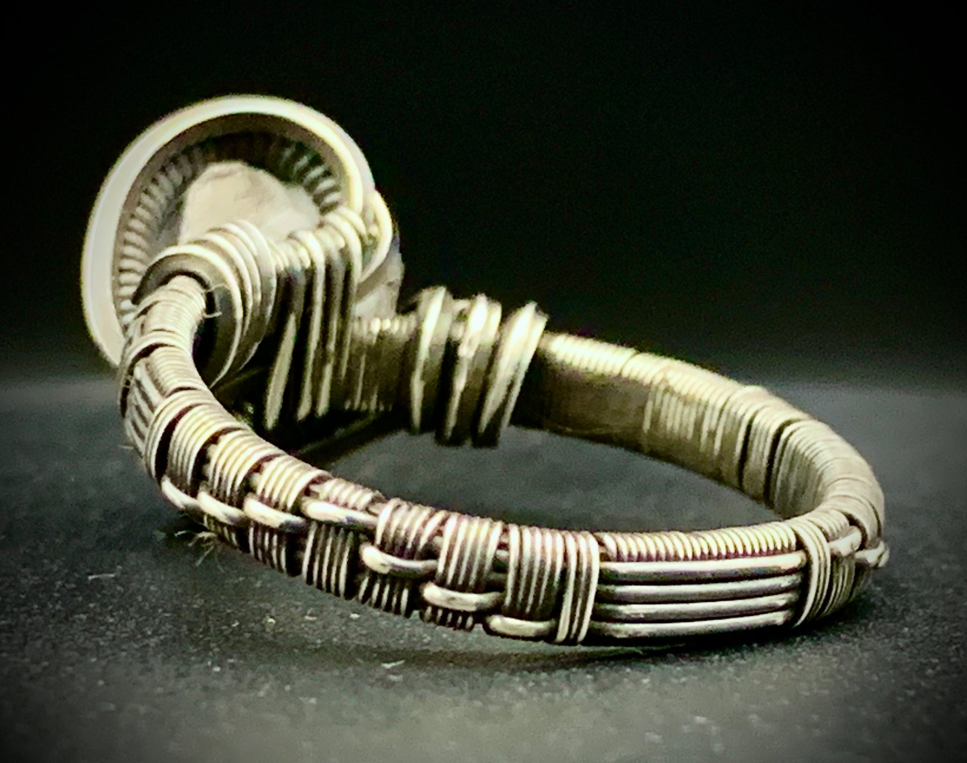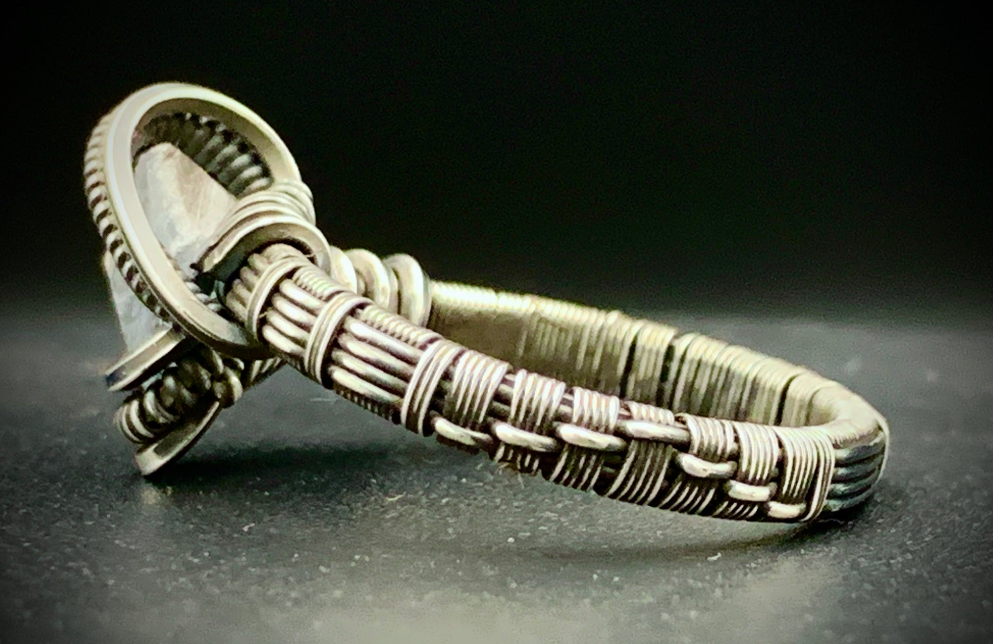 This one-of-a-kind ring is hand-wrapped with sterling silver wire, featuring a gorgeous piece of raw celestite woven into the braided design. Includes a unique, intricate weave-patterned band! Crafted with love in my 100% solar-powered off-grid silversmithing studio. Size 12
