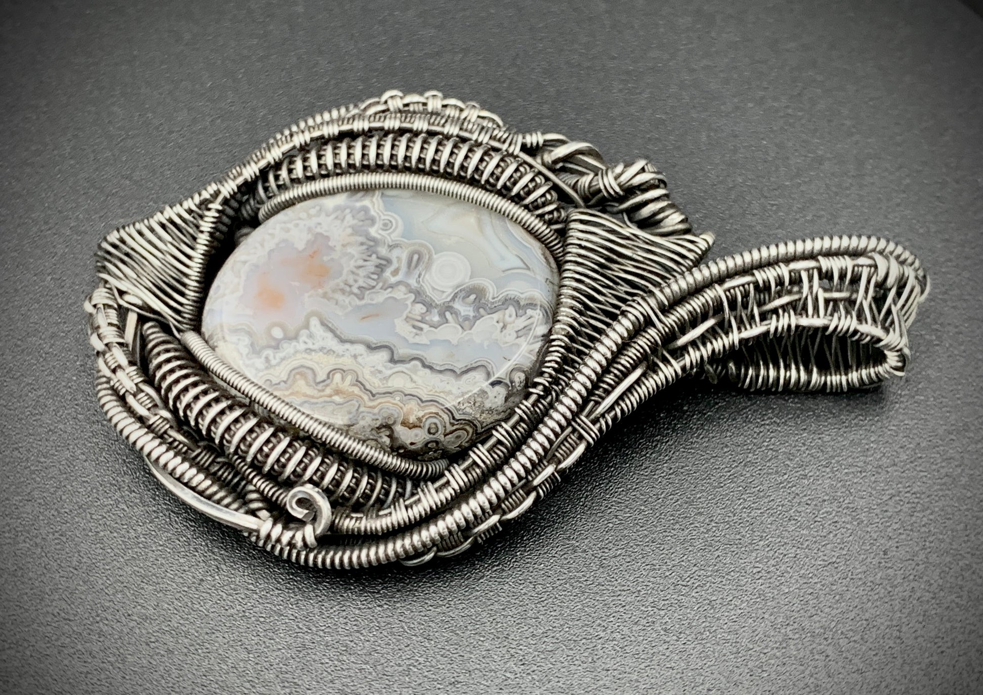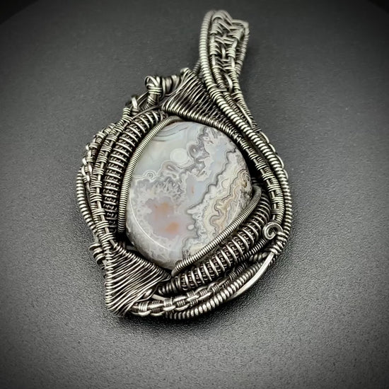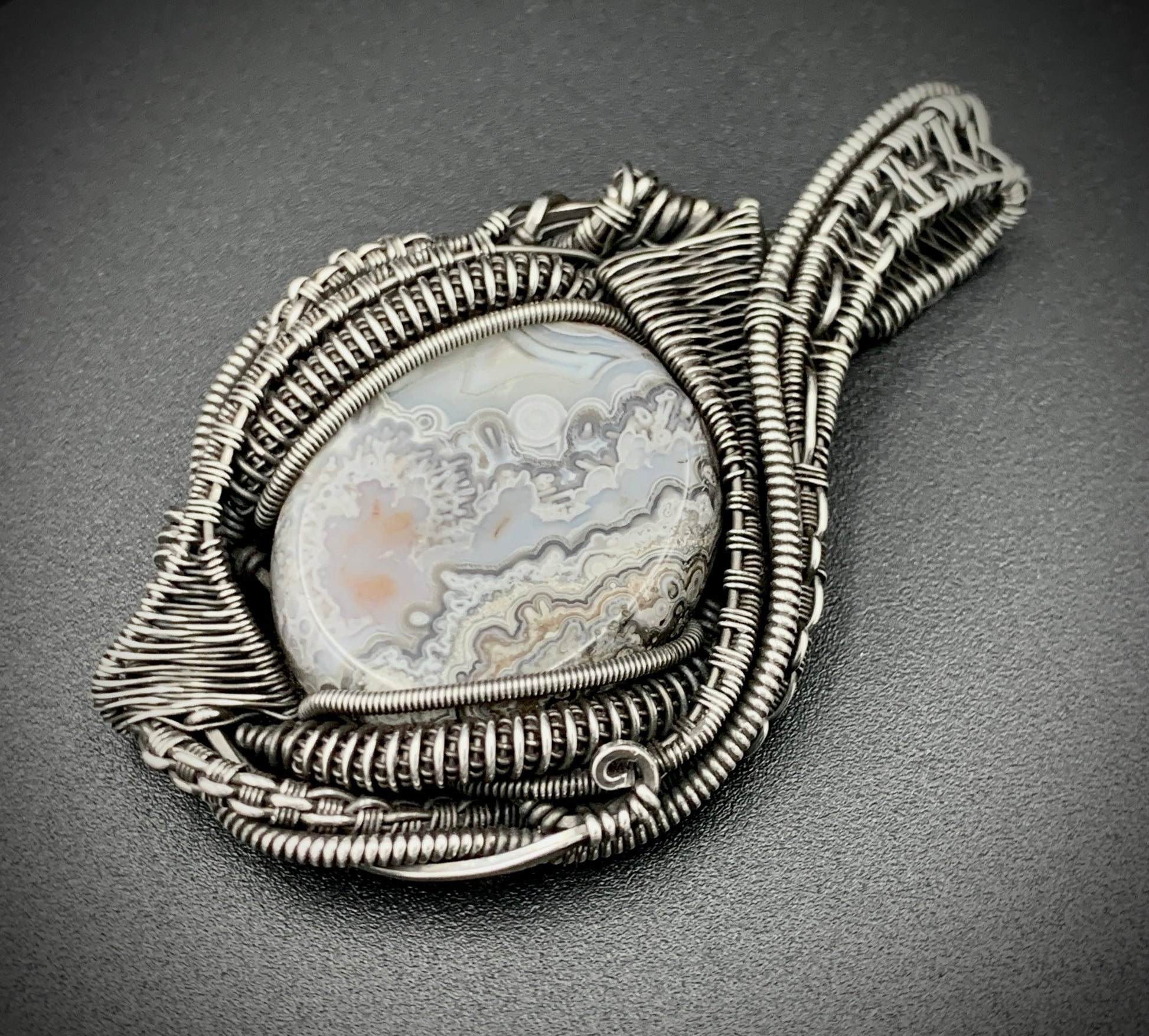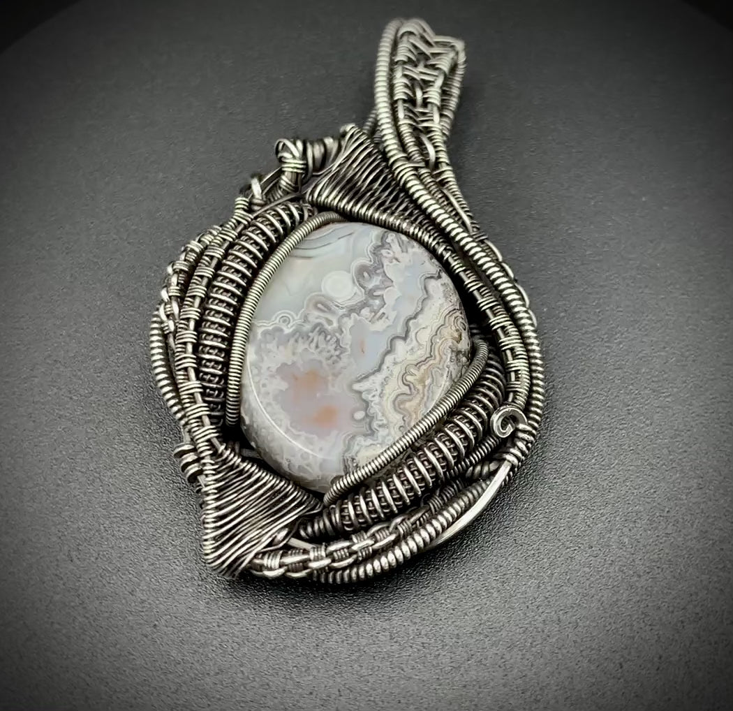 This one-of-a-kind pendant is hand-wrapped with sterling silver wire, featuring a gorgeous agate cabochon woven into the braided design. Embrace the peaceful warrior within you with this powerful piece! Crafted with love in my 100% solar-powered off-grid silversmithing studio.