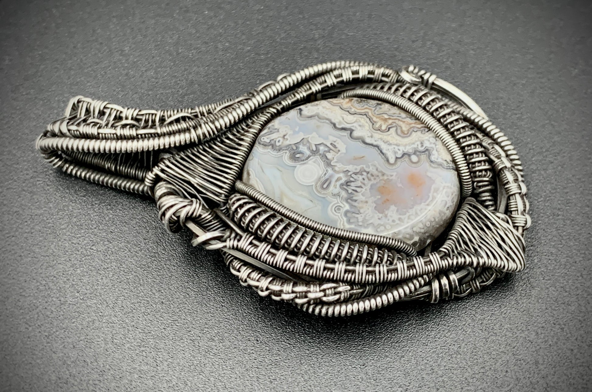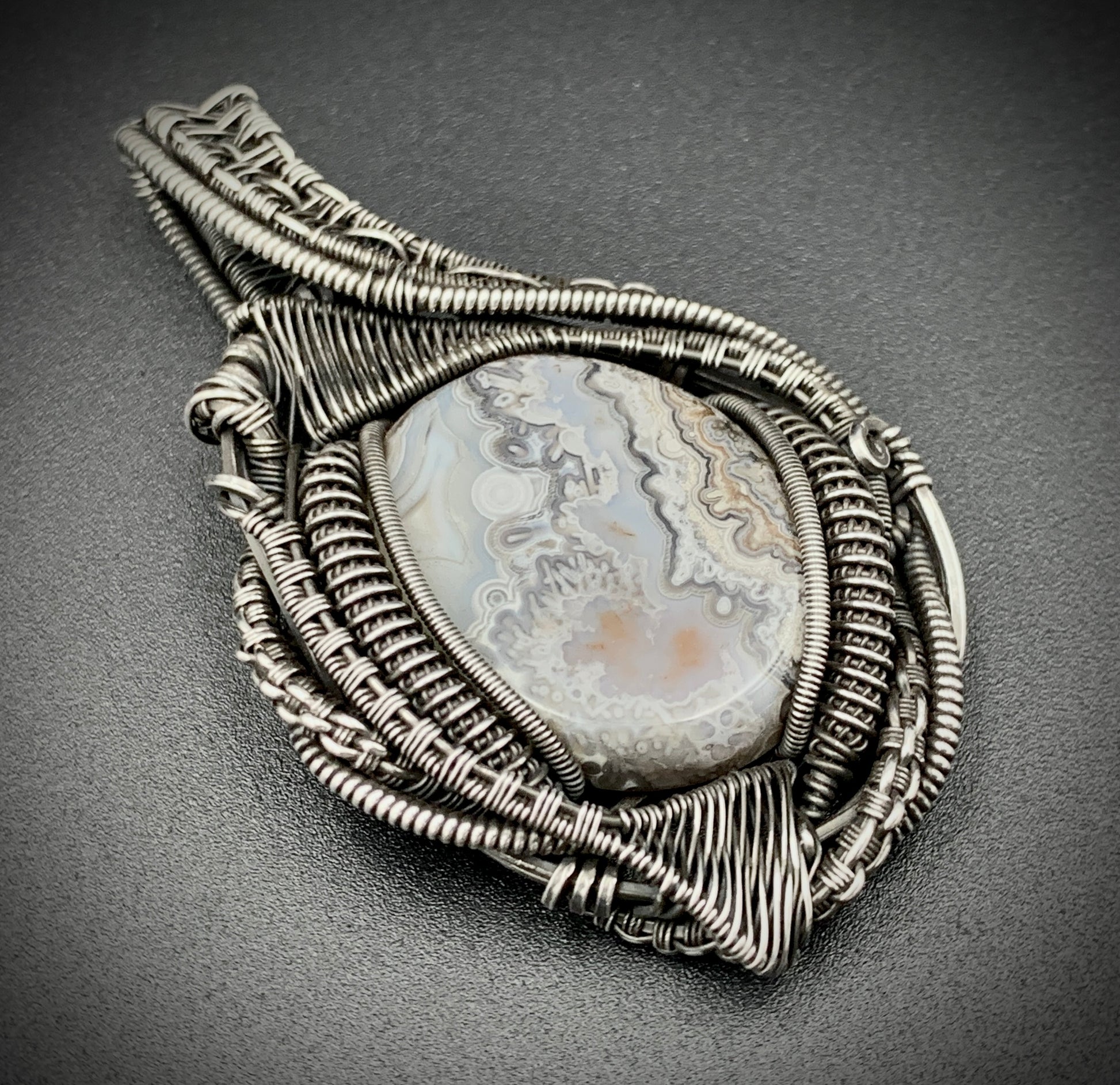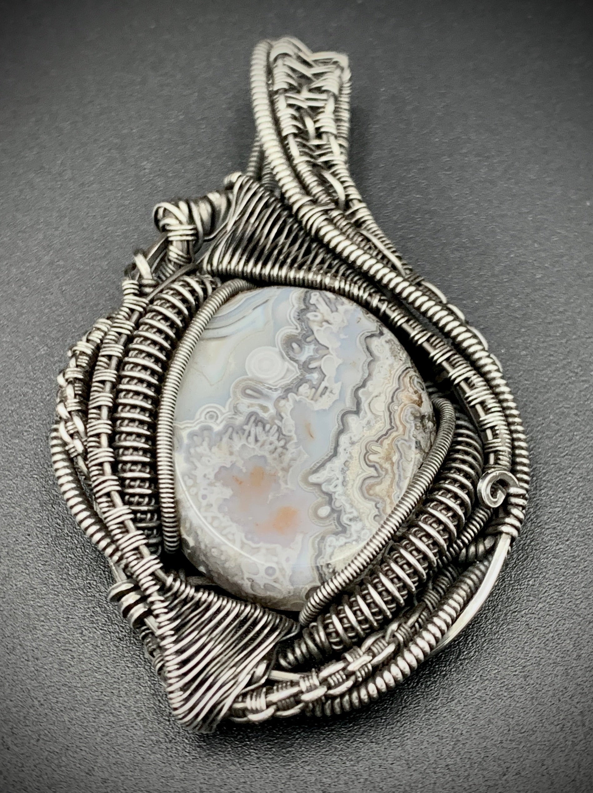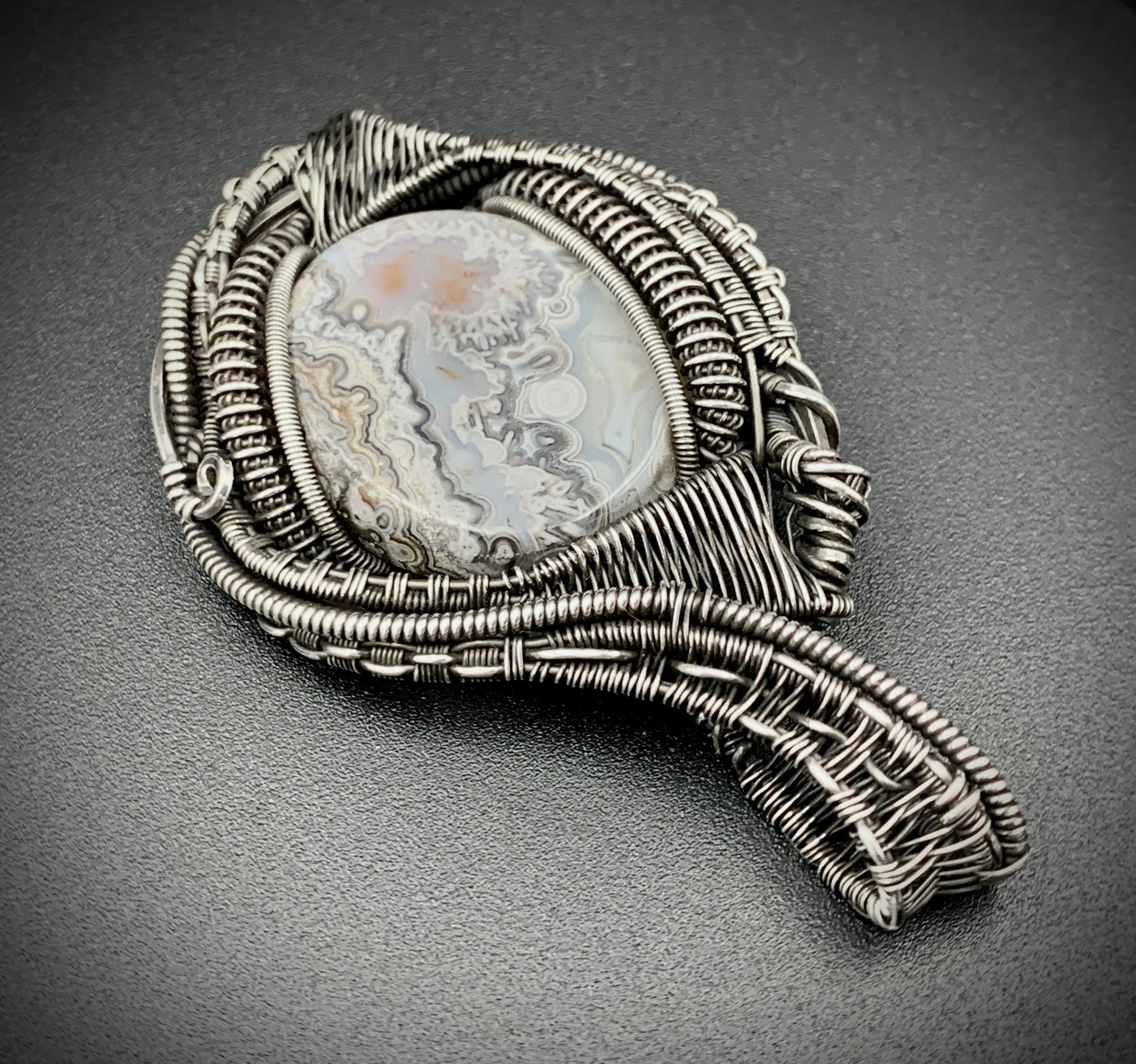 This one-of-a-kind pendant is hand-wrapped with sterling silver wire, featuring a gorgeous agate cabochon woven into the braided design. Embrace the peaceful warrior within you with this powerful piece! Crafted with love in my 100% solar-powered off-grid silversmithing studio.