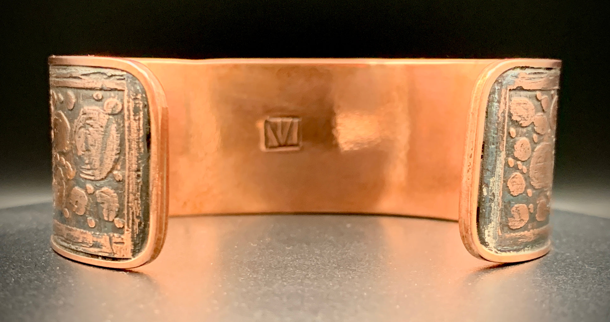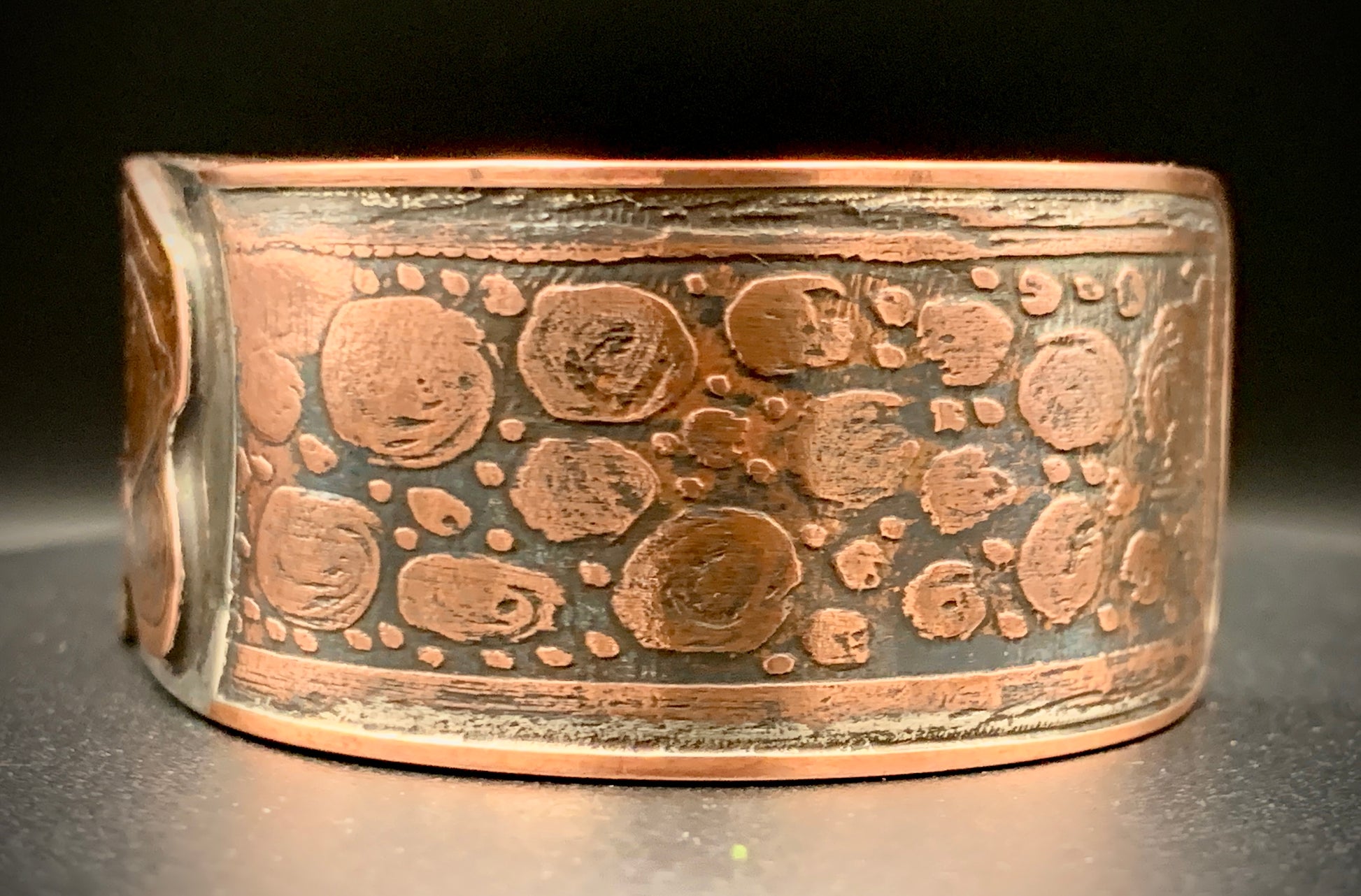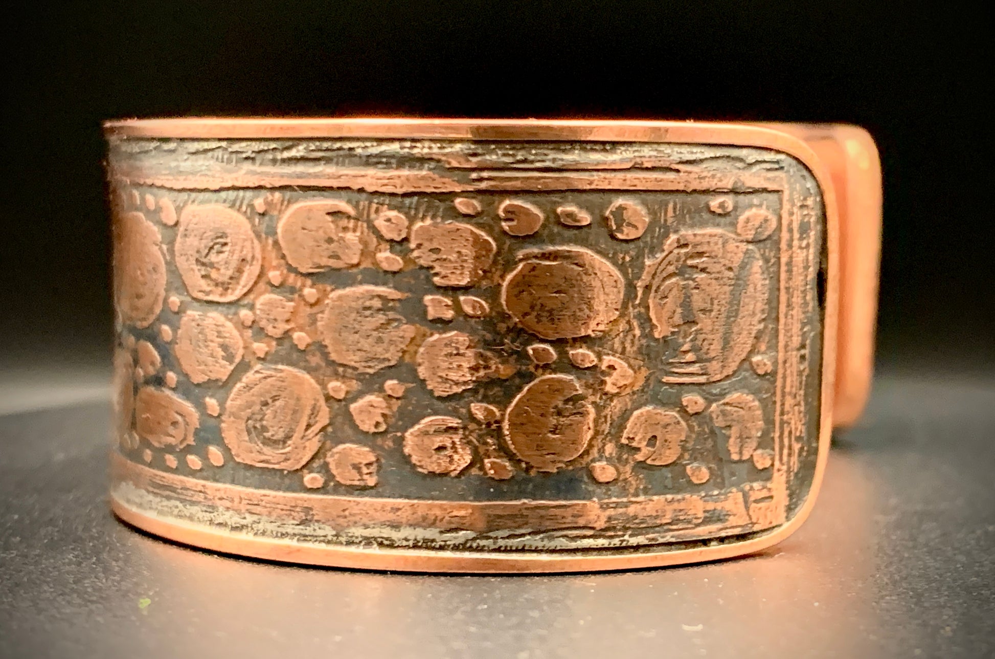 This one-of-a-kind bracelet is hand forged using acid-etched copper with silver highlights. Embrace the natural mystic within you with this powerful piece! Crafted with love in my 100% solar-powered off-grid silversmithing studio. Fits a 7 to 8 inch wrist, can be adjusted to fit by gently opening or closing the cuff.