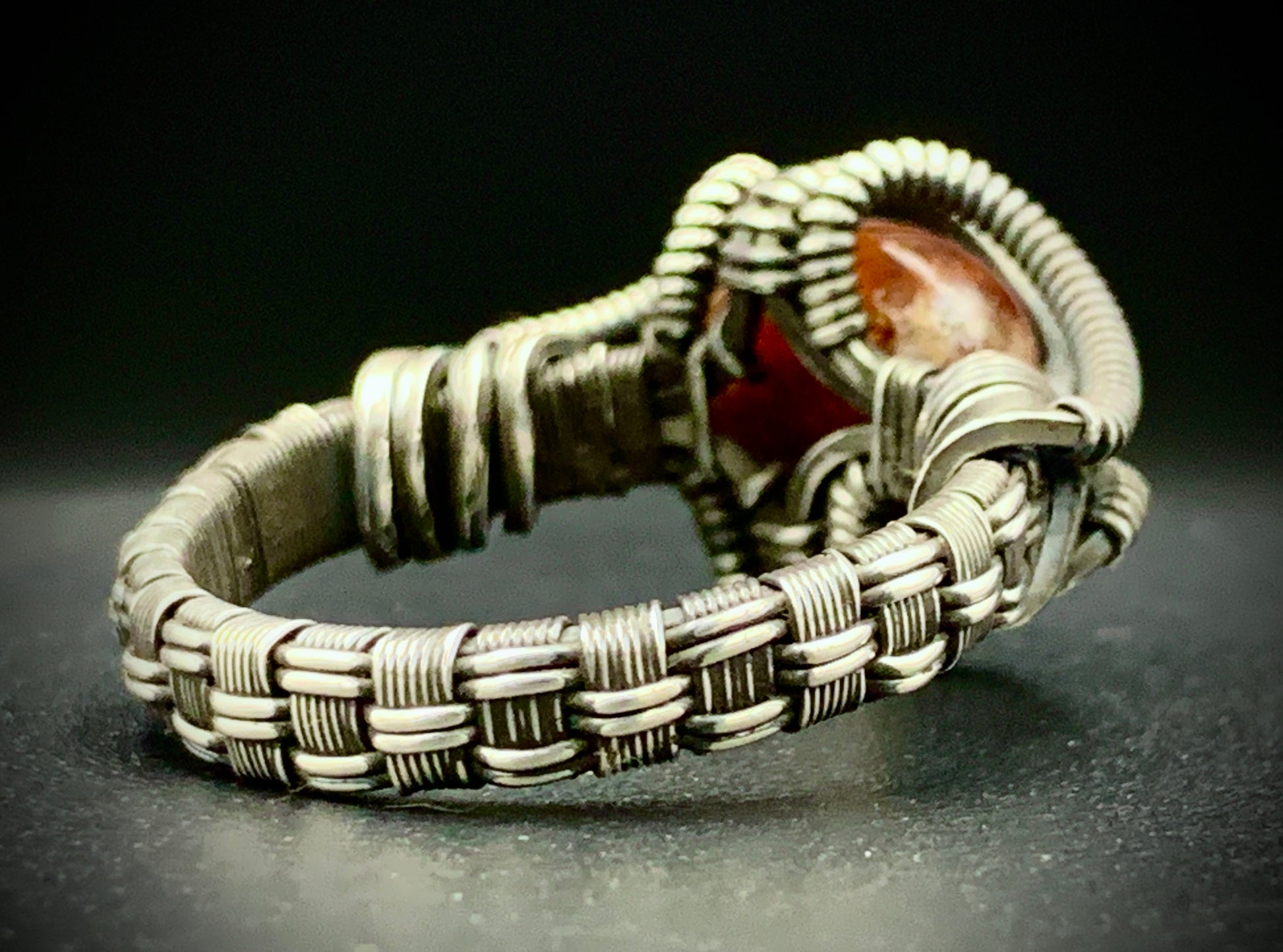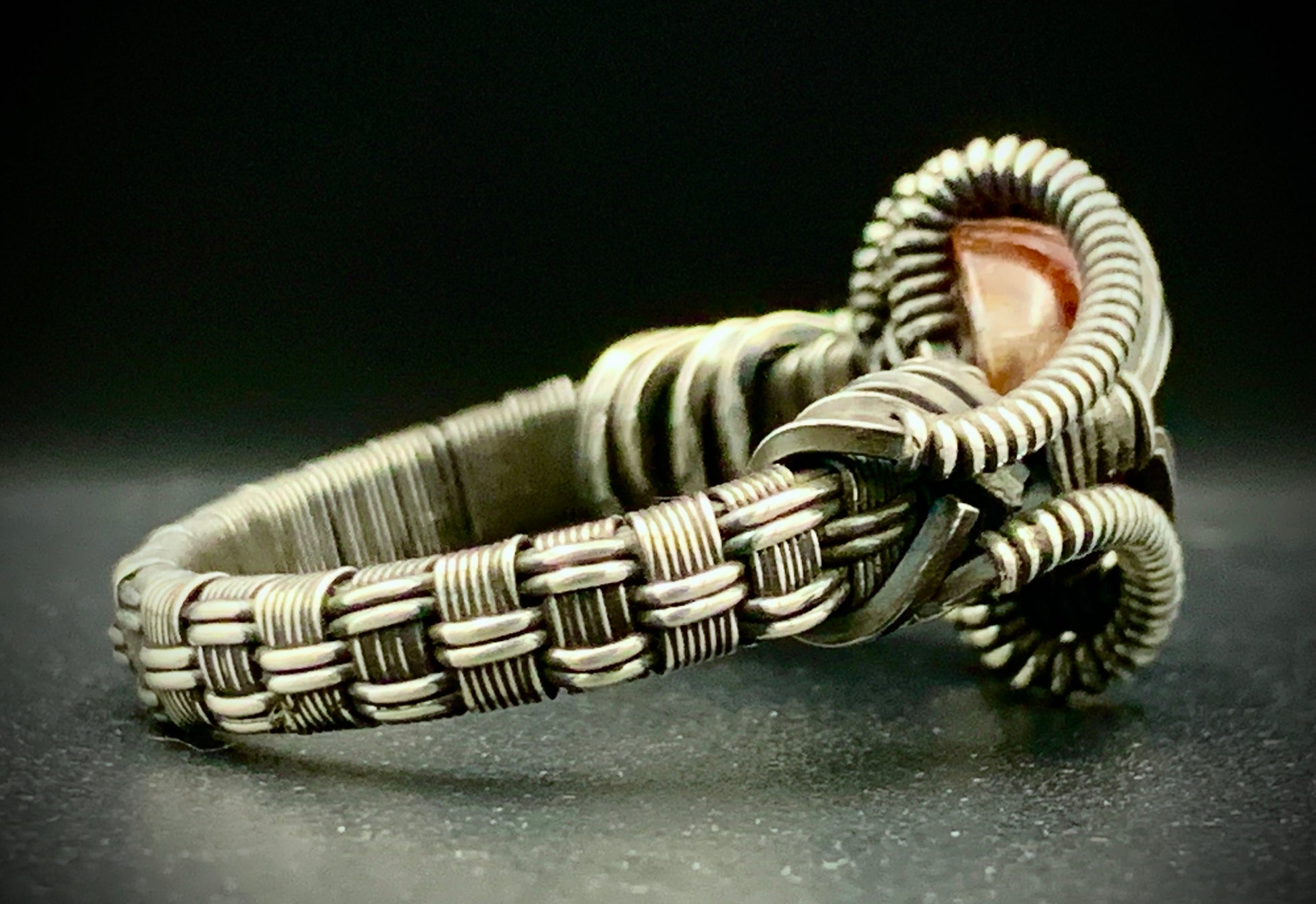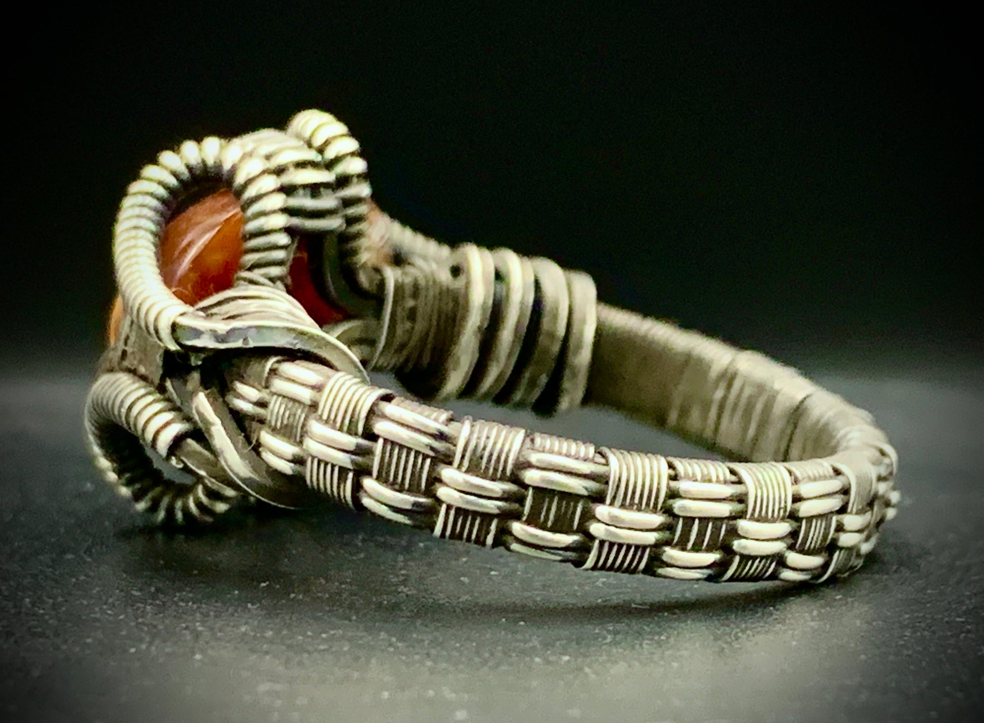 This one-of-a-kind ring is hand-wrapped with sterling silver wire, featuring a gorgeous piece of polished fire agate woven into the braided design. Includes a unique, intricate weave-patterned band! Crafted with love in my 100% solar-powered off-grid silversmithing studio. Size 13