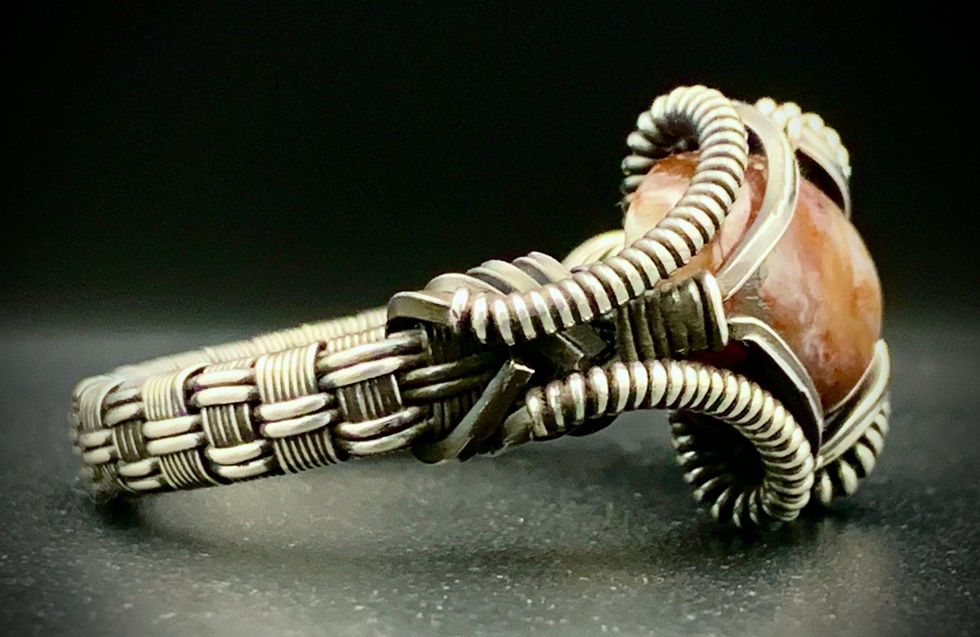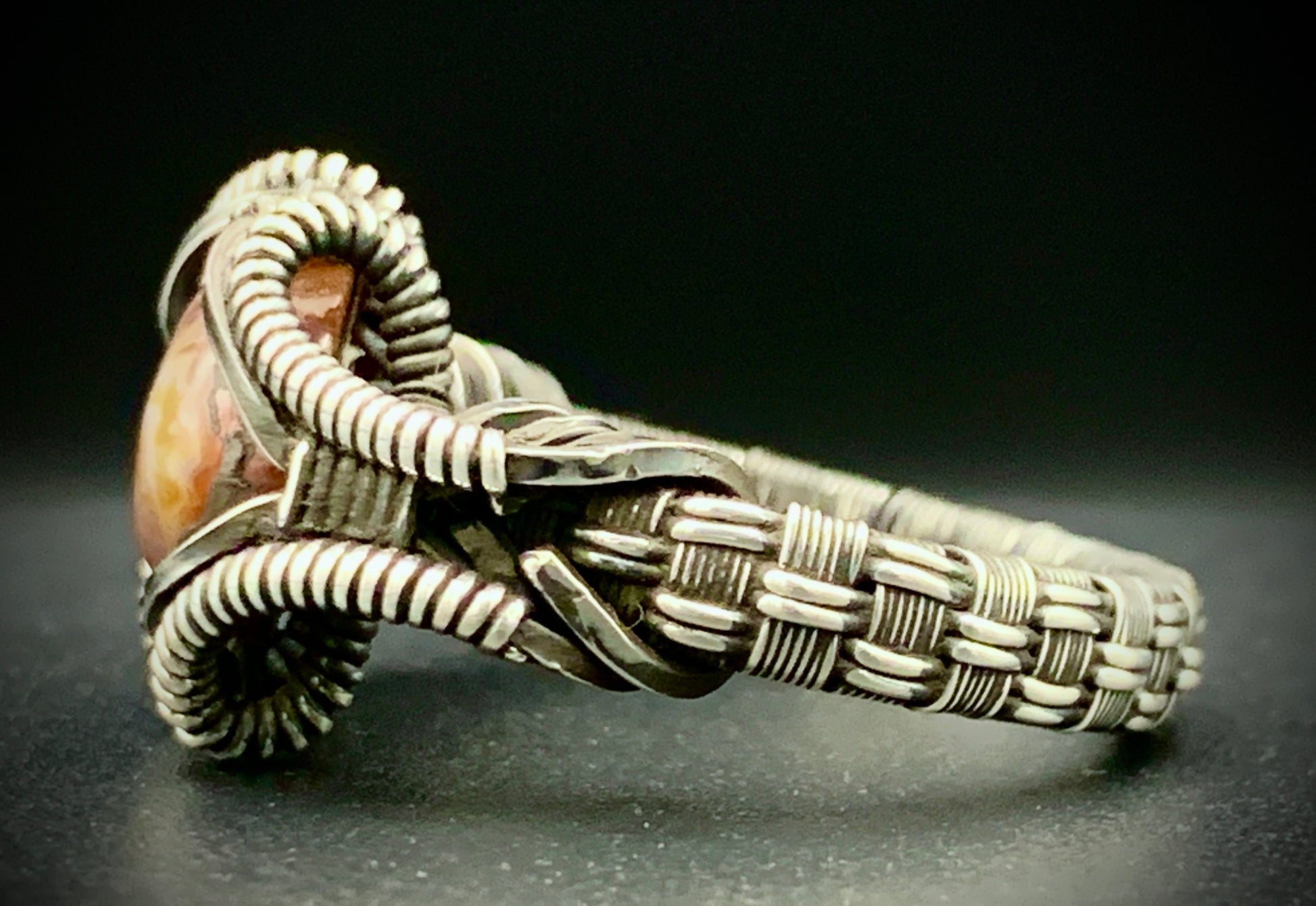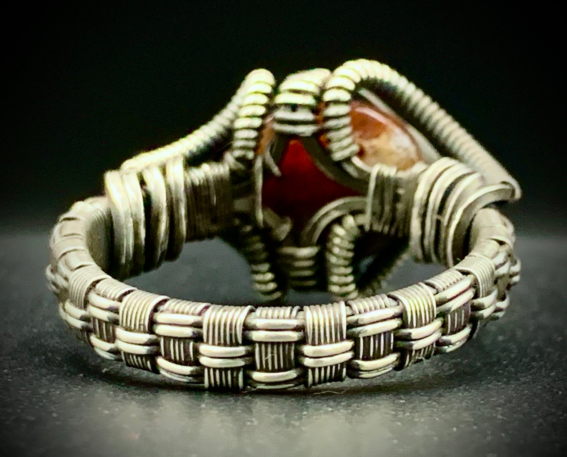 This one-of-a-kind ring is hand-wrapped with sterling silver wire, featuring a gorgeous piece of polished fire agate woven into the braided design. Includes a unique, intricate weave-patterned band! Crafted with love in my 100% solar-powered off-grid silversmithing studio. Size 13