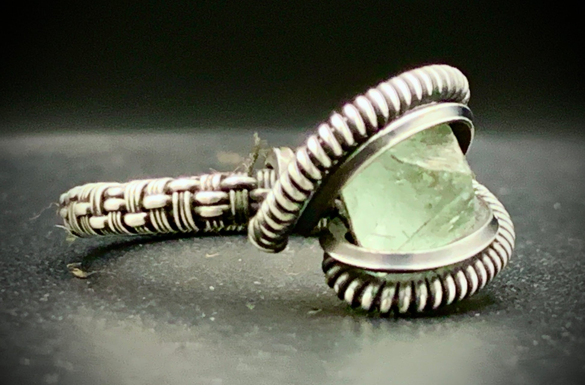 This one-of-a-kind ring is hand-wrapped with sterling silver wire, featuring a gorgeous piece of raw fluorite woven into the braided design. Includes a unique, intricate weave-patterned band! Crafted with love in my 100% solar-powered off-grid silversmithing studio. Size 8