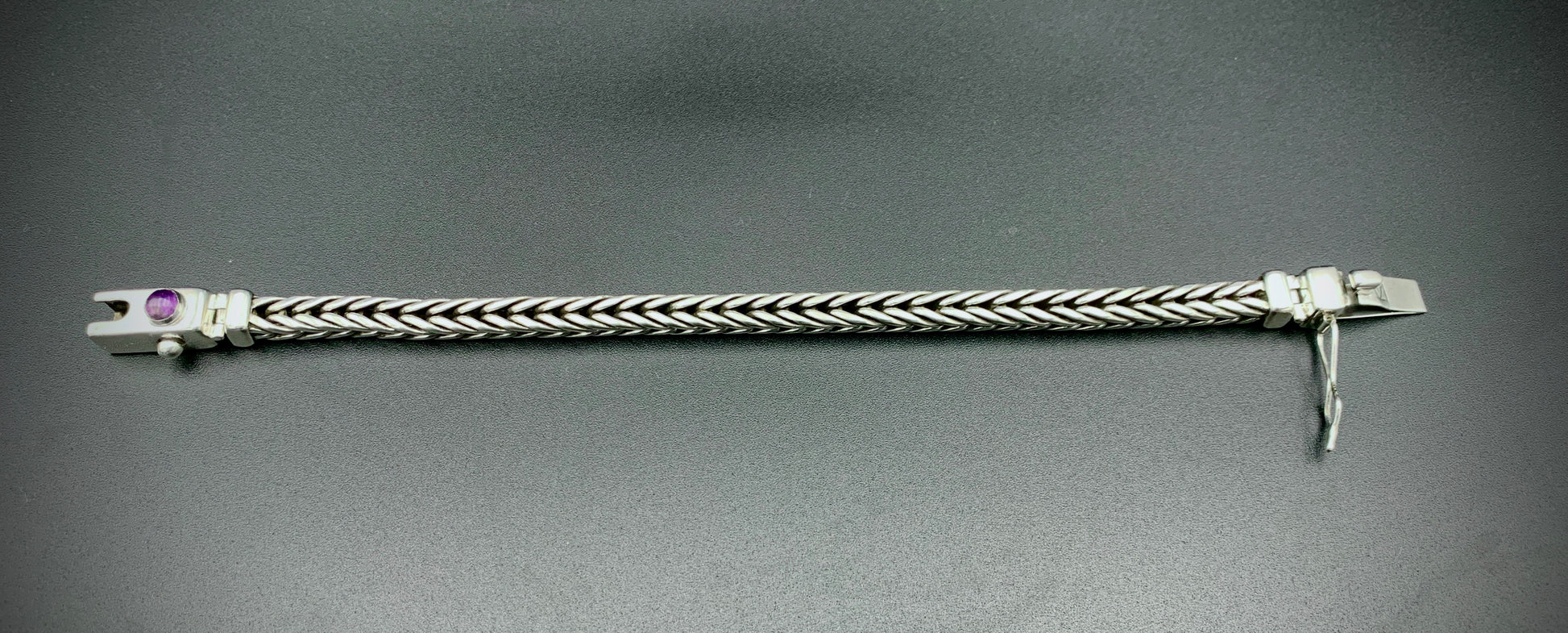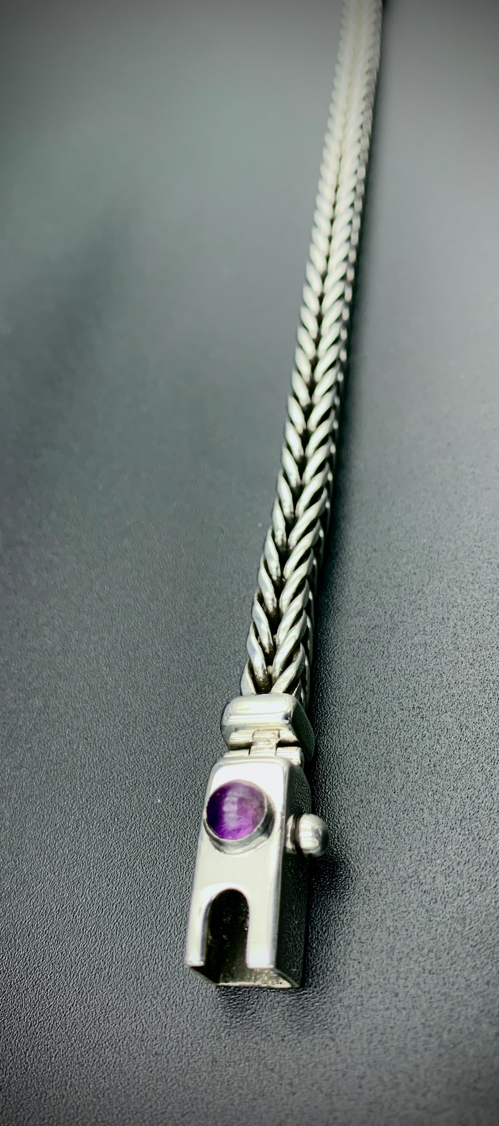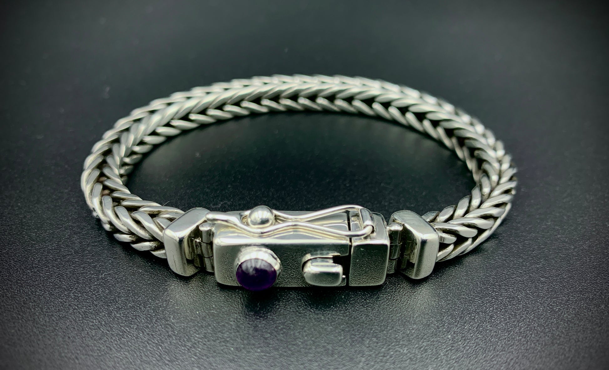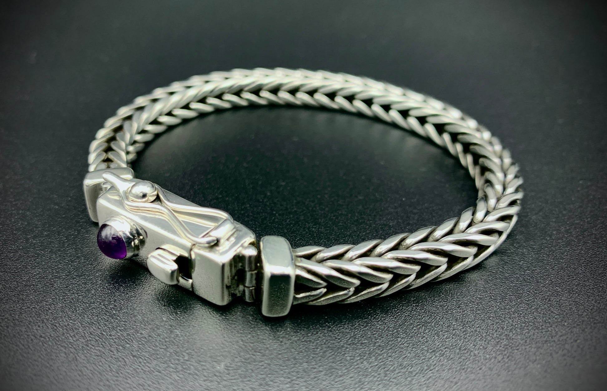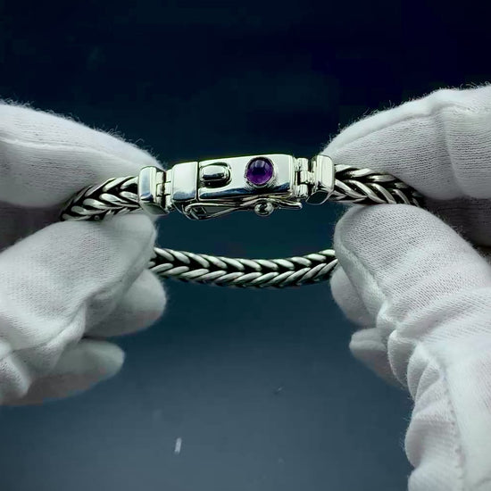 Handmade foxtail chain bracelet crafted from solid sterling silver. All wire and sheet material used in this piece was custom-crafted from hand-poured molten silver in my solar-powered, off-grid studio, and meticulously assembled into a timeless work of art that is made to last for many generations. Handmade box clasp with safety catch, a vibrant amethyst cabochon setting, and handmade hinges to allow the clasp to perfectly fit the form of your wrist. Step into the timeless old-world beauty and strength of the foxtail chain with this bold, elegant bracelet!
