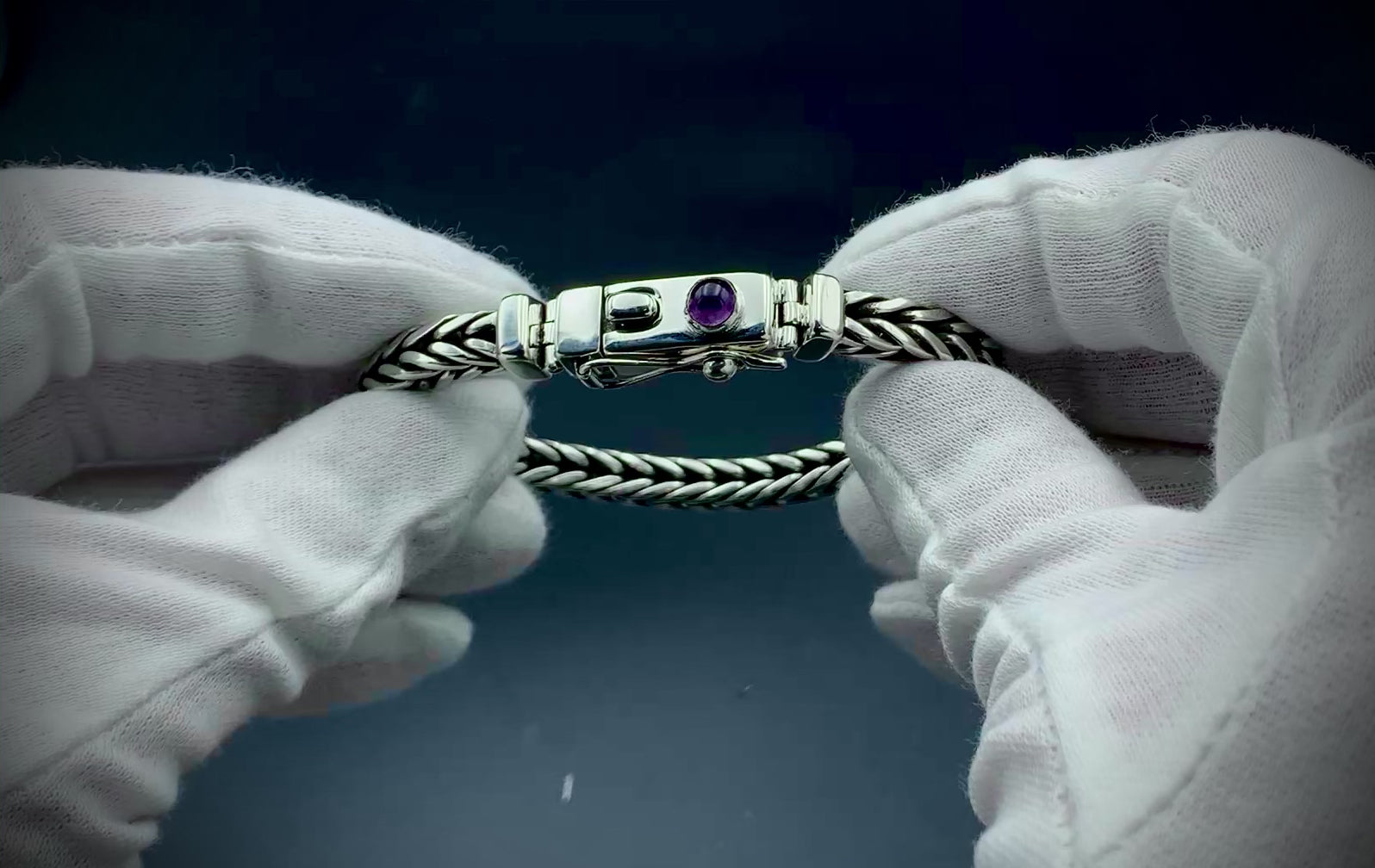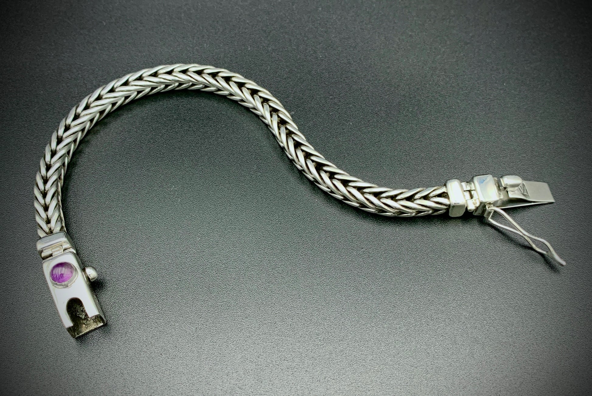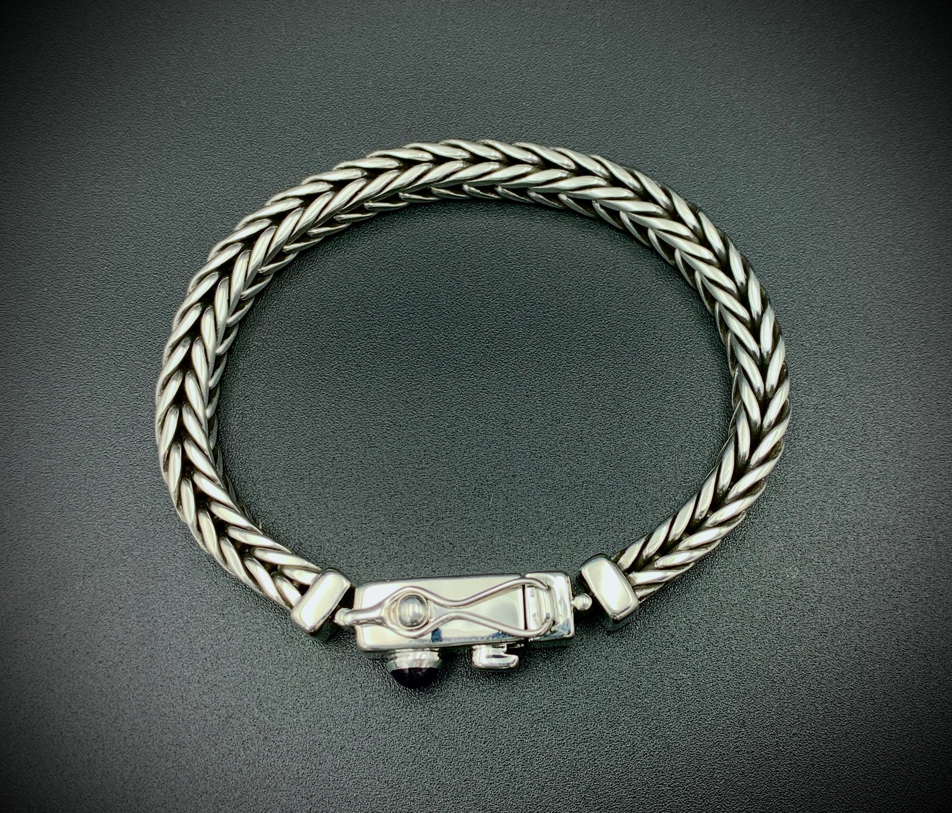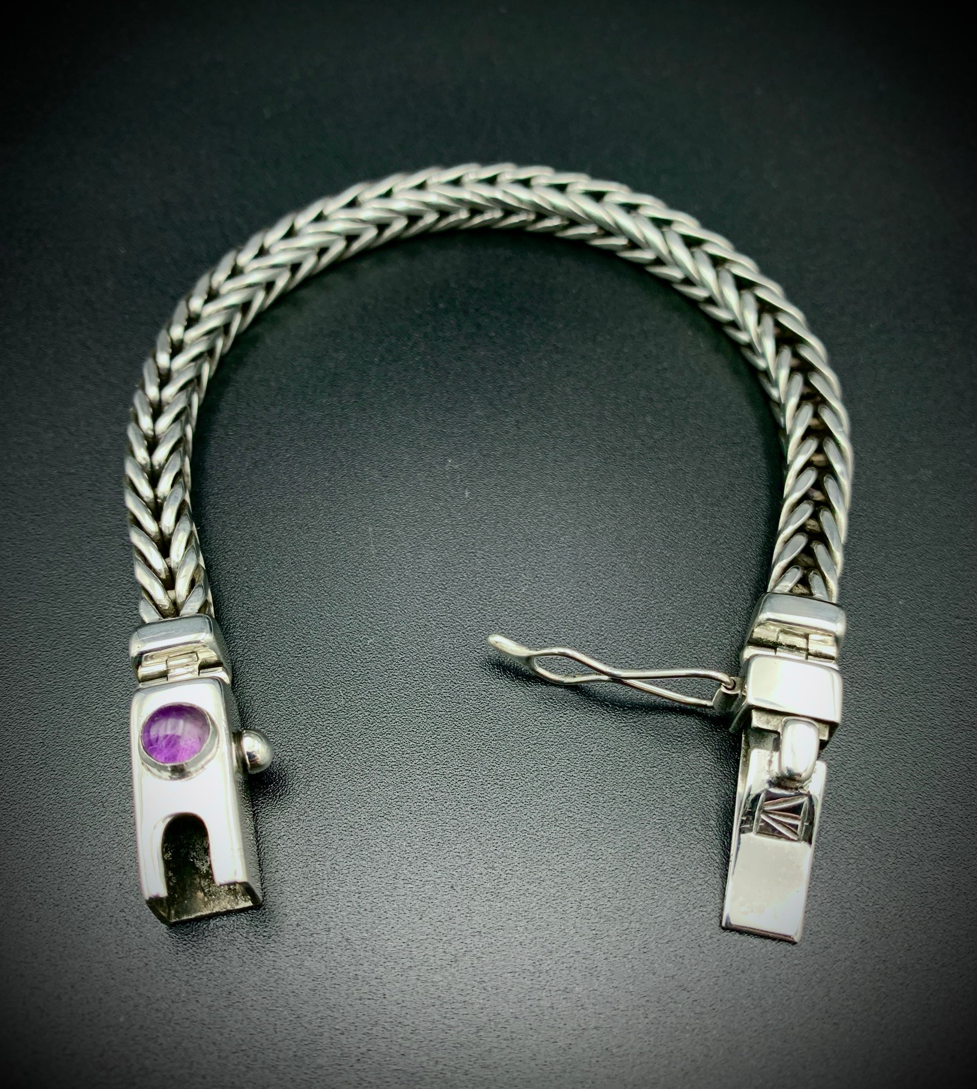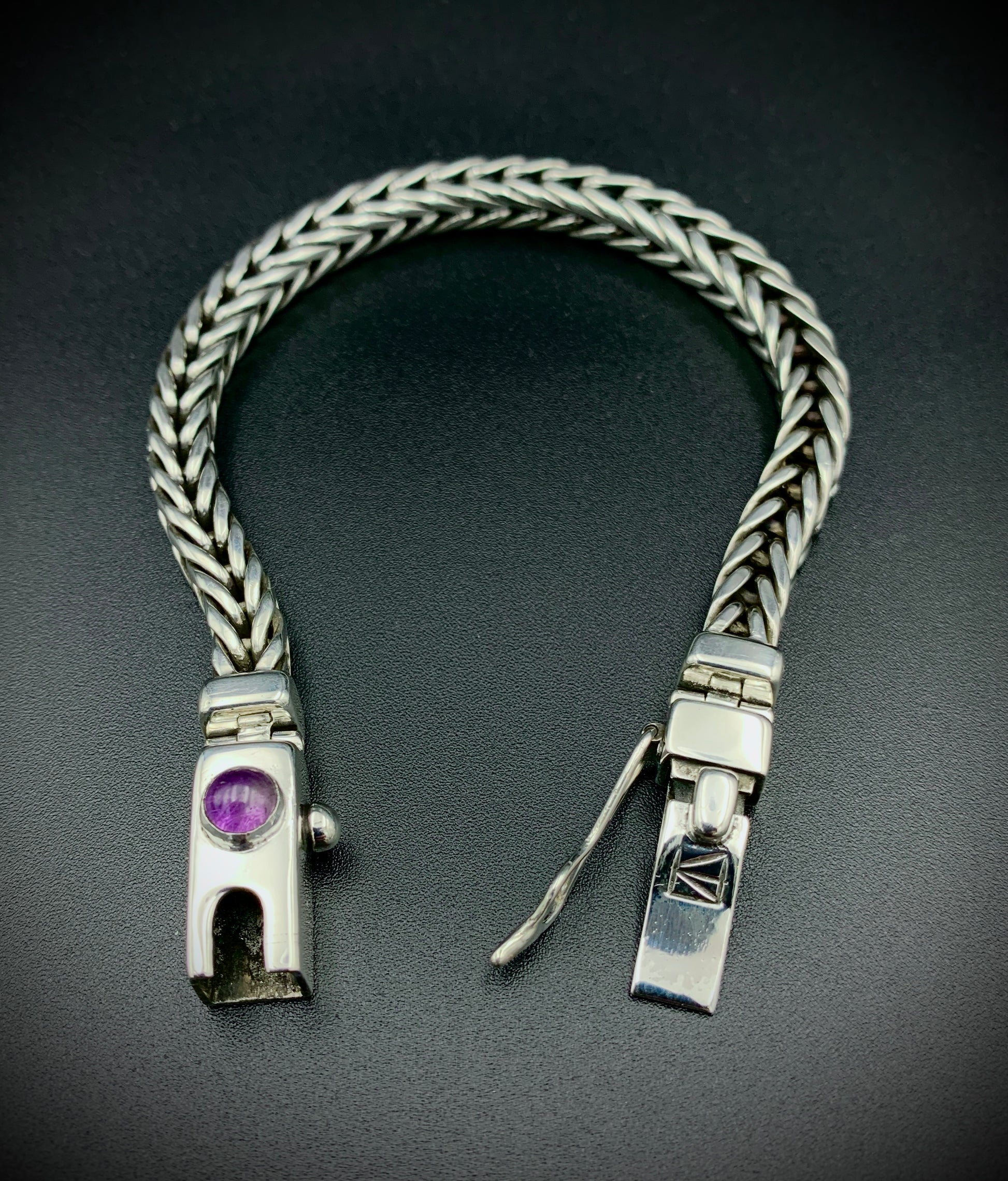 Handmade foxtail chain bracelet crafted from solid sterling silver. All wire and sheet material used in this piece was custom-crafted from hand-poured molten silver in my solar-powered, off-grid studio, and meticulously assembled into a timeless work of art that is made to last for many generations. Handmade box clasp with safety catch, a vibrant amethyst cabochon setting, and handmade hinges to allow the clasp to perfectly fit the form of your wrist. Step into the timeless old-world beauty and strength of the foxtail chain with this bold, elegant bracelet!