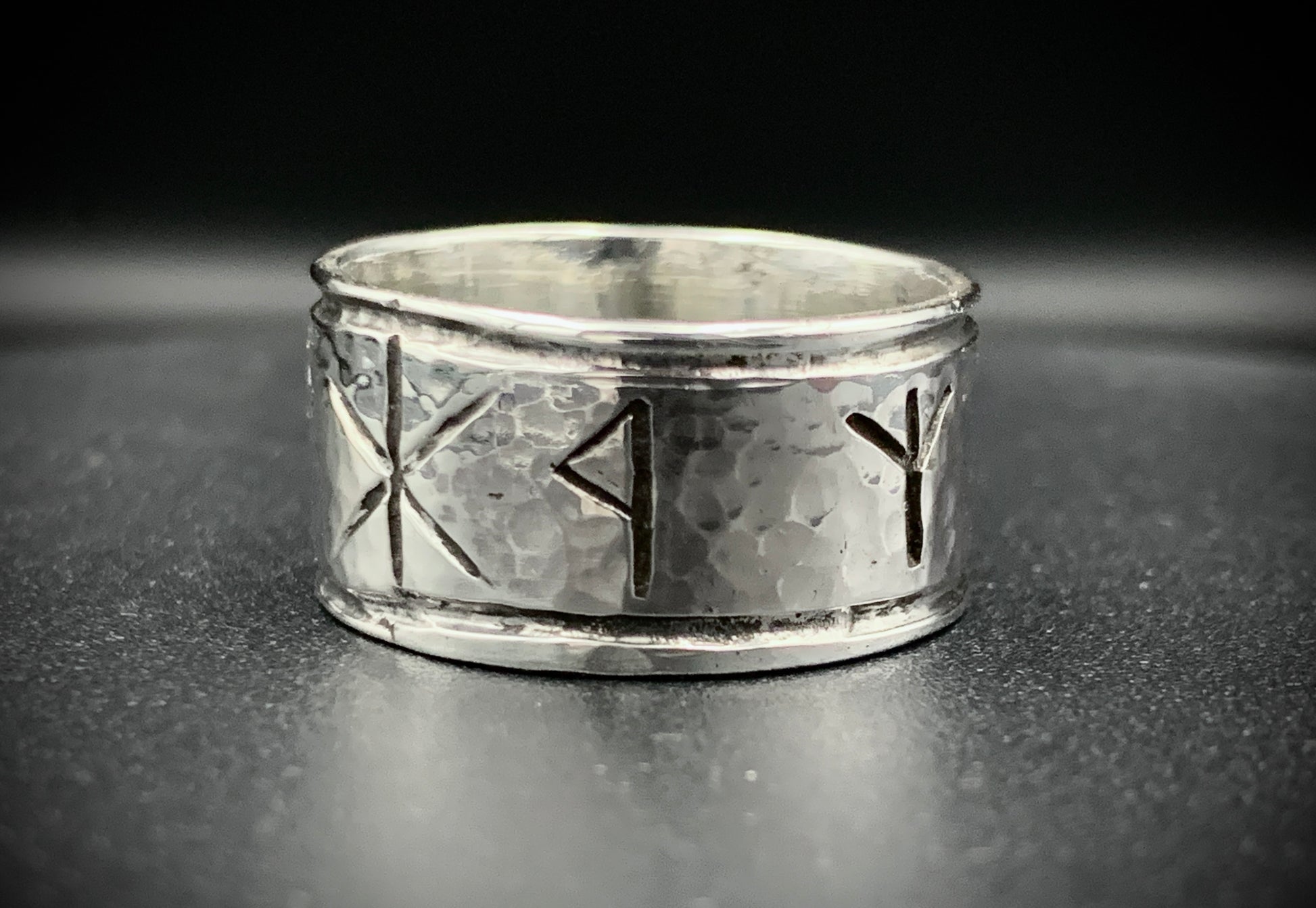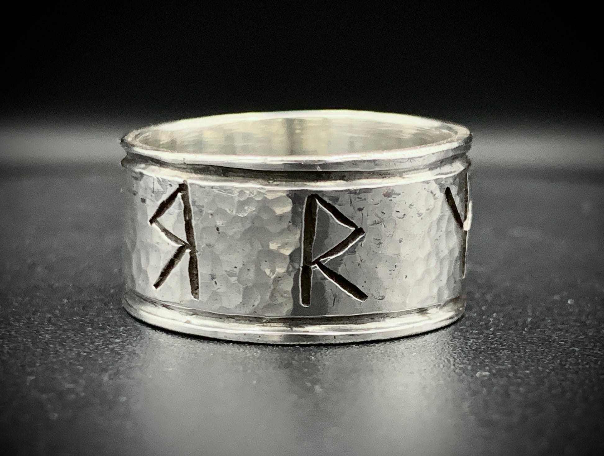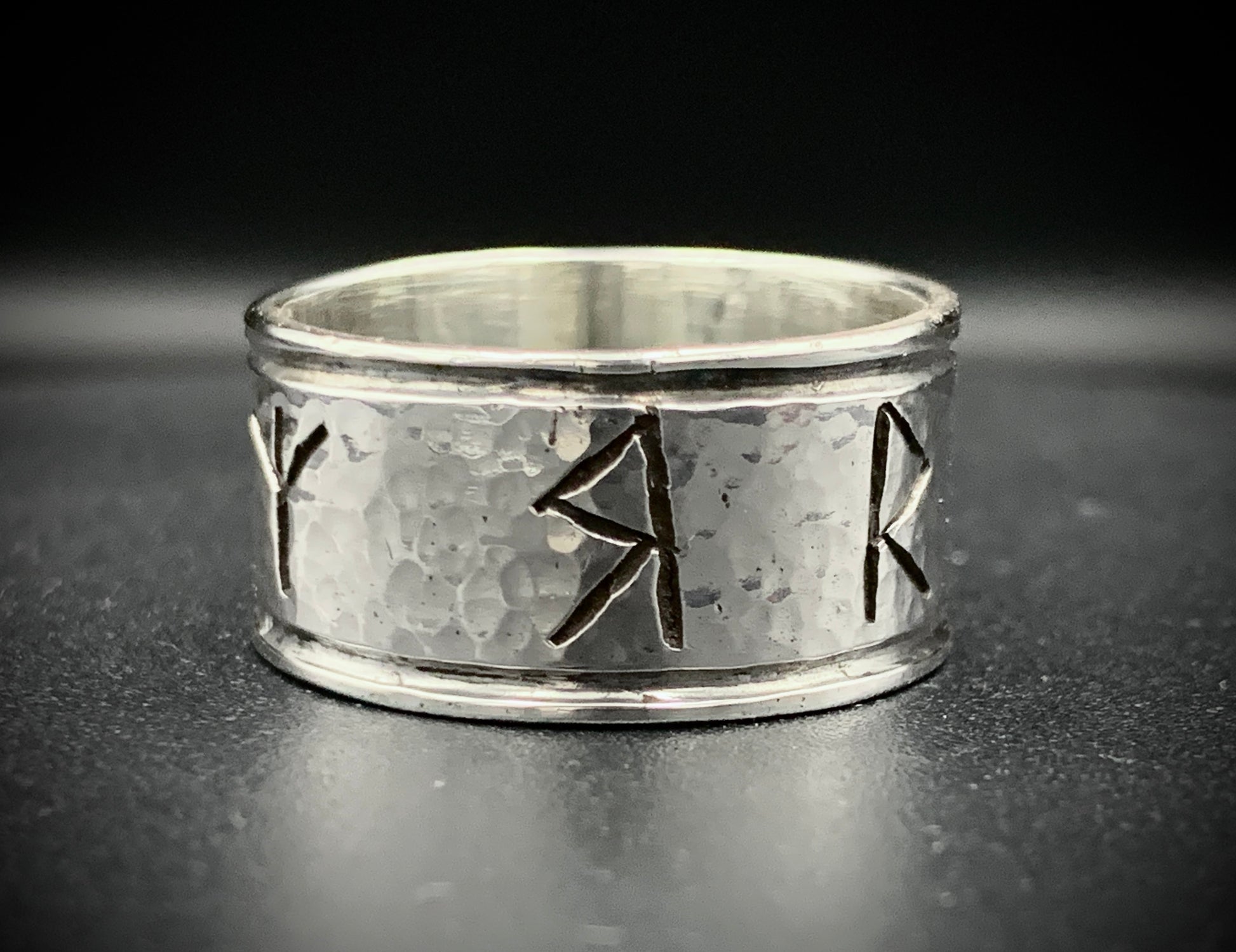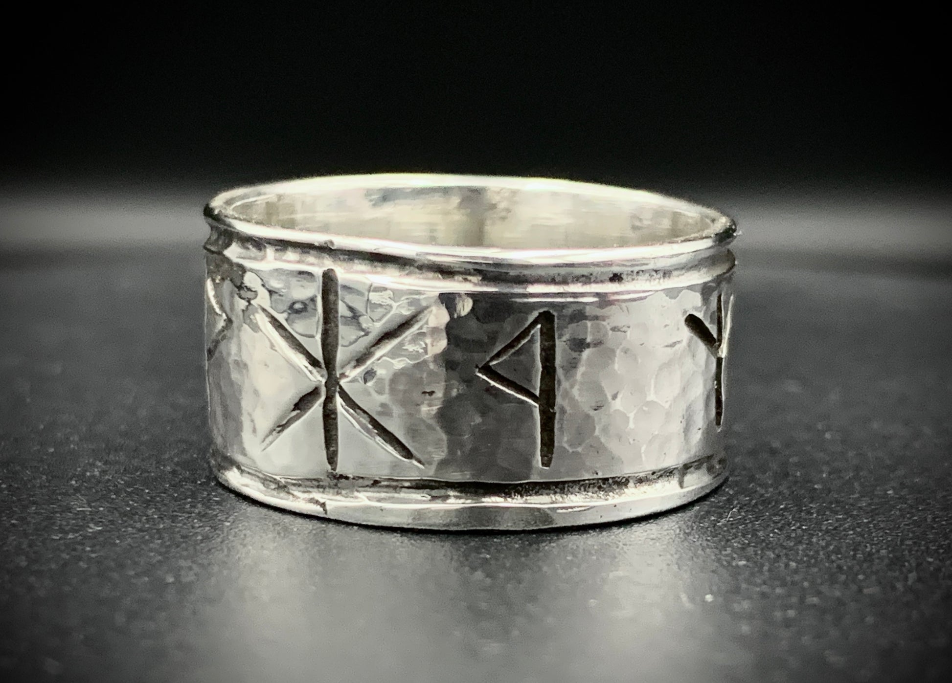 This one-of-a-kind ring is handmade from solid sterling silver, custom-crafted into a timeless piece of art that is made to last many generations. This design incorporates hand-stamped Viking runes into a hammered texture band to create a powerful protective ring. All sheet material used in this piece was custom-crafted from hand-poured molten silver in my solar-powered, off-grid studio.