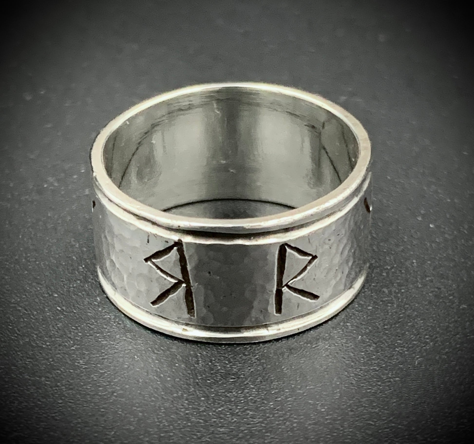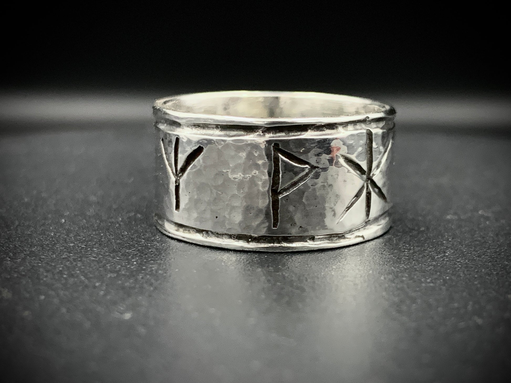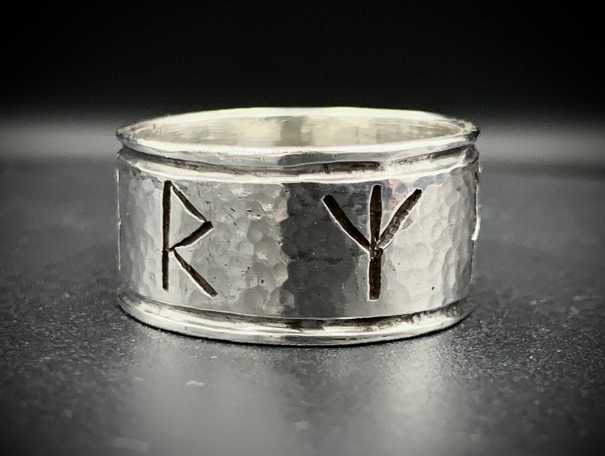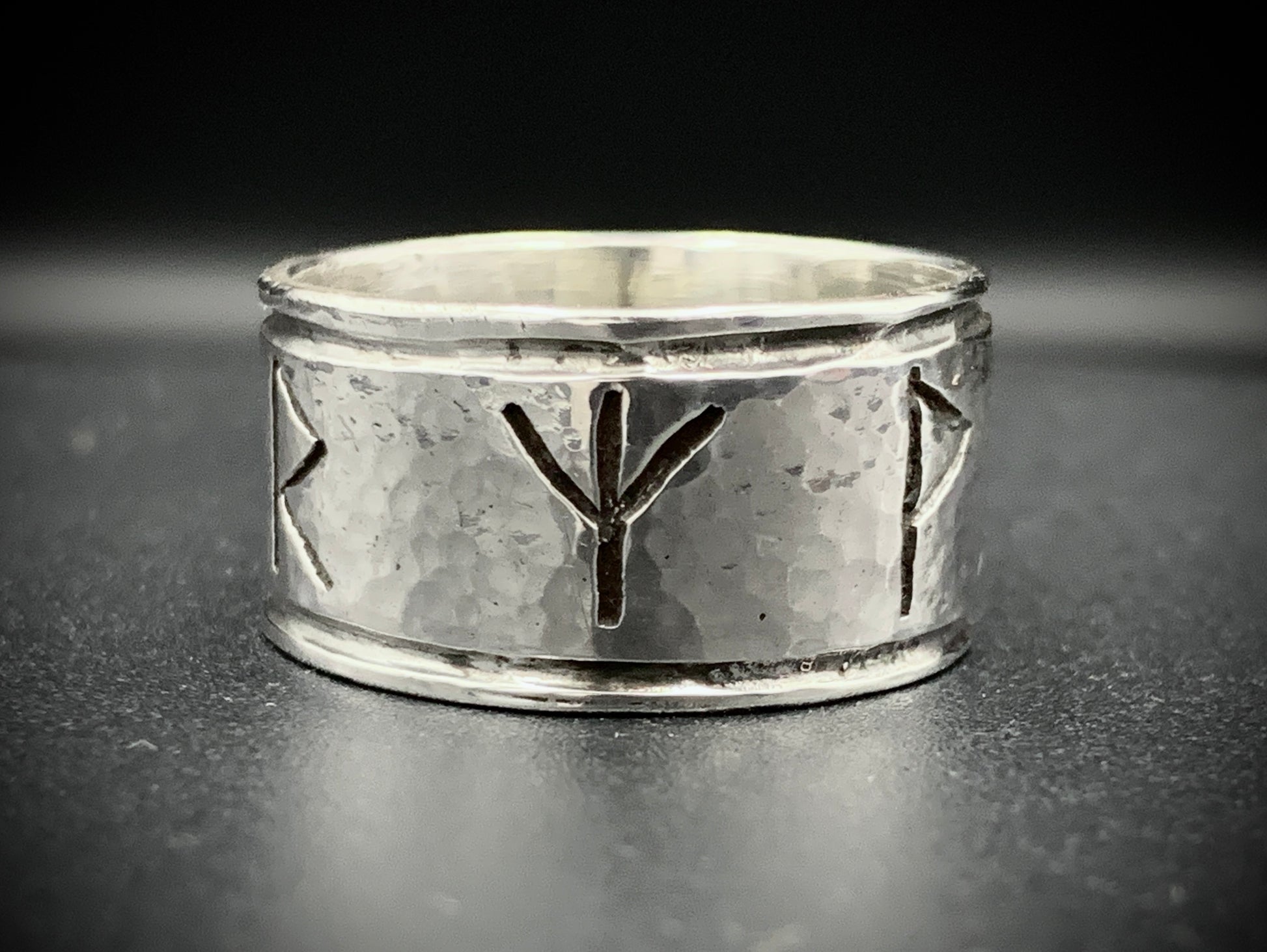 This one-of-a-kind ring is handmade from solid sterling silver, custom-crafted into a timeless piece of art that is made to last many generations. This design incorporates hand-stamped Viking runes into a hammered texture band to create a powerful protective ring. All sheet material used in this piece was custom-crafted from hand-poured molten silver in my solar-powered, off-grid studio.