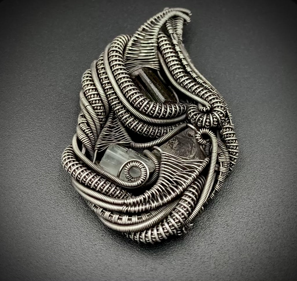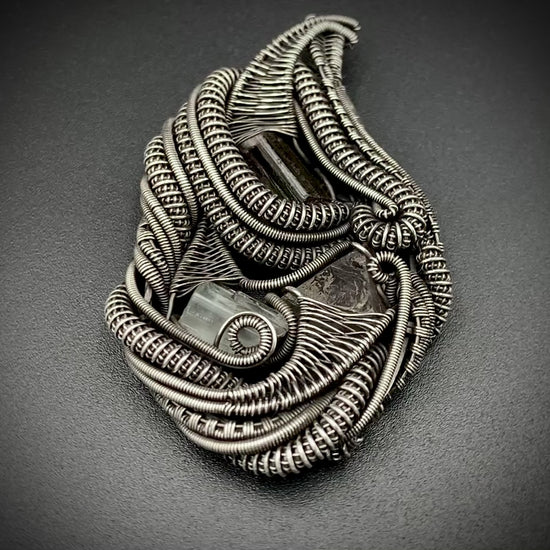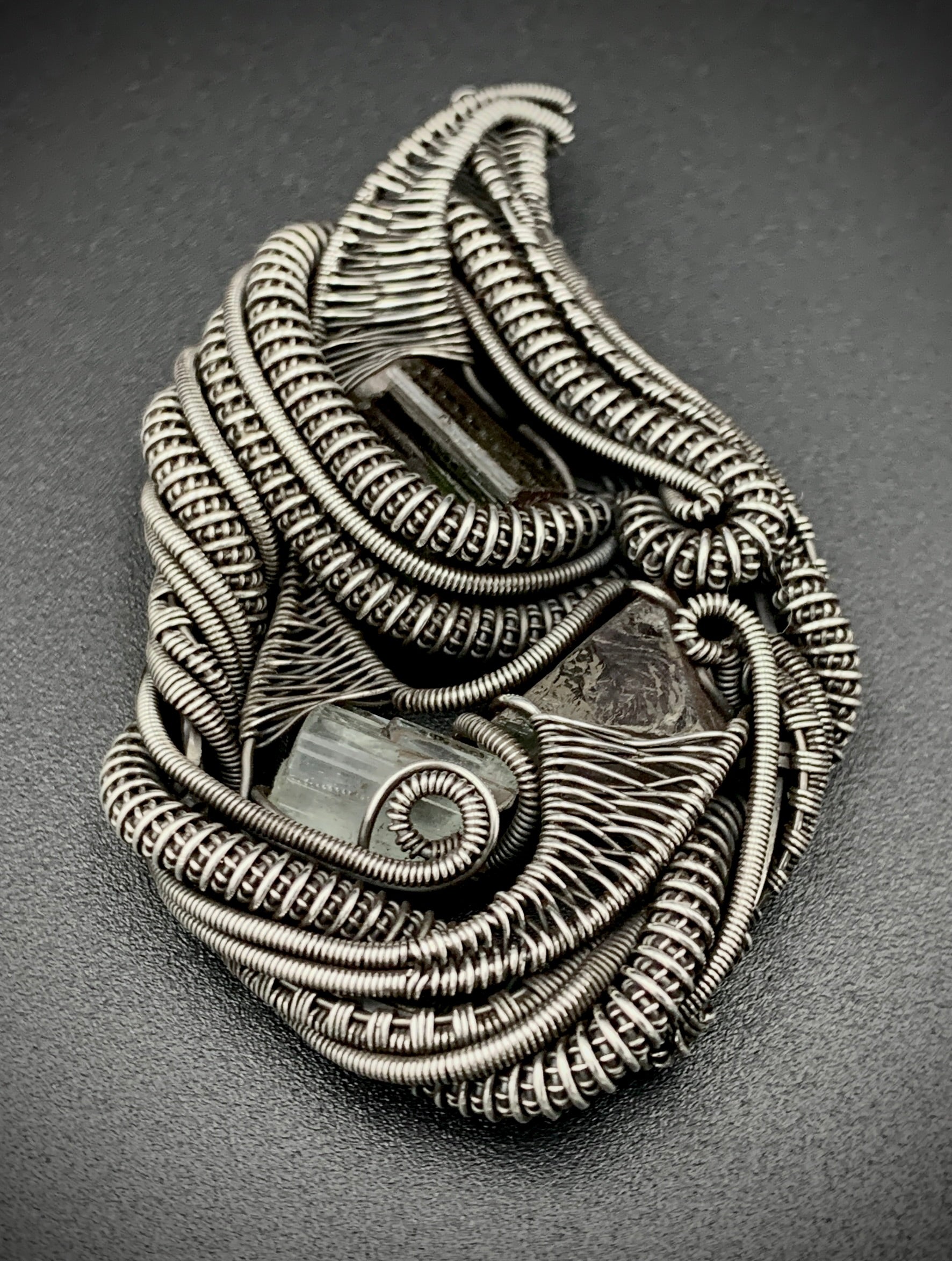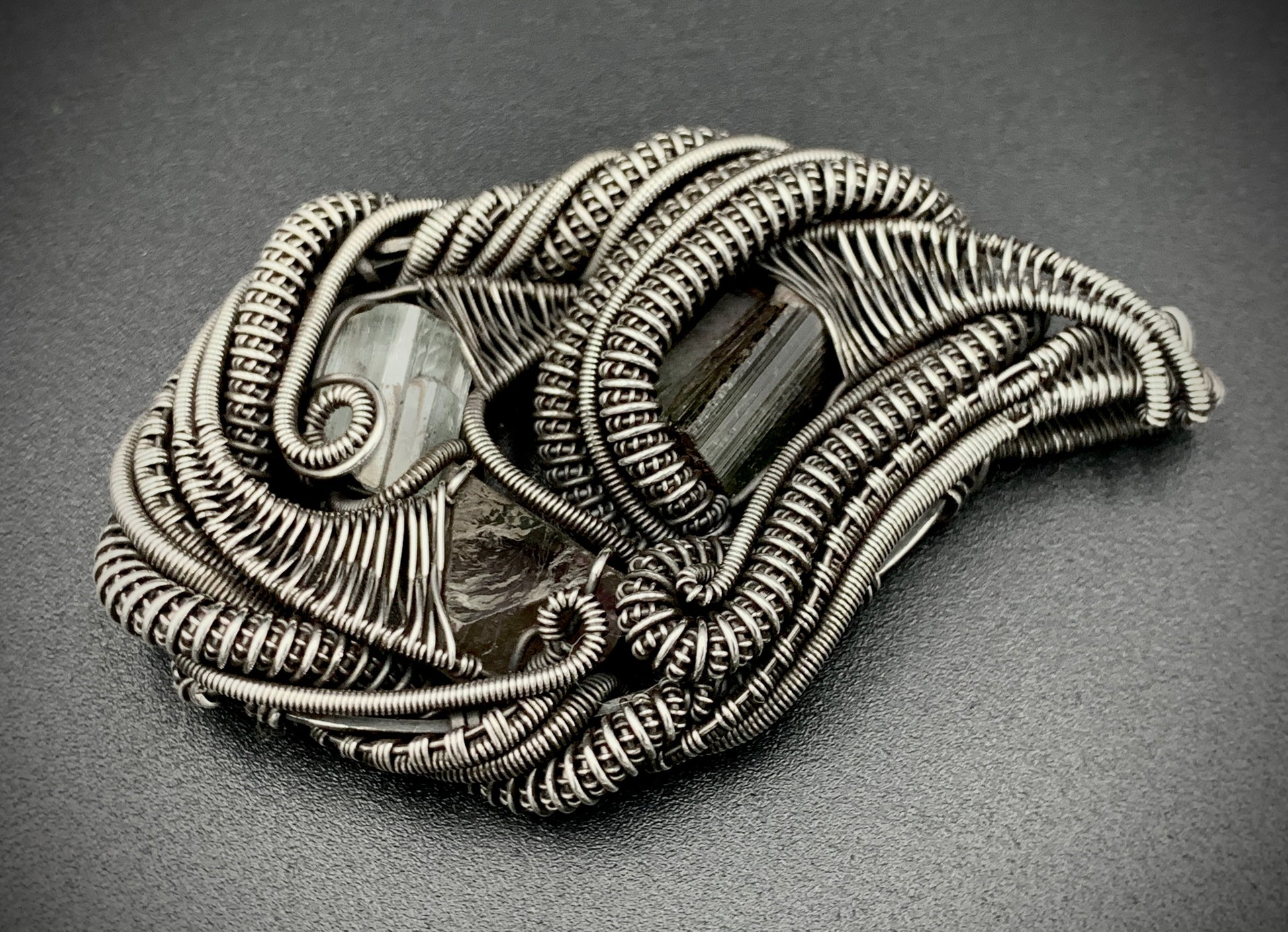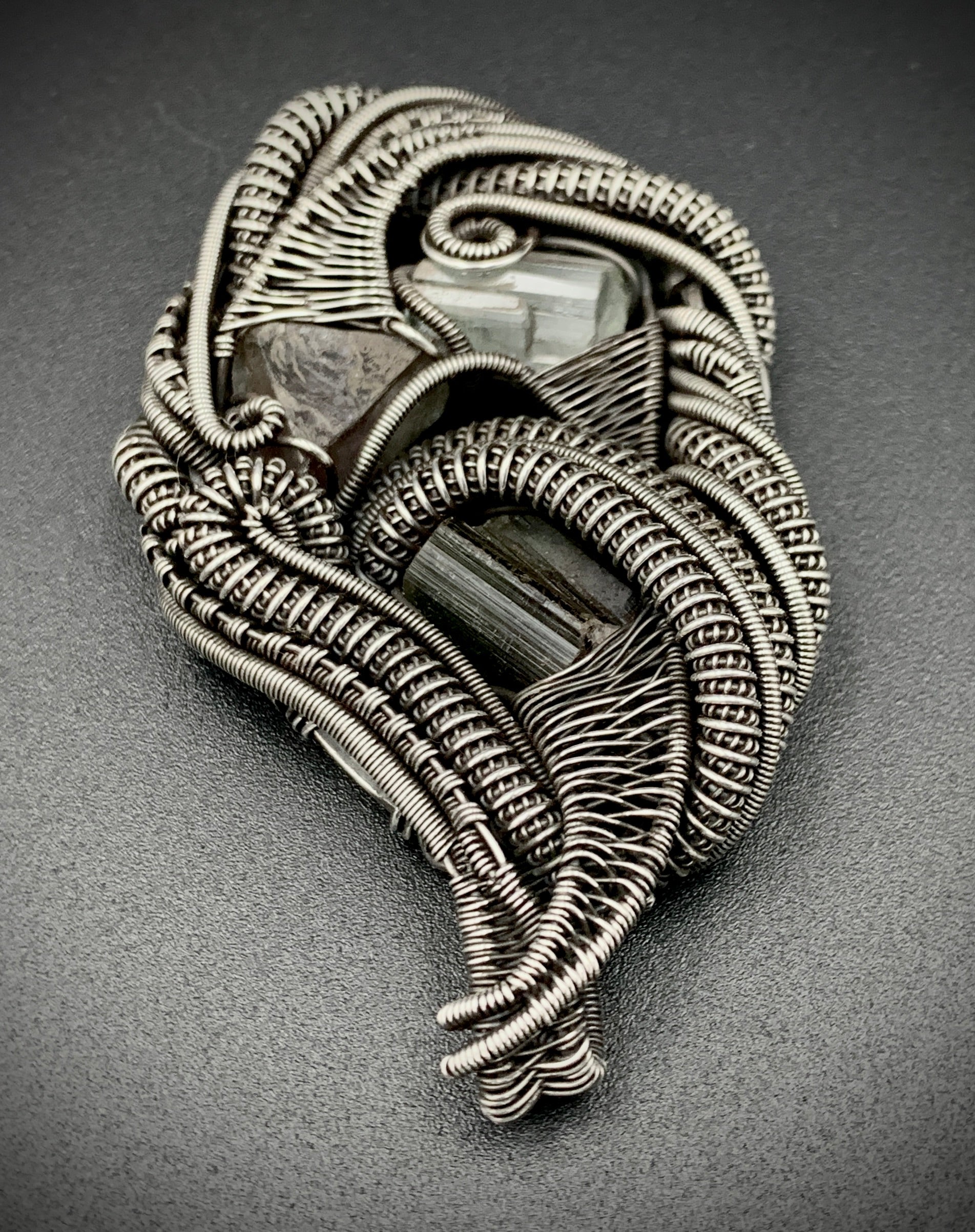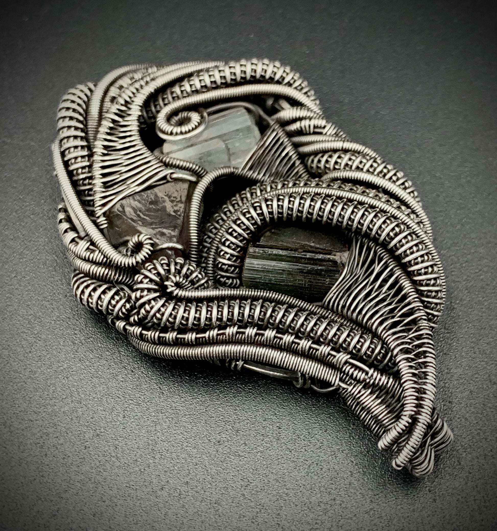 This one-of-a-kind pendant is hand-wrapped with sterling silver wire, featuring a gorgeous dark green tourmaline, a brilliant aquamarine, and a triangular fluorite woven into the braided design. Embrace your inner Bodhisattva with this powerful piece! Crafted with love in my 100% solar-powered off-grid silversmithing studio.