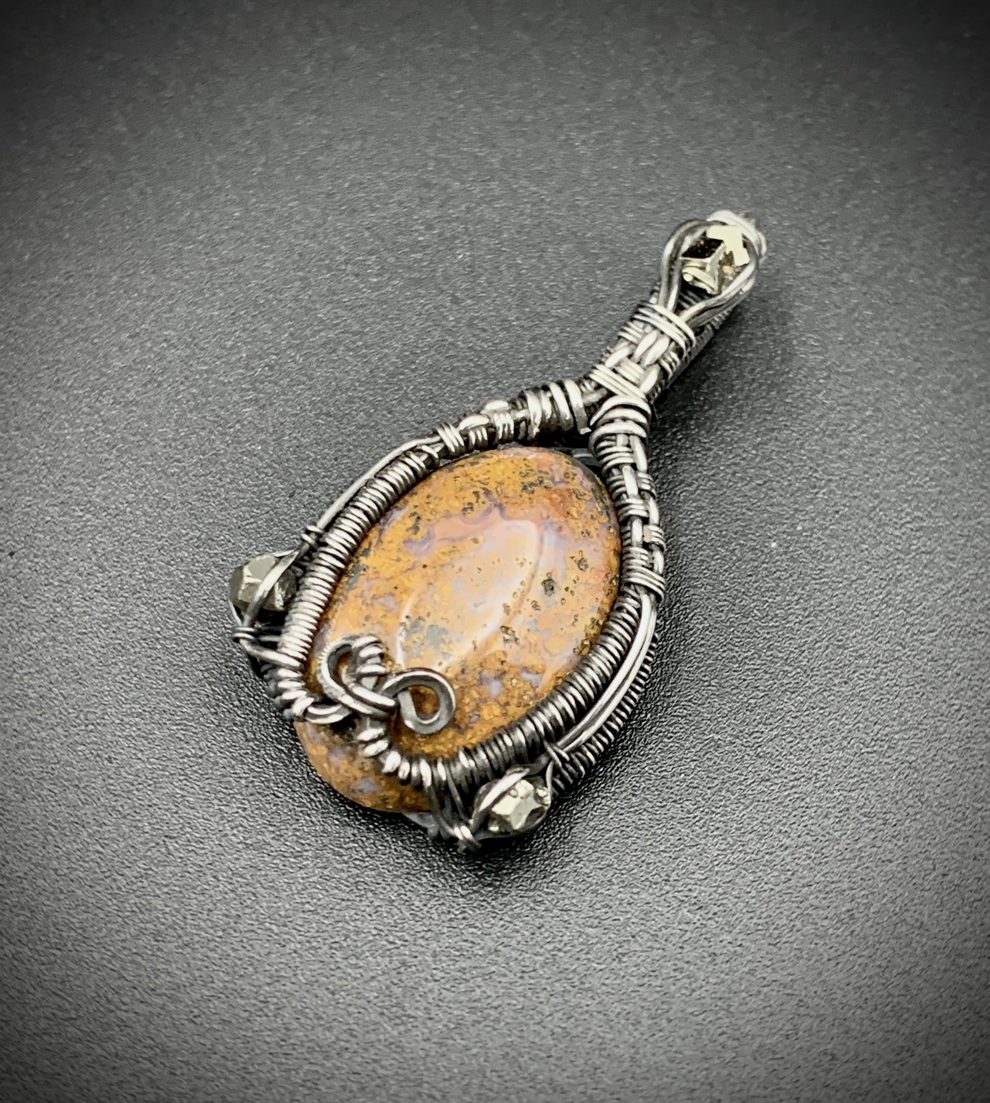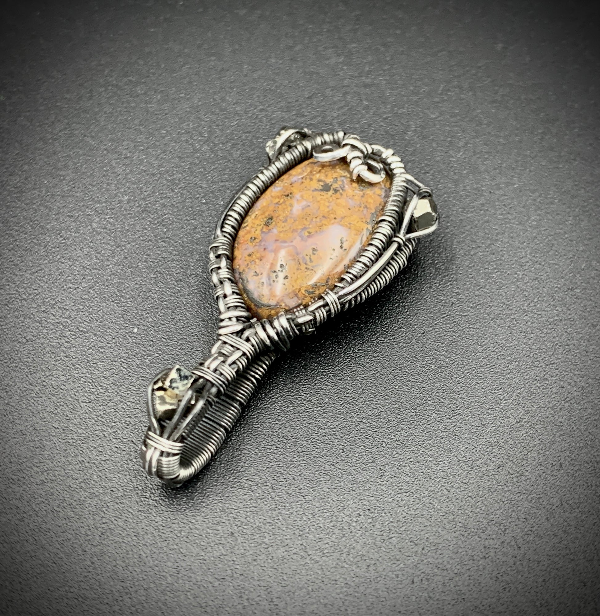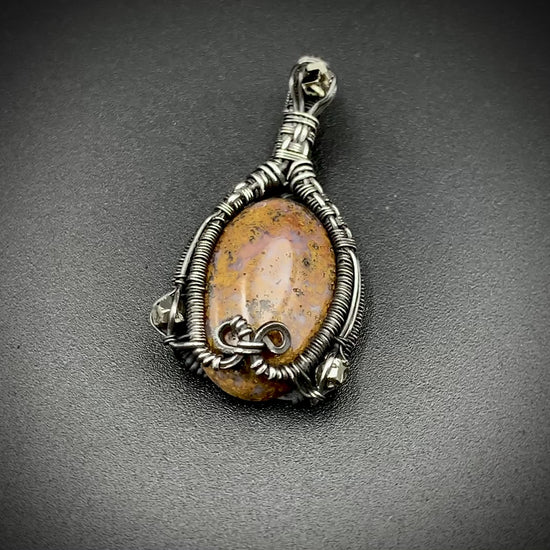 This one-of-a-kind pendant is hand-wrapped with sterling silver wire, featuring a jasper cabochon with three raw hematite chunks woven into the braided design. Step into your inner jester with this playful little piece! Crafted with love in my 100% solar powered off-grid silversmithing studio.