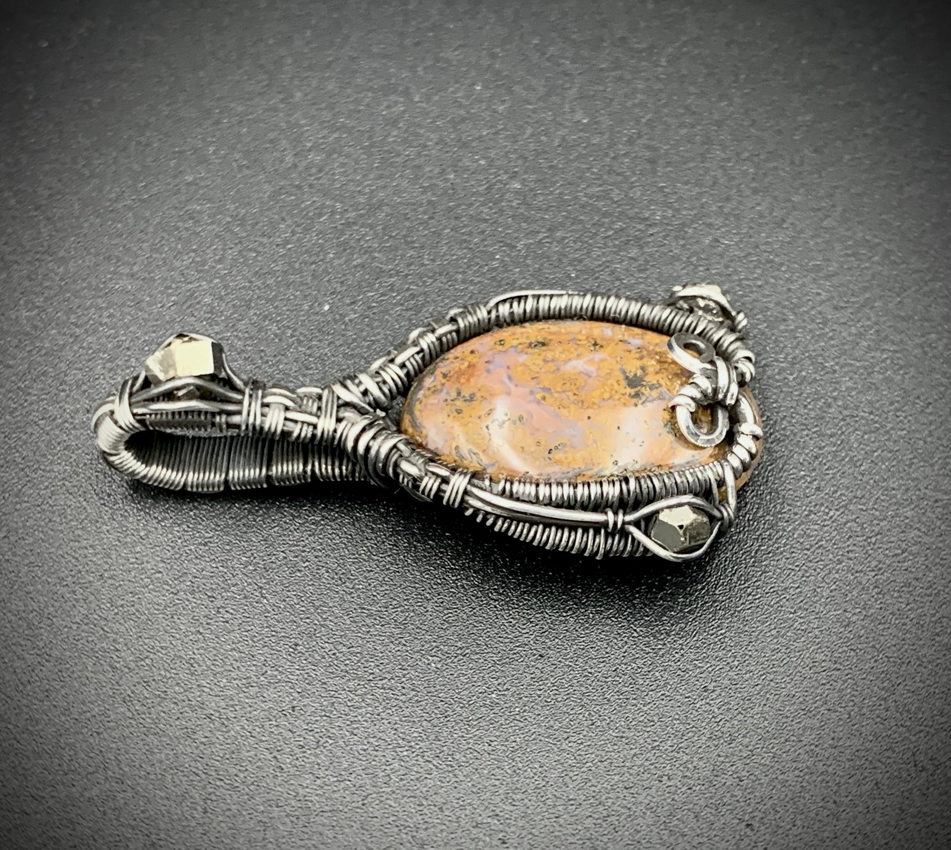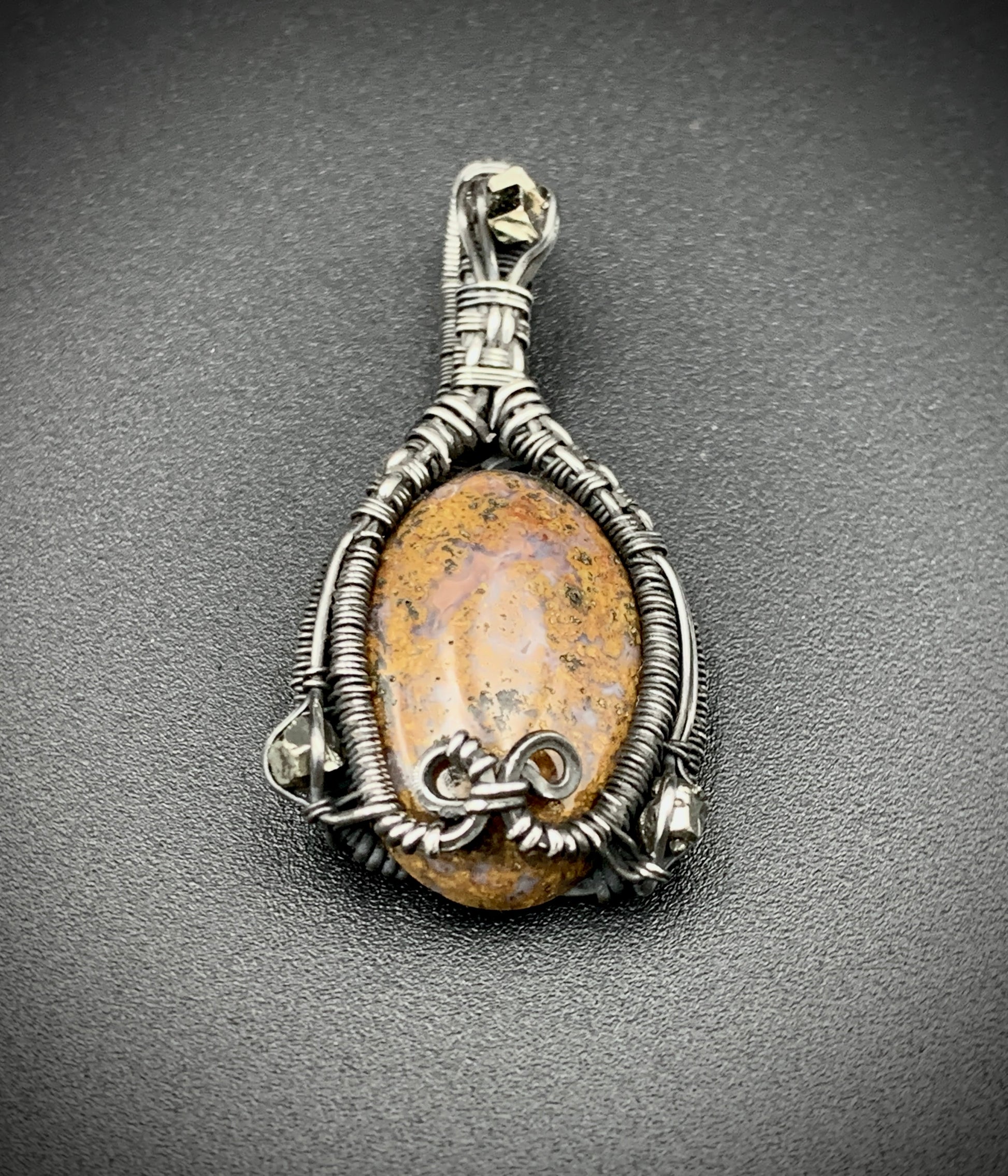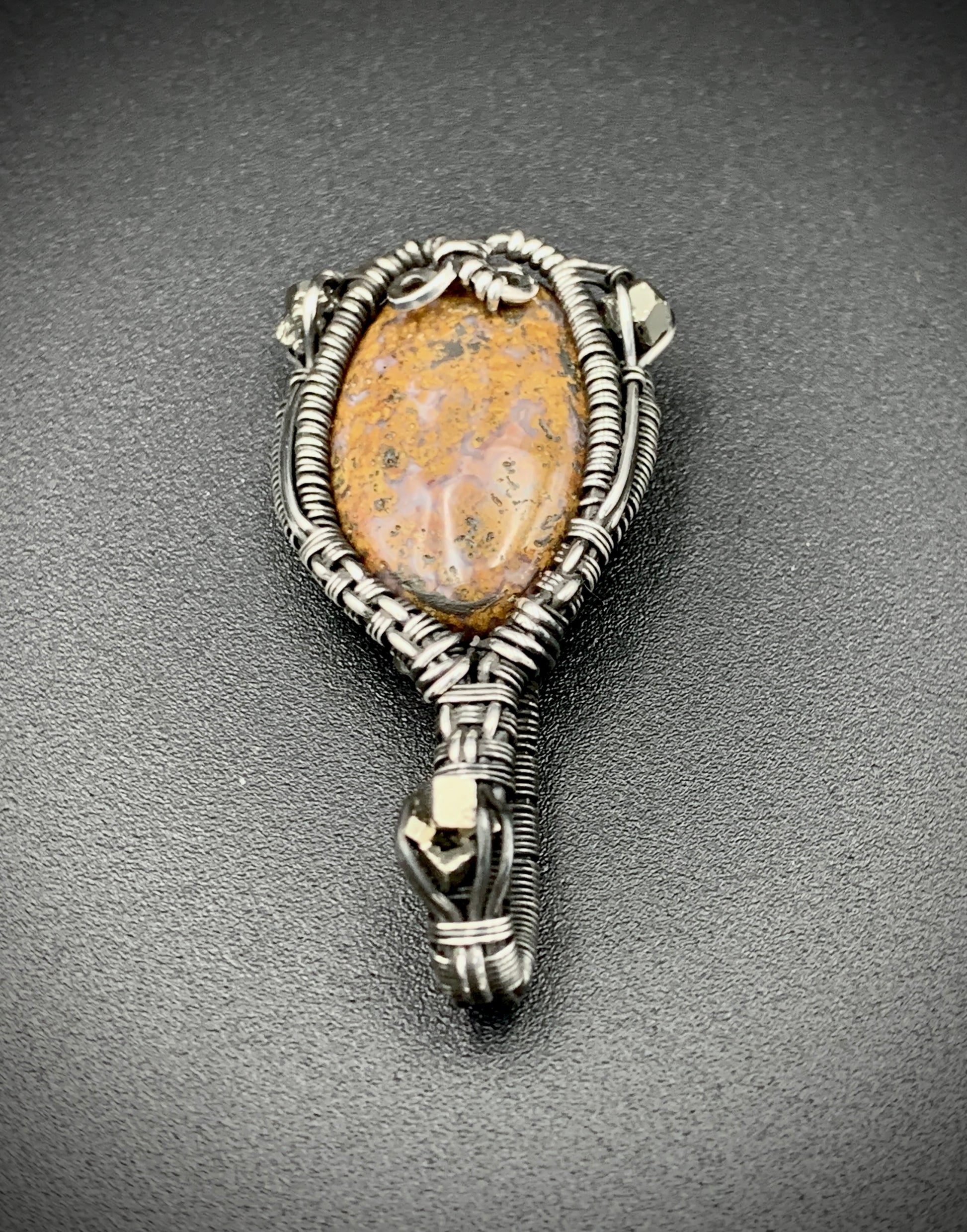 This one-of-a-kind pendant is hand-wrapped with sterling silver wire, featuring a jasper cabochon with three raw hematite chunks woven into the braided design. Step into your inner jester with this playful little piece! Crafted with love in my 100% solar powered off-grid silversmithing studio.