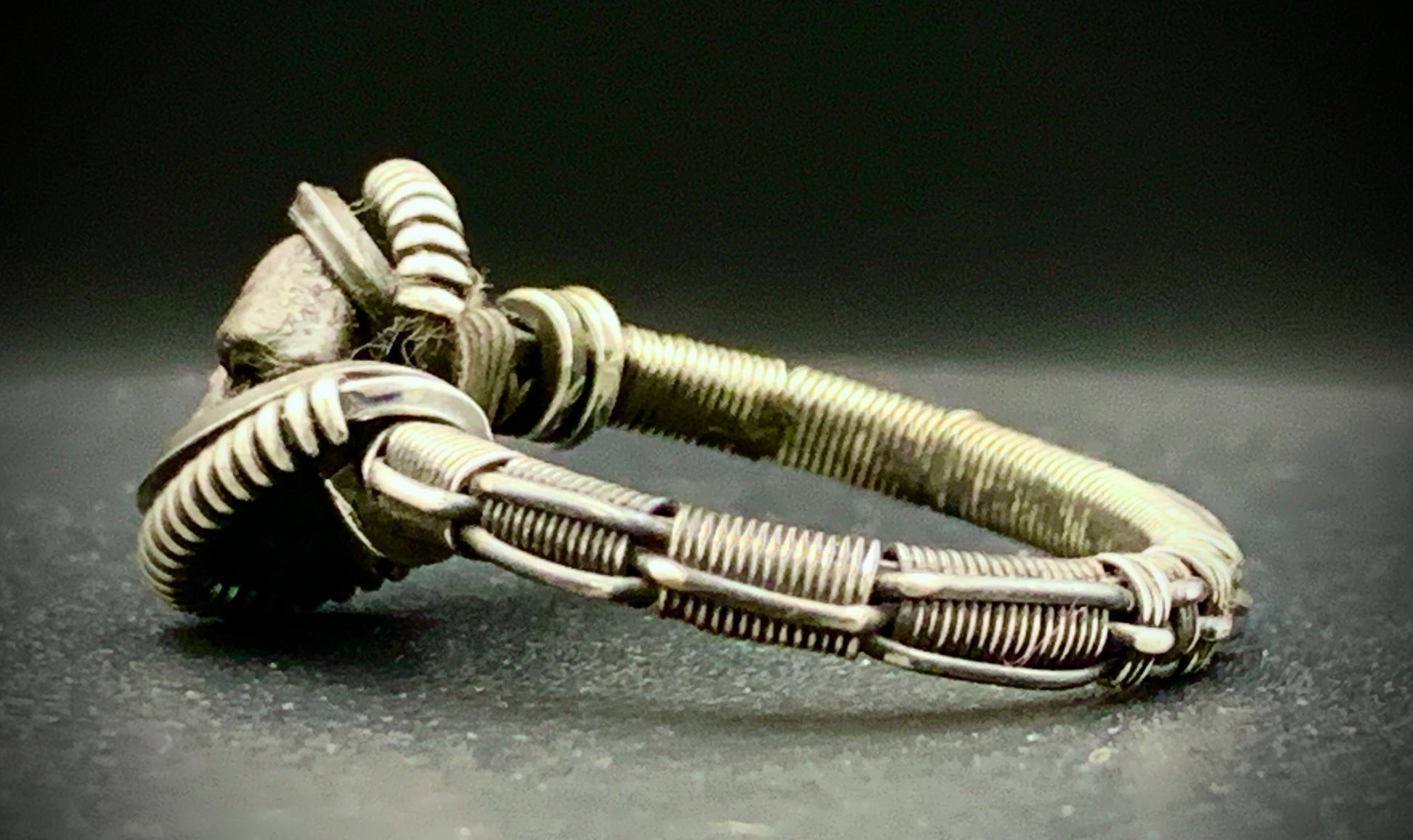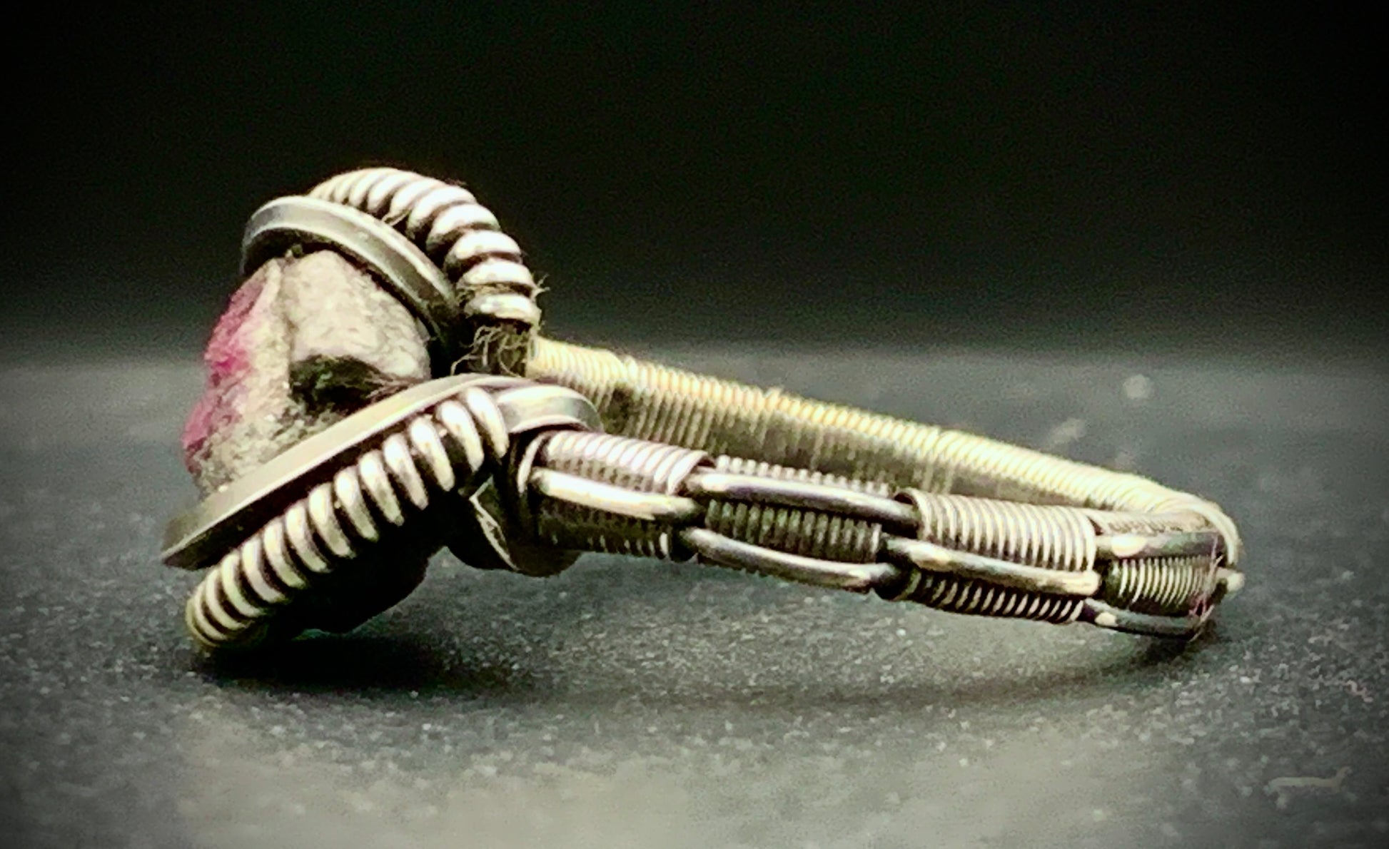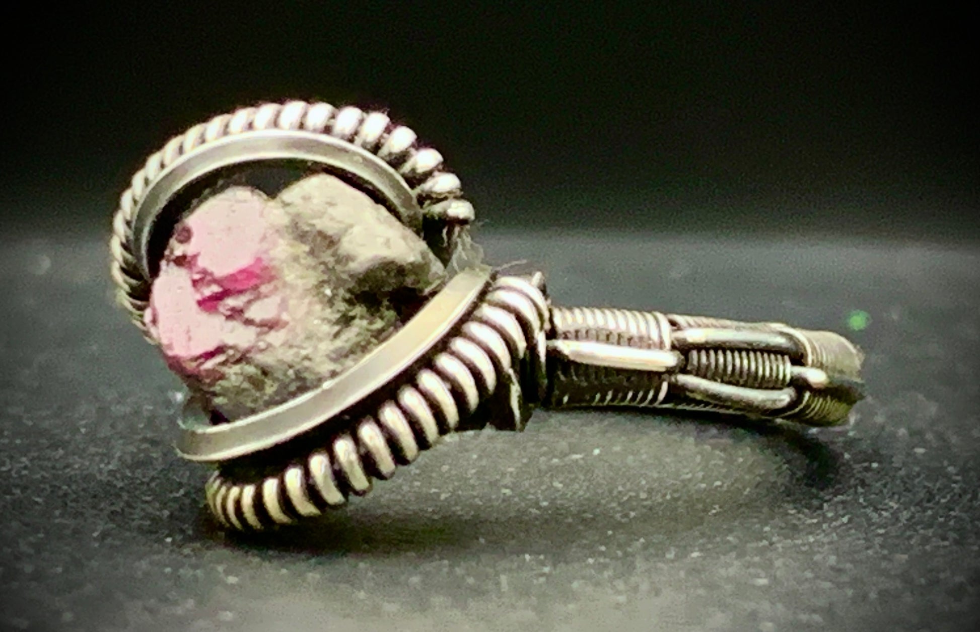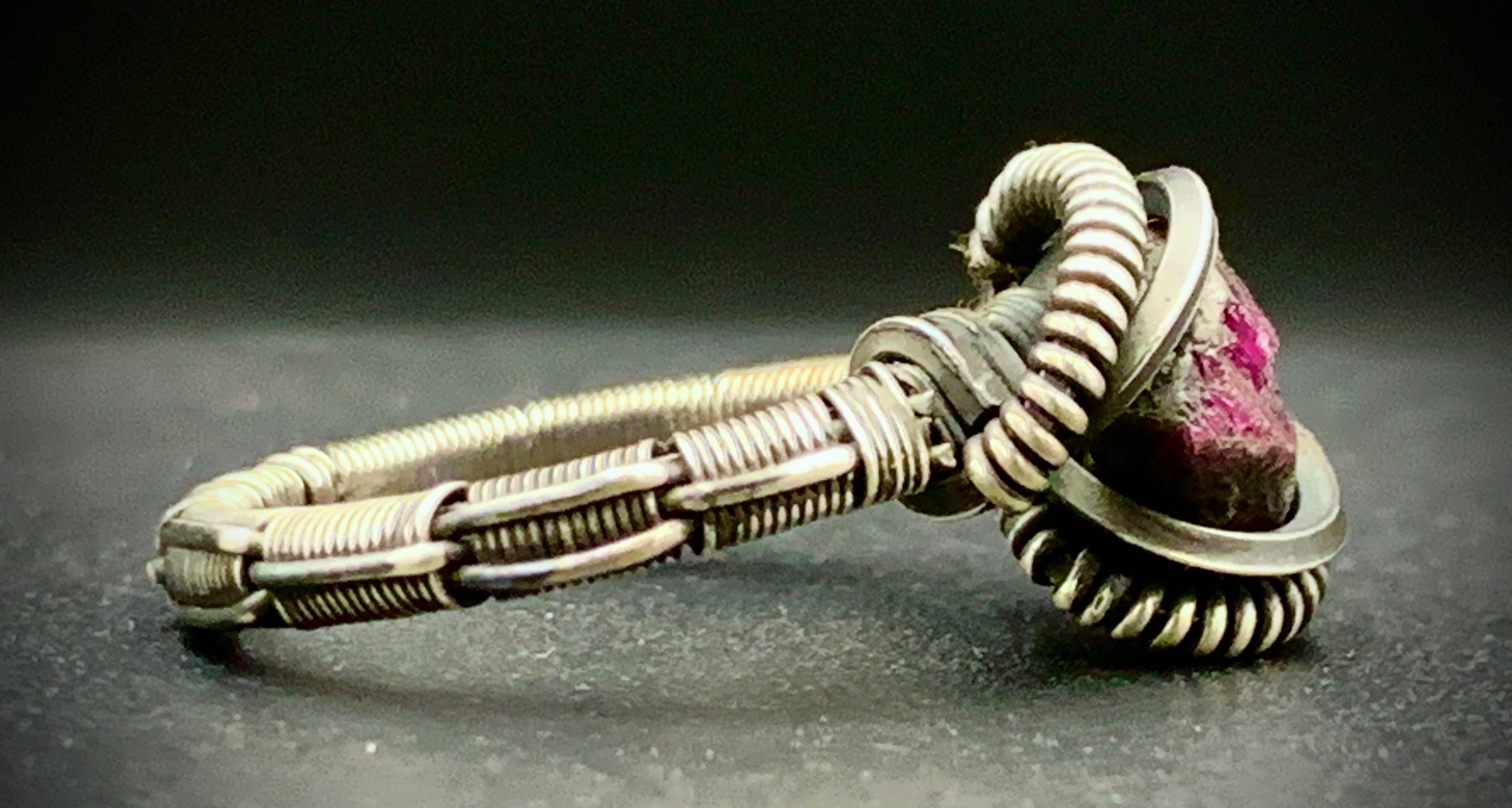 This one-of-a-kind ring is hand-wrapped with sterling silver wire, featuring a gorgeous piece of raw ruby woven into the braided design. Includes a unique, intricate weave-patterned band! Crafted with love in my 100% solar-powered off-grid silversmithing studio. Size 7