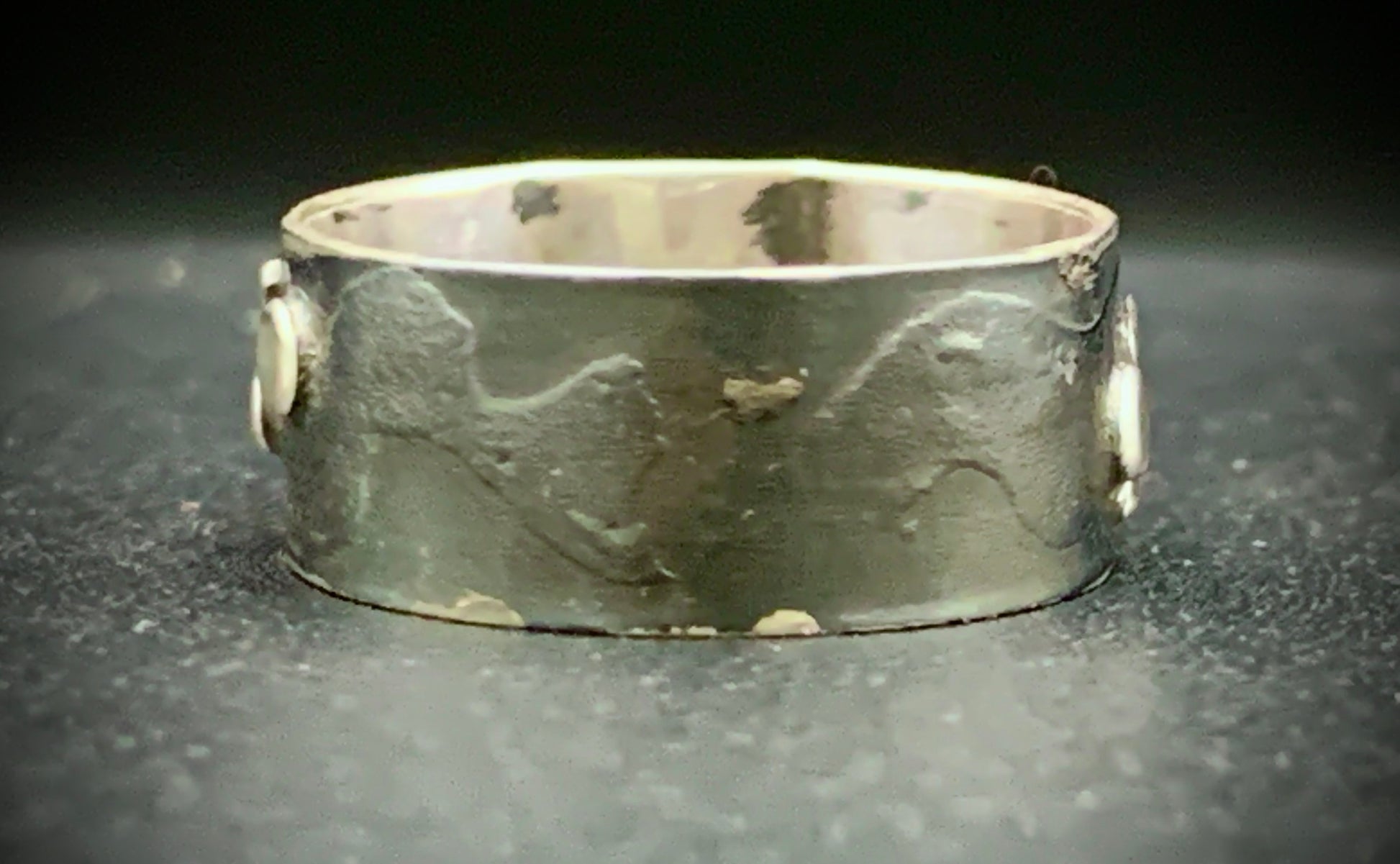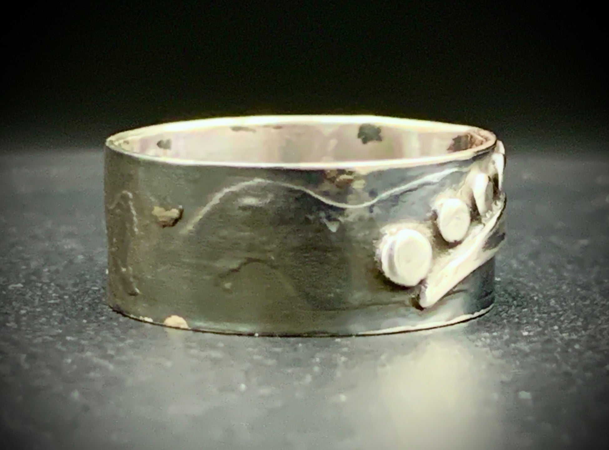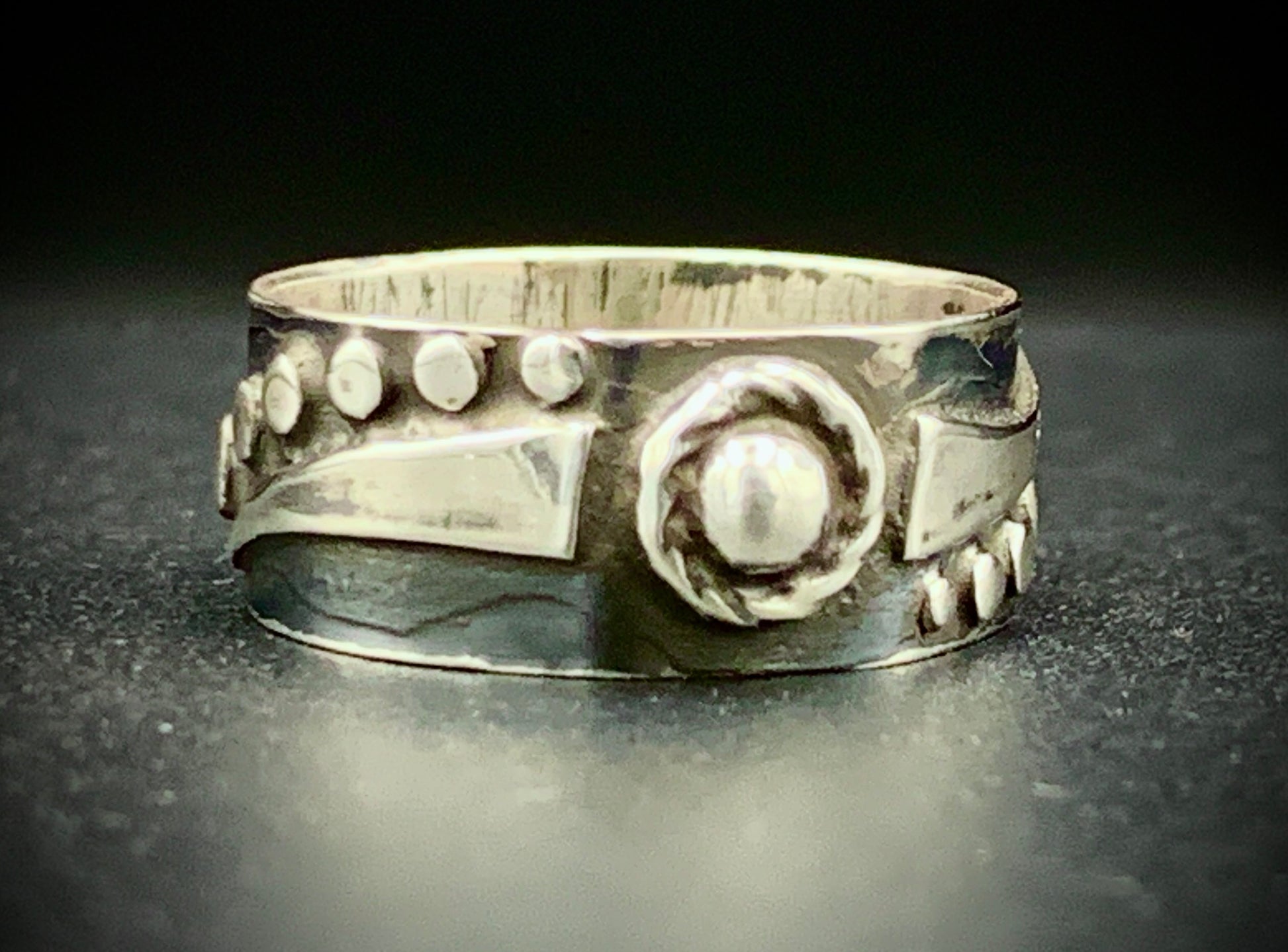 This one-of-a-kind ring is crafted from 100% sterling silver, featuring a unique, playful eye pattern created atop an oxidized/blackened band! Crafted with love in my 100% solar-powered off-grid silversmithing studio. Size 8