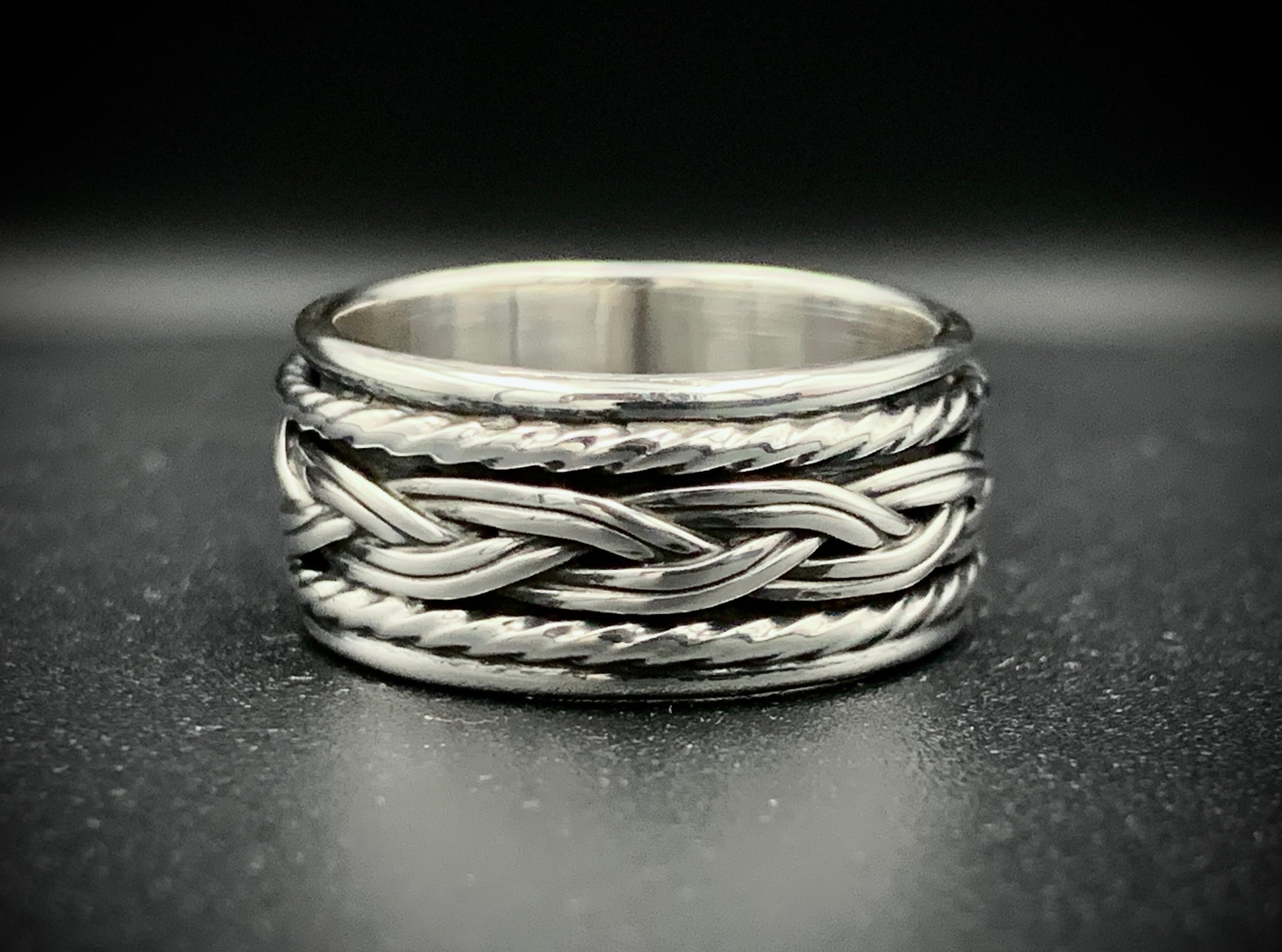 This one-of-a-kind ring is handmade from solid sterling silver, custom-crafted into a timeless piece of art that is made to last many generations. This design uses hand-woven/twisted silver wires soldered over a seamless band, making this ring full of interesting textures, yet extremely comfortable to wear! All wire and sheet material used in this piece was custom-crafted from hand-poured molten silver in my solar-powered, off-grid studio.