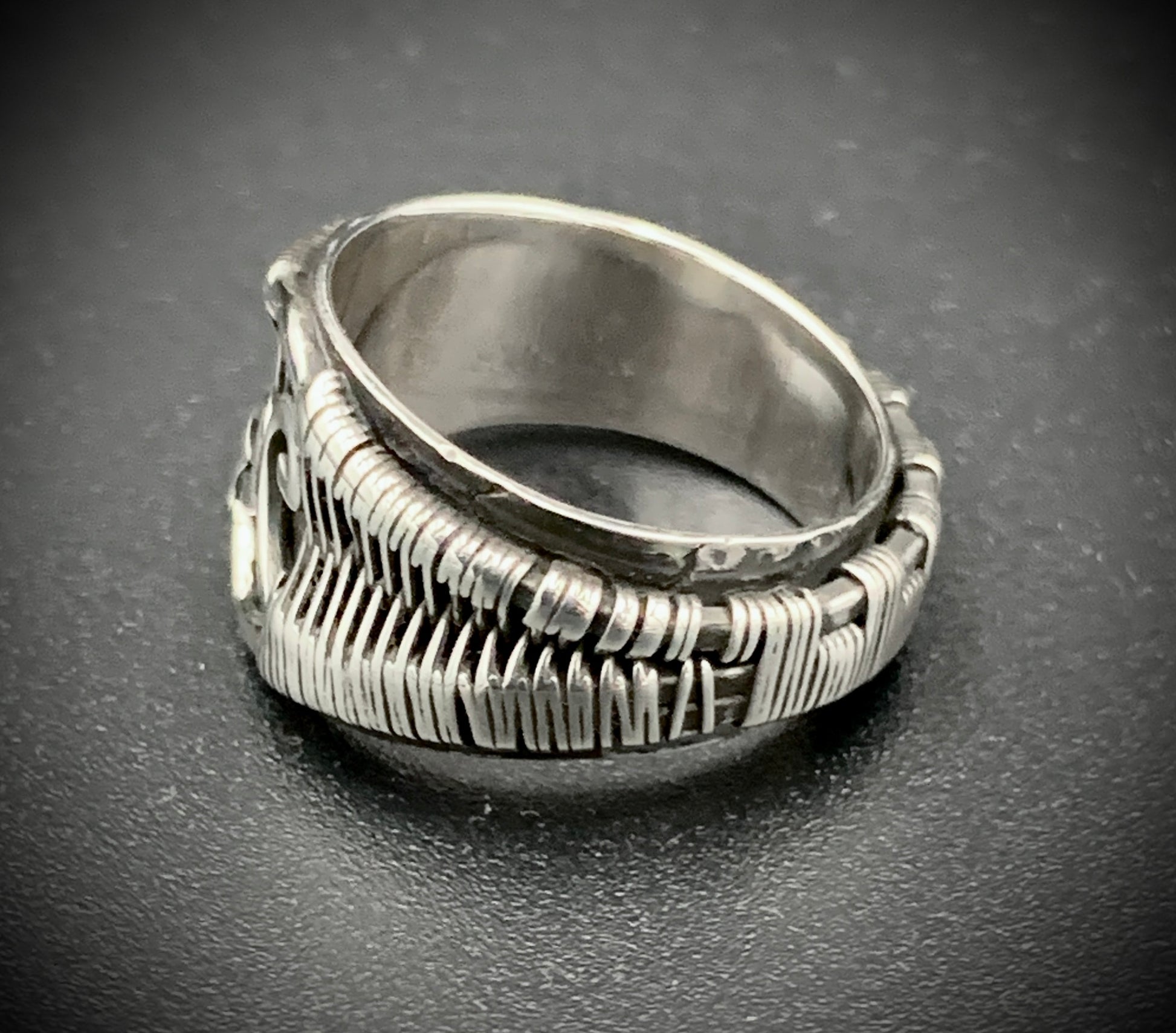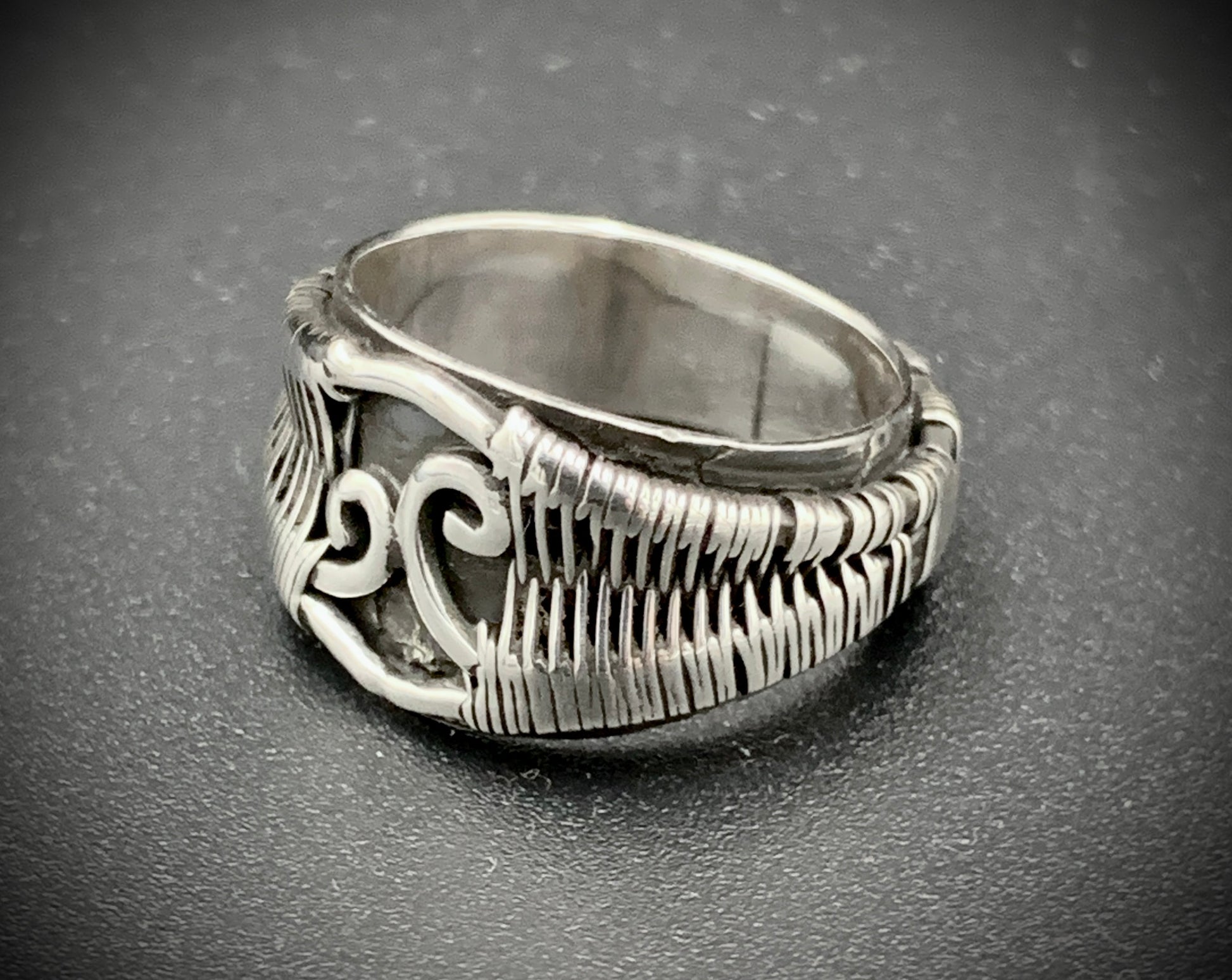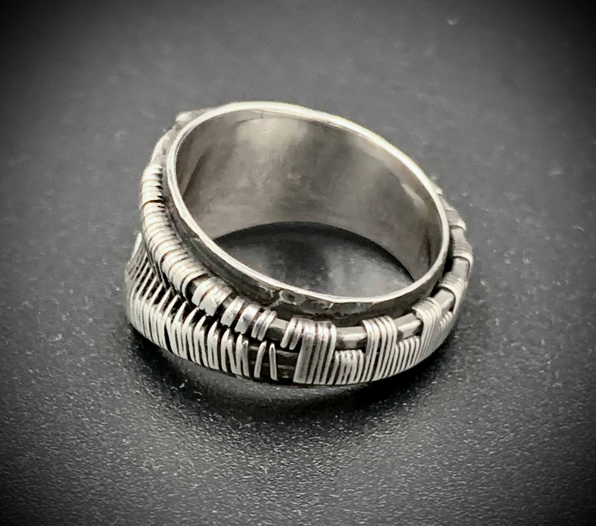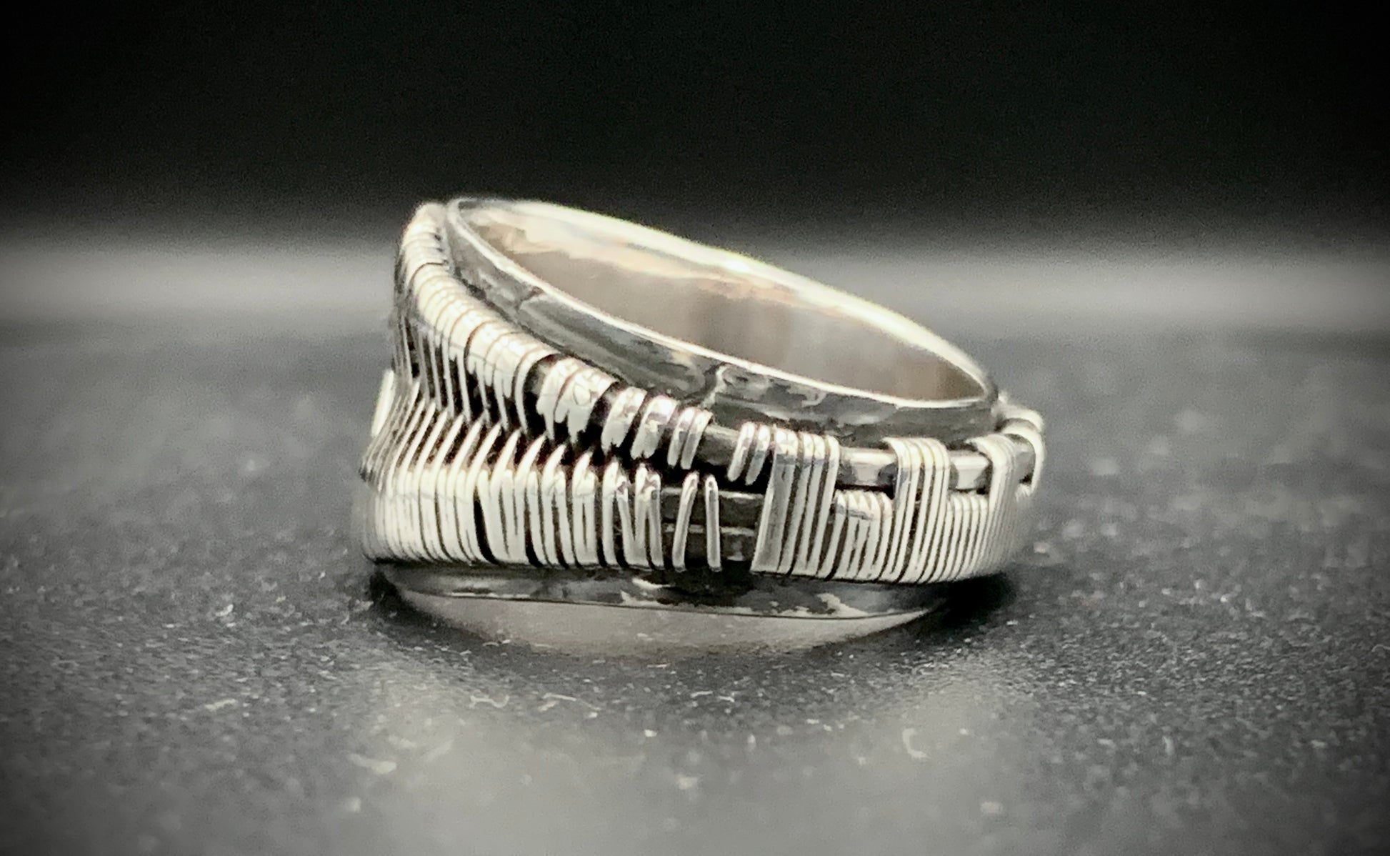 This one-of-a-kind ring is handmade from solid sterling silver, custom-crafted into a timeless piece of art that is made to last many generations. This design uses hand-woven silver wires soldered over a seamless band, making this ring full of interesting textures, yet extremely comfortable to wear! All wire and sheet material used in this piece was custom-crafted from hand-poured molten silver in my solar-powered, off-grid studio.