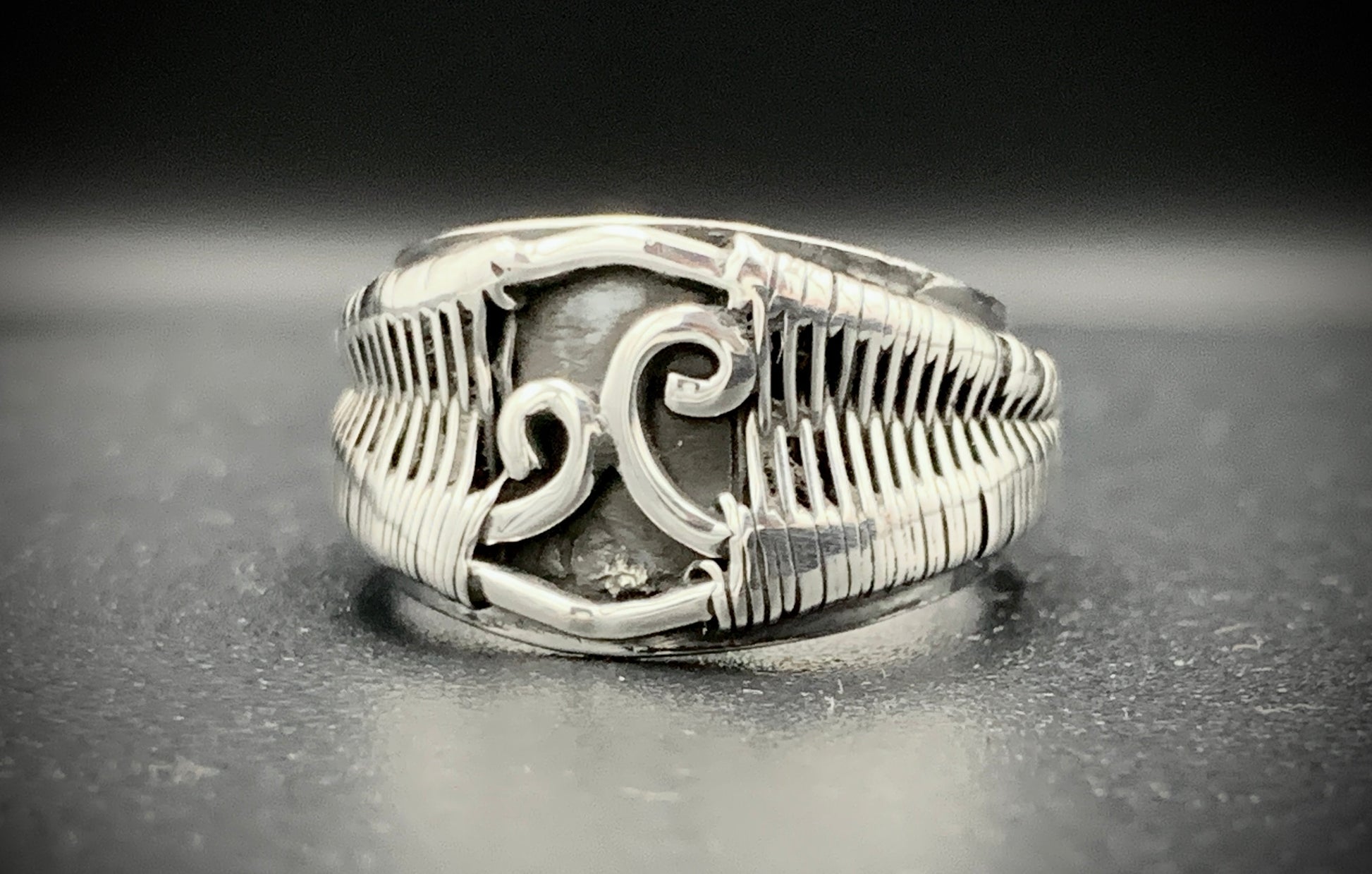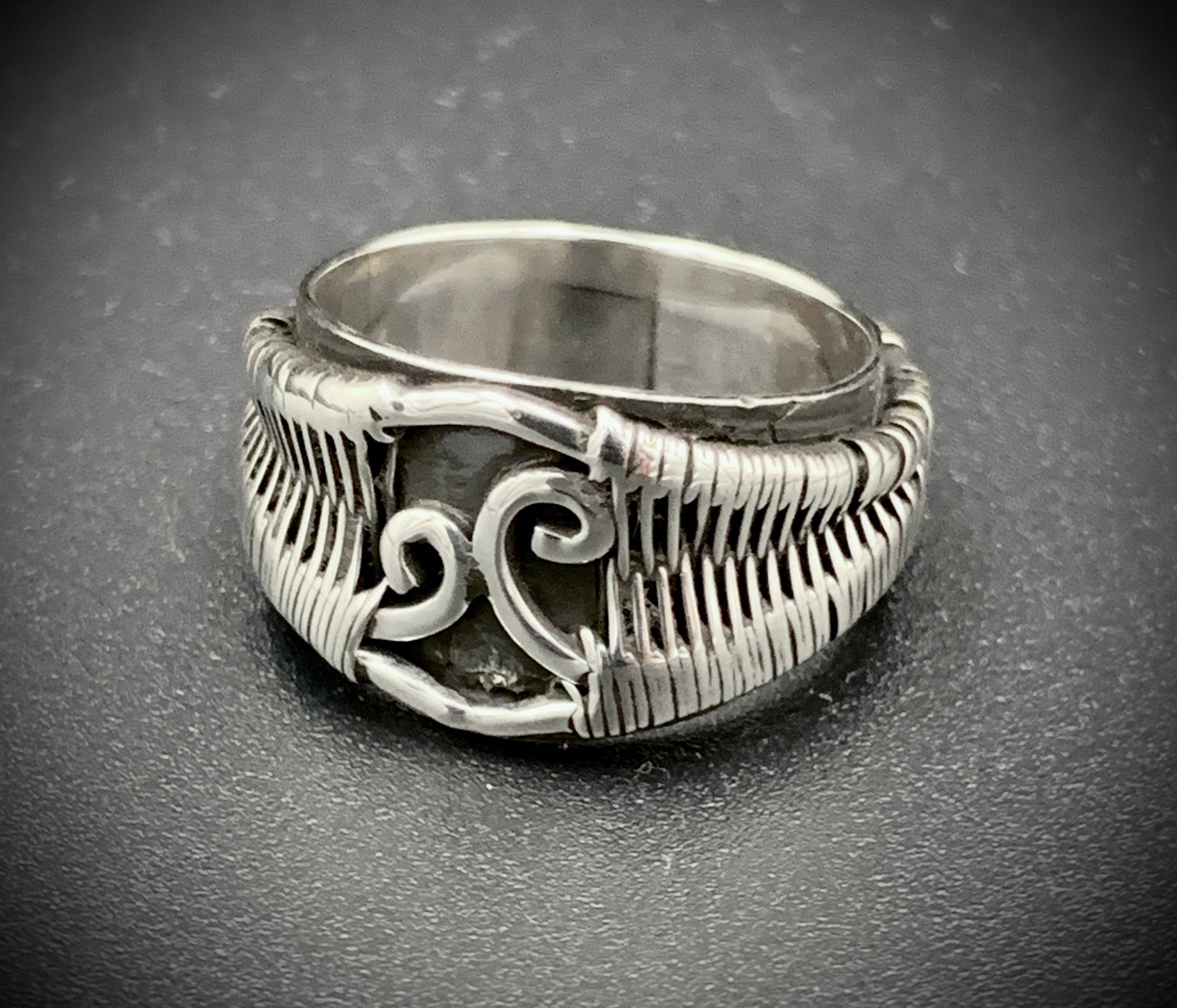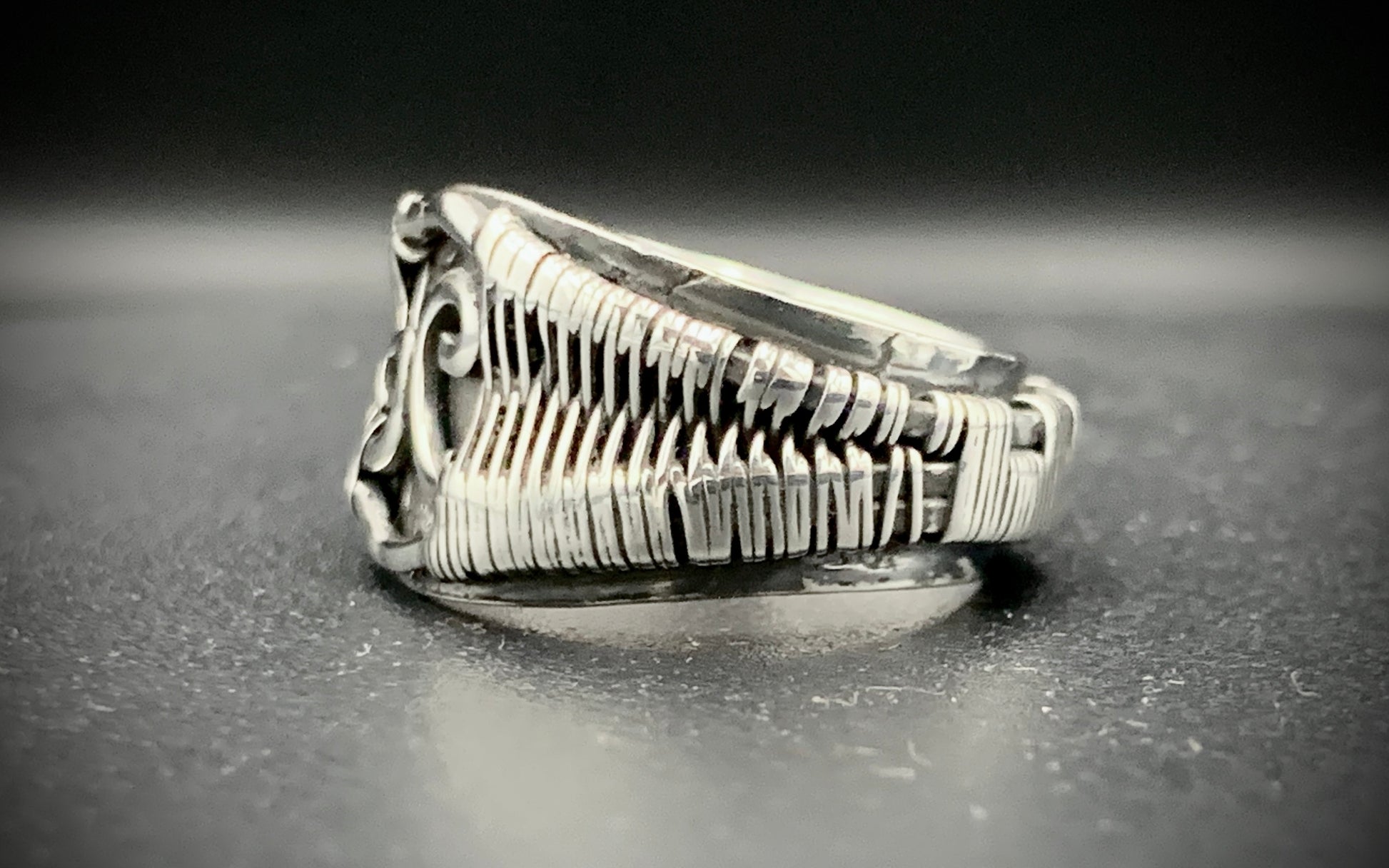 This one-of-a-kind ring is handmade from solid sterling silver, custom-crafted into a timeless piece of art that is made to last many generations. This design uses hand-woven silver wires soldered over a seamless band, making this ring full of interesting textures, yet extremely comfortable to wear! All wire and sheet material used in this piece was custom-crafted from hand-poured molten silver in my solar-powered, off-grid studio.