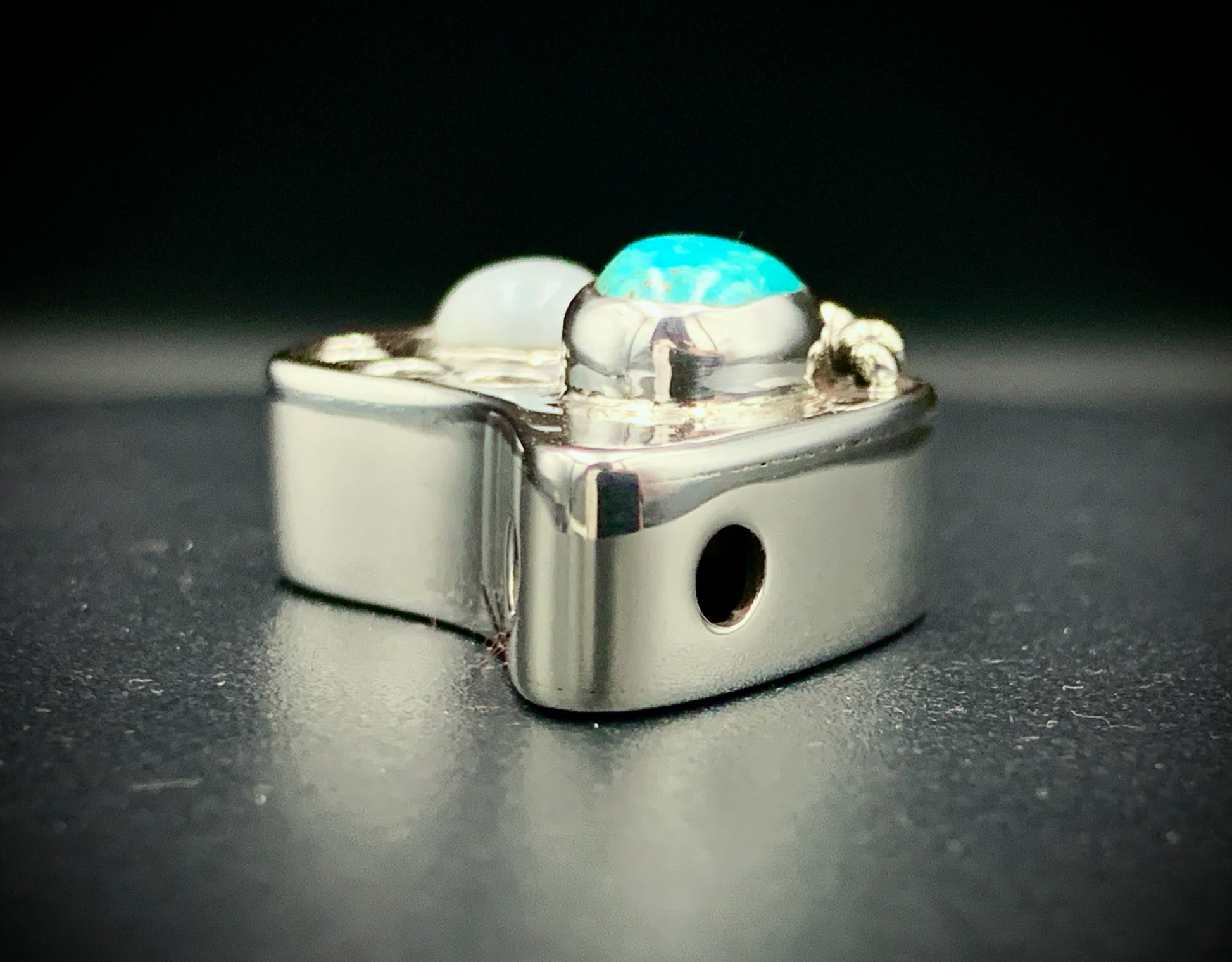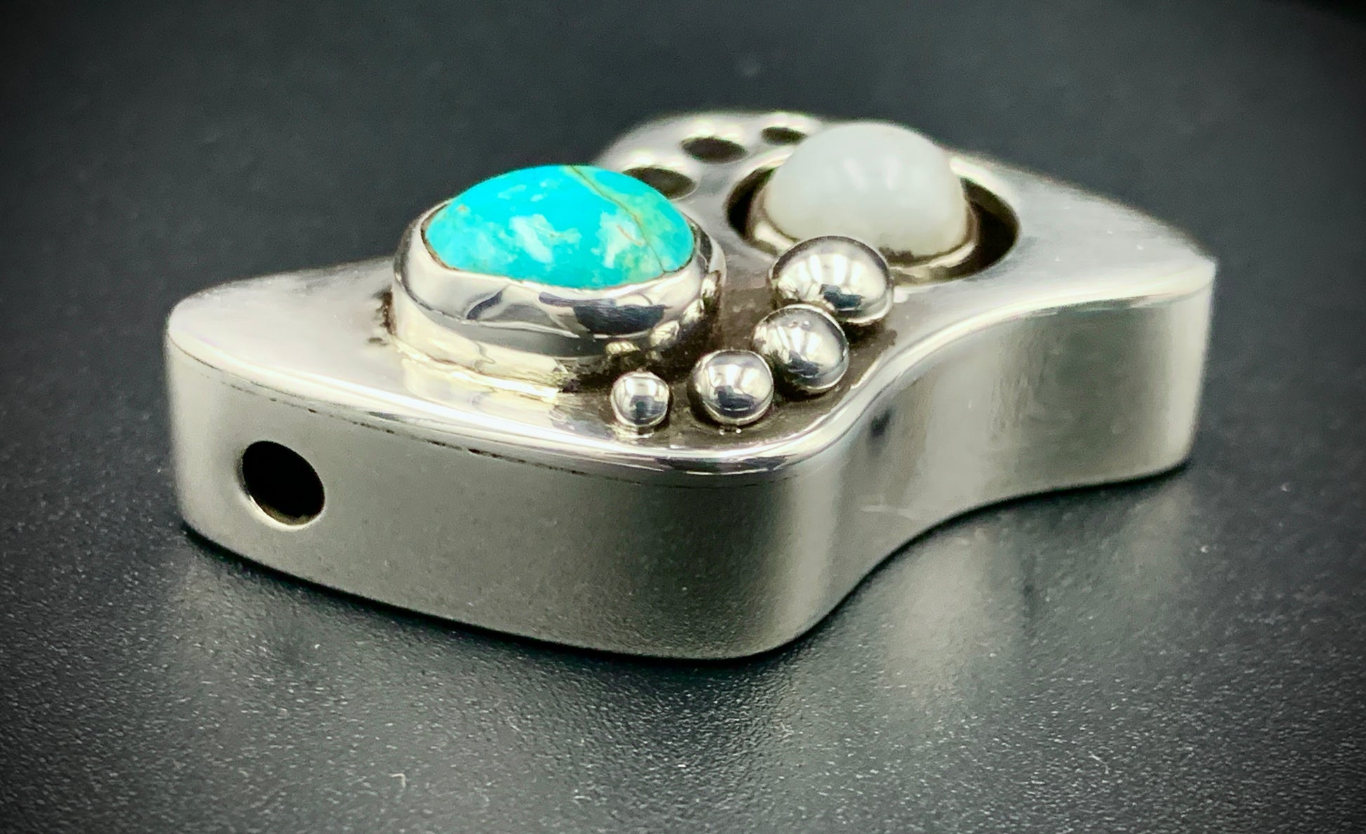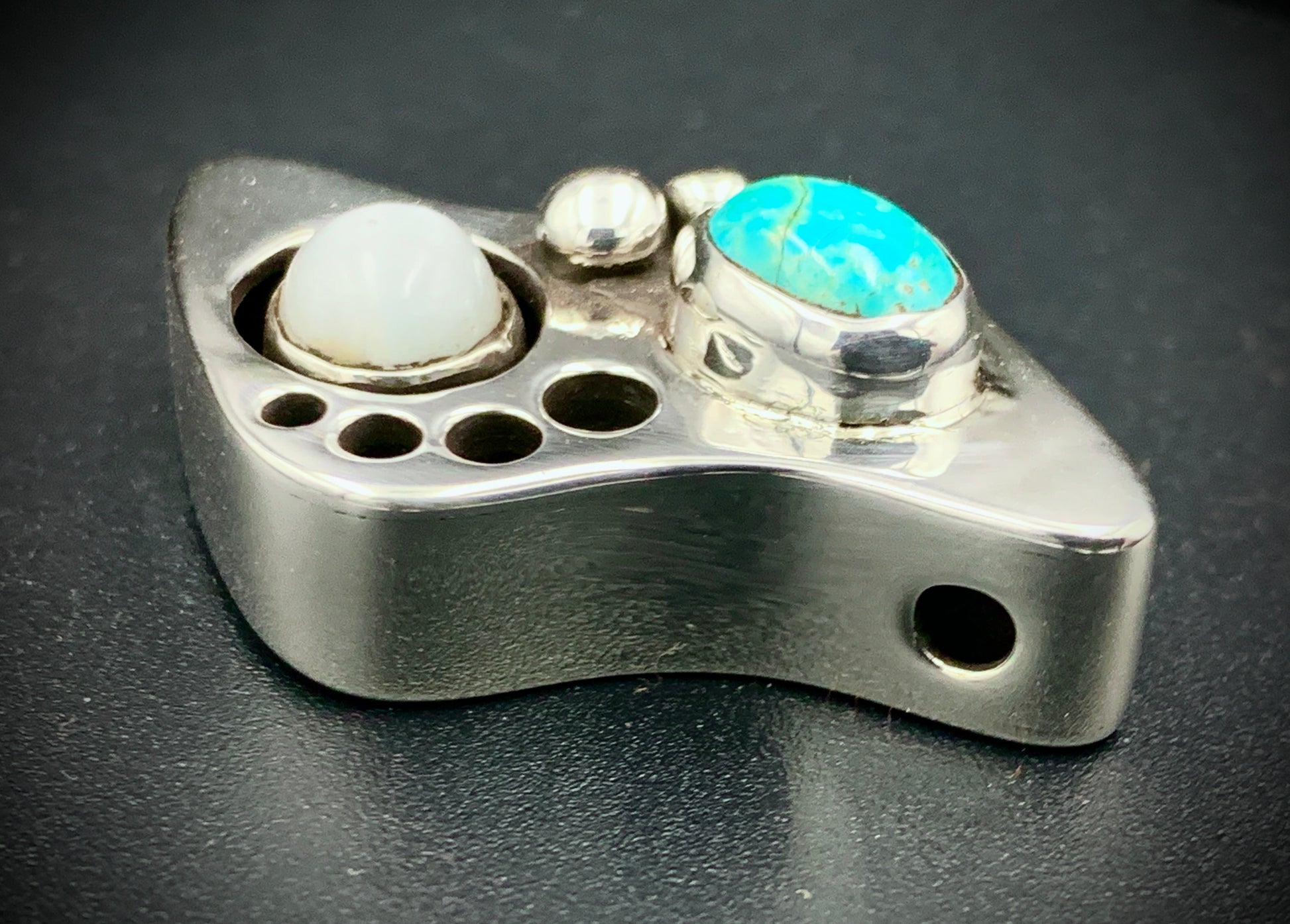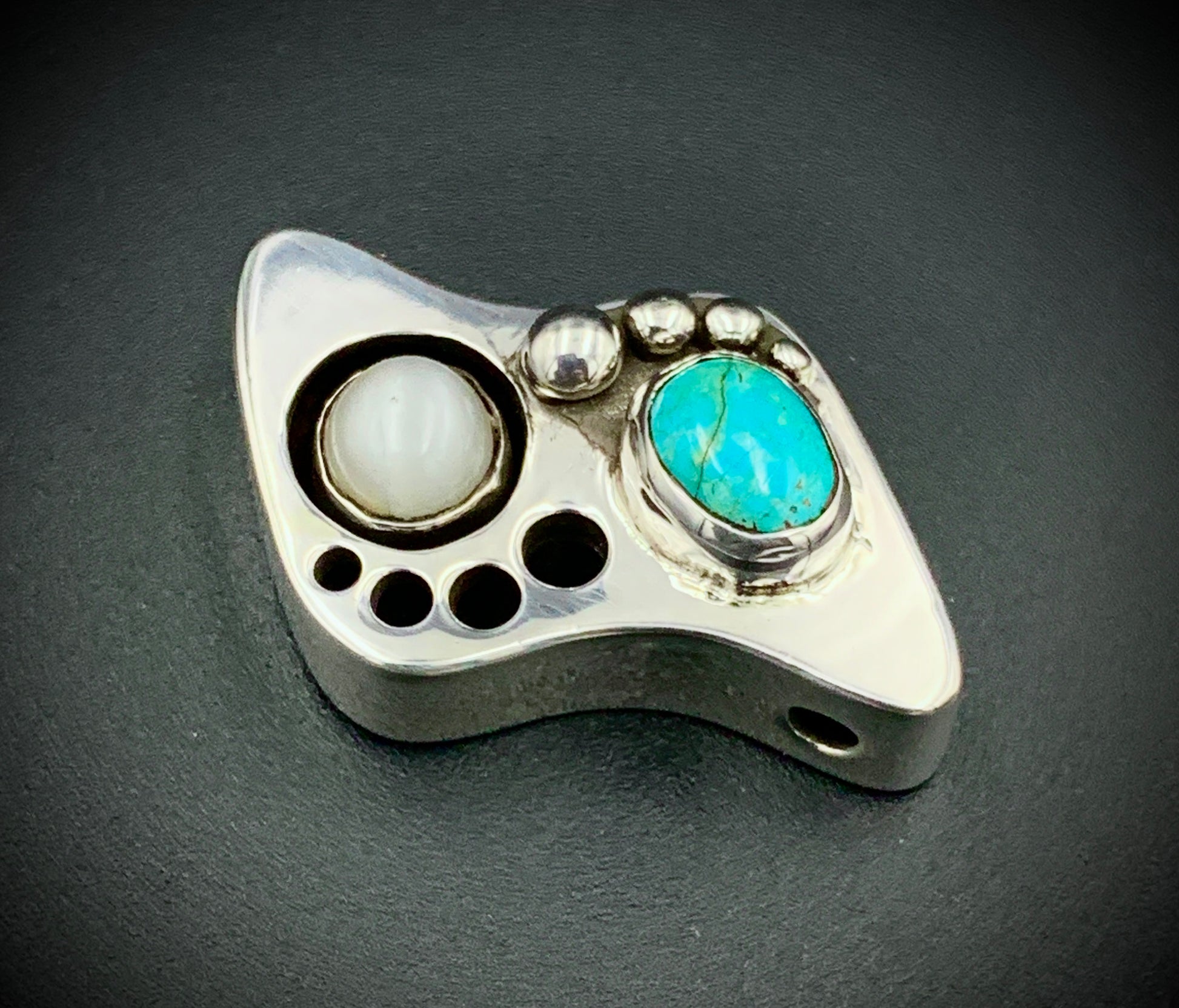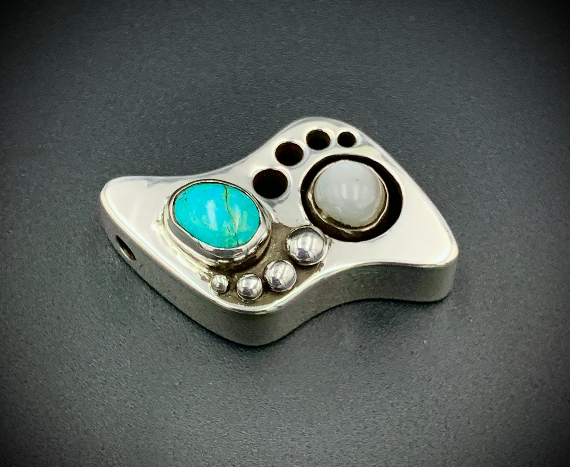 This one-of-a-kind pendant is handmade from solid sterling silver, custom-crafted into a timeless piece of art that is made to last many generations. This design uses a shadowbox-style to create a chunky, three-dimensional pendant. Nestled within the shadowbox is a gorgeous moonstone bezel setting, surrounded by a tapering set of circular cutouts. Sitting atop of the shadowbox is a vibrant turquoise bezel setting, surrounded by a tapering set of silver spheres. This creates an intentionally mirrored image, meant to reflect multiple hidden meanings. Firstly, the wisdom to "be in this world but not of it", as well as "walk with one foot in this world, and one foot in the other world" is symbolized by the turquoise and moonstone "feet" walking in opposite yet balanced directions. Also, the timeless hermetic axiom "as above so below, as within so without" is symbolized by the turquoise/silver spheres rising above/without, and the moonstone. circular cutouts descending below/within. This chunky piece is crafted for the seeker, the modern mystic who aspires to uncover, reveal, and understand the mysteries of the Universe. All sheet material used in this piece was custom-crafted from hand-poured molten silver in my solar-powered, off-grid studio.