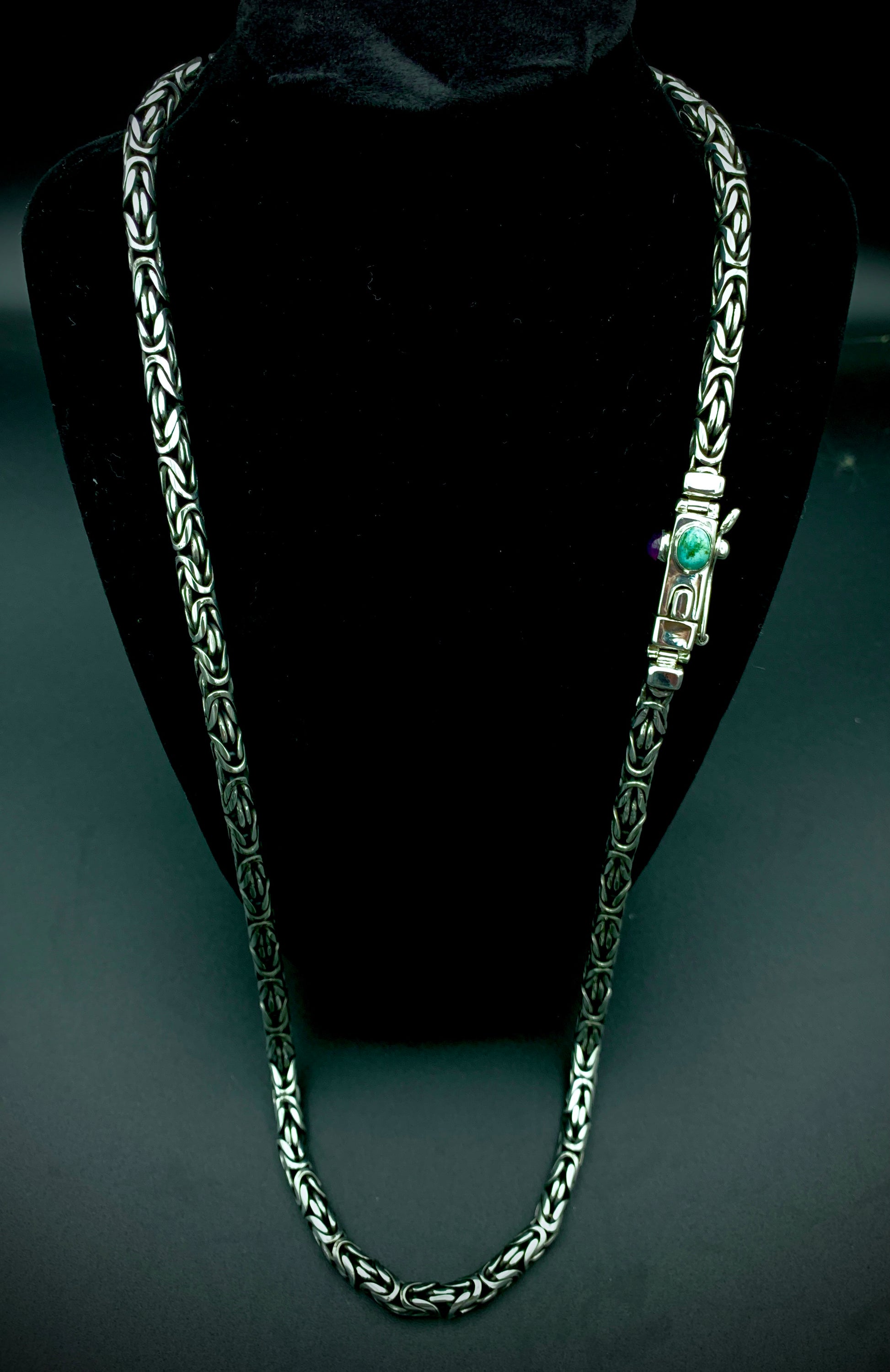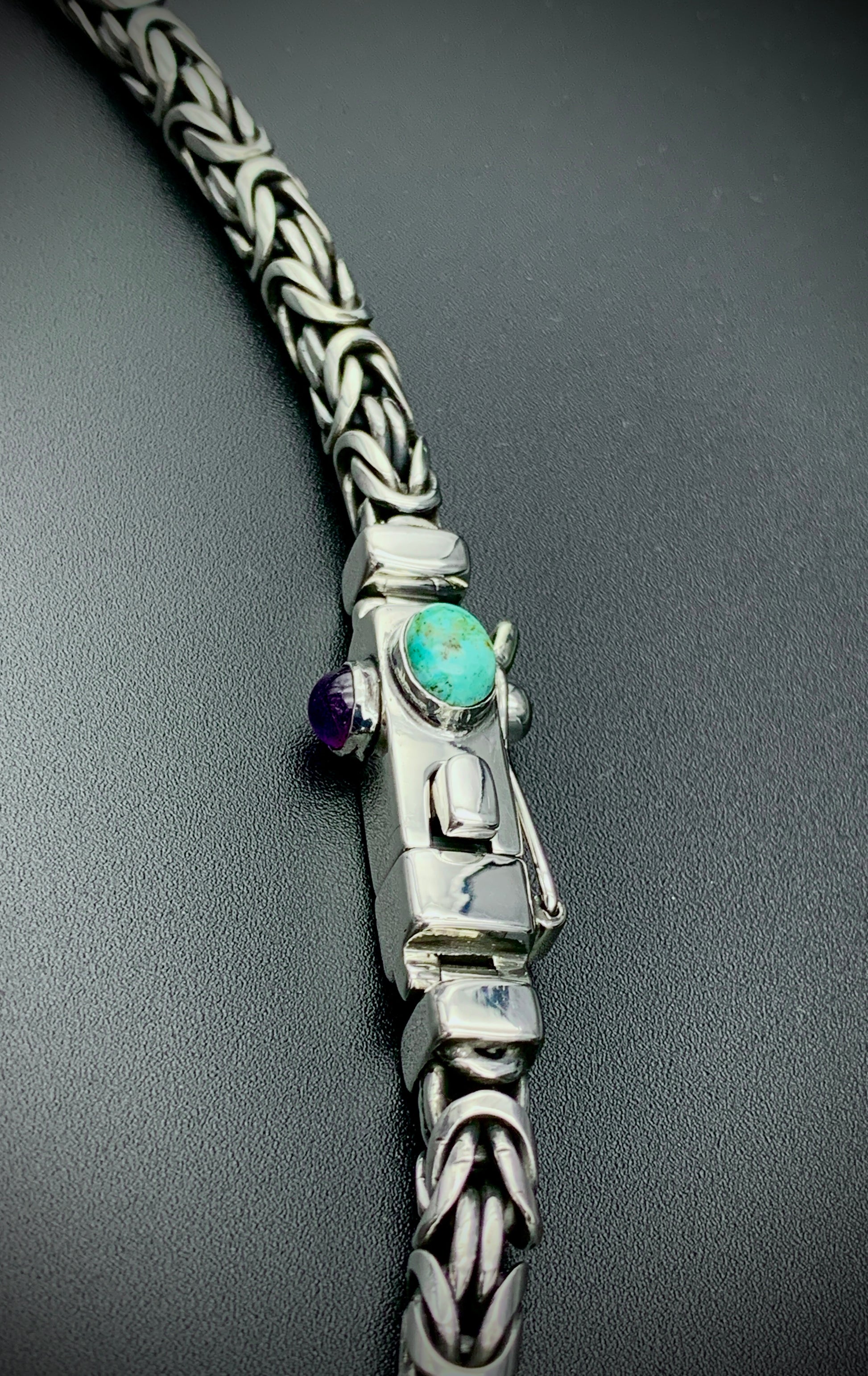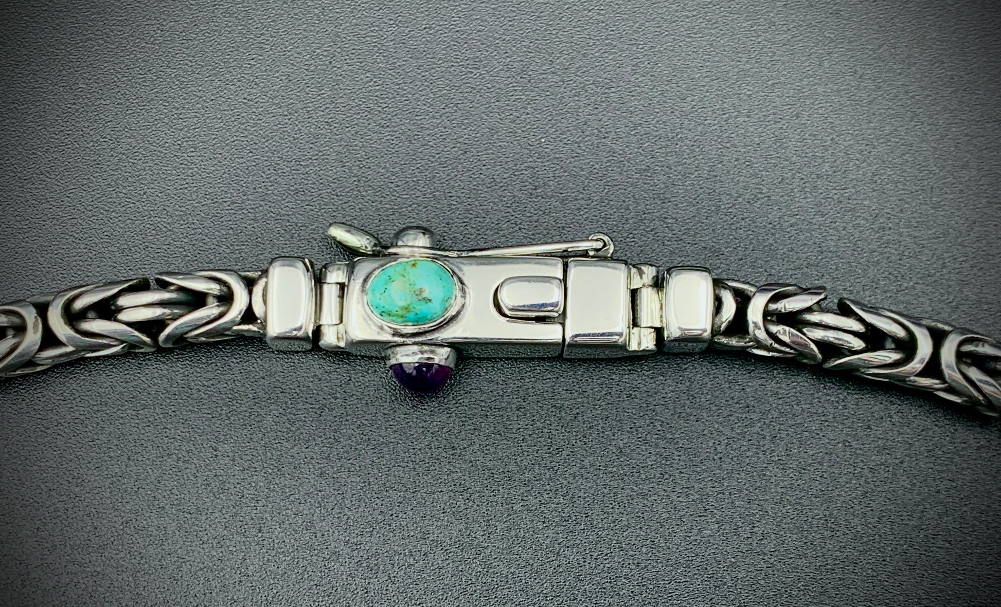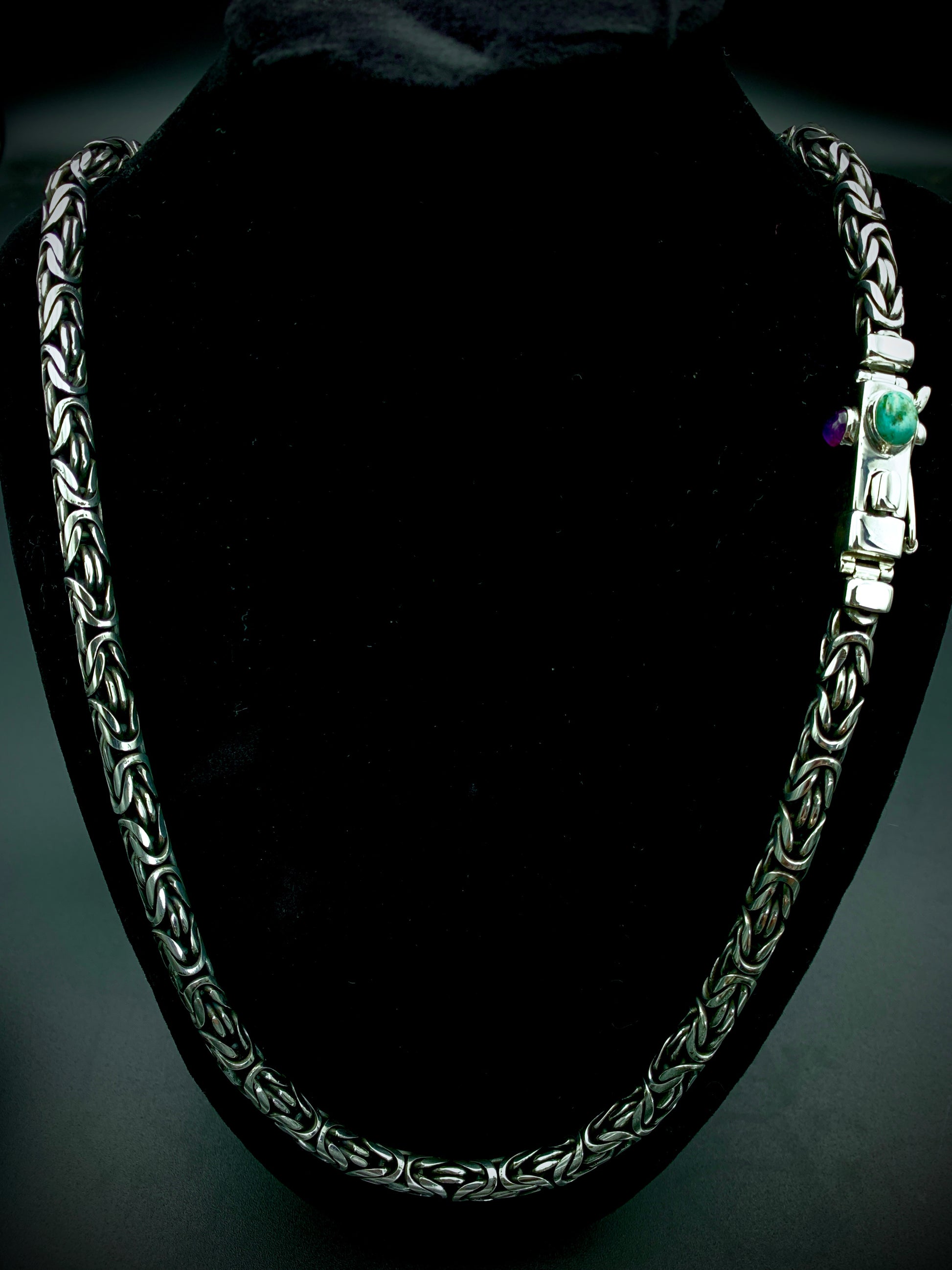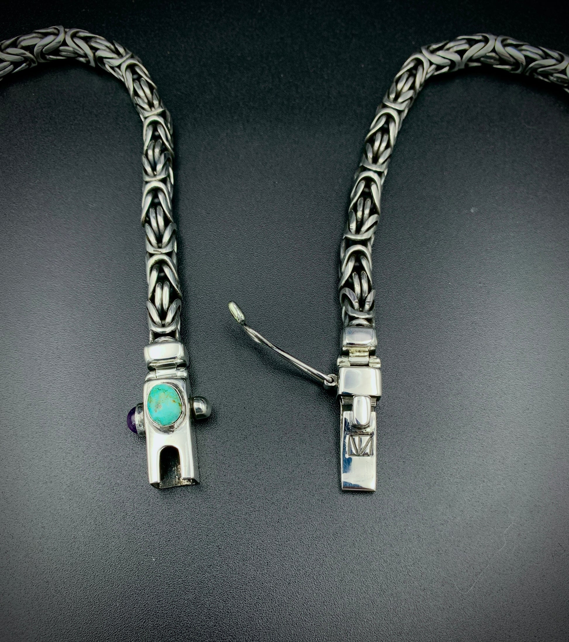Handmade Byzantine chain necklace crafted from solid sterling silver. All wire and sheet material used in this piece was custom-crafted from hand-poured molten silver in my solar-powered, off-grid studio, and meticulously assembled into a timeless work of art that is made to last for many generations. Handmade box clasp with safety catch featuring vibrant turquoise & amethyst cabochon settings, including handmade hinges to allow the clasp to perfectly fit the form of your neck. The 28-inch size contains approximately 500 individually assembled/soldered silver links, takes about 50-60 hours to make, and weighs over 5 ounces! Step into the timeless old-world beauty and strength of the Byzantine chain with this bold, elegant necklace!
