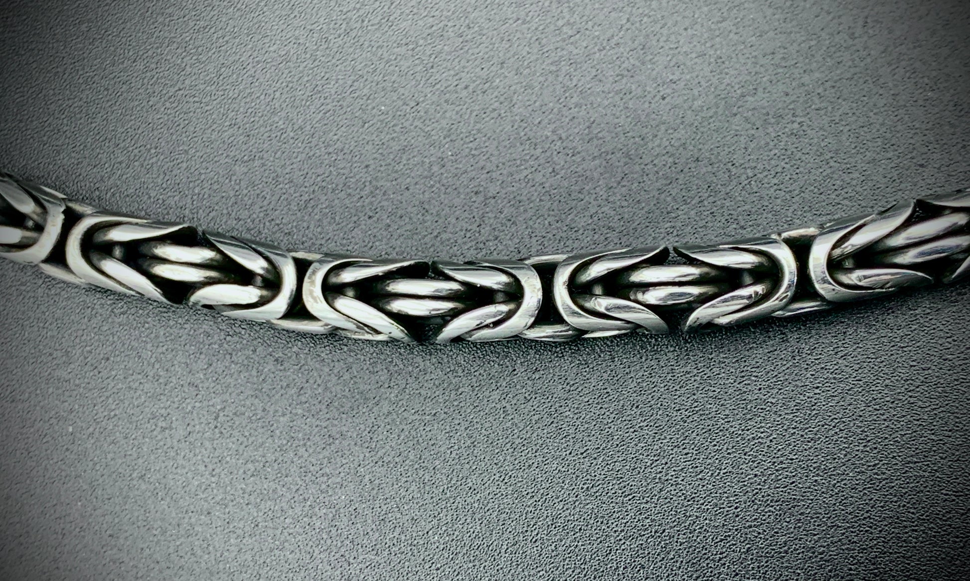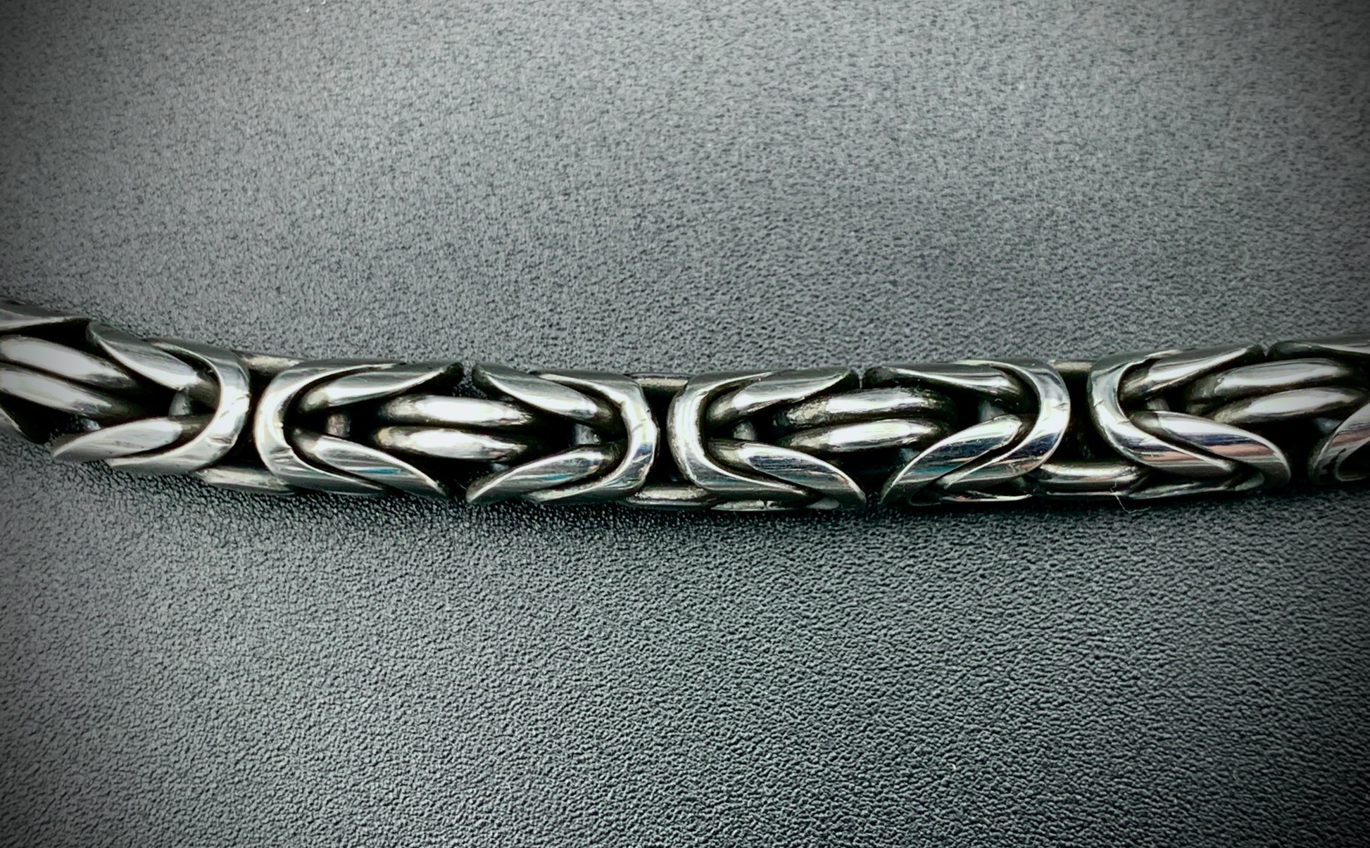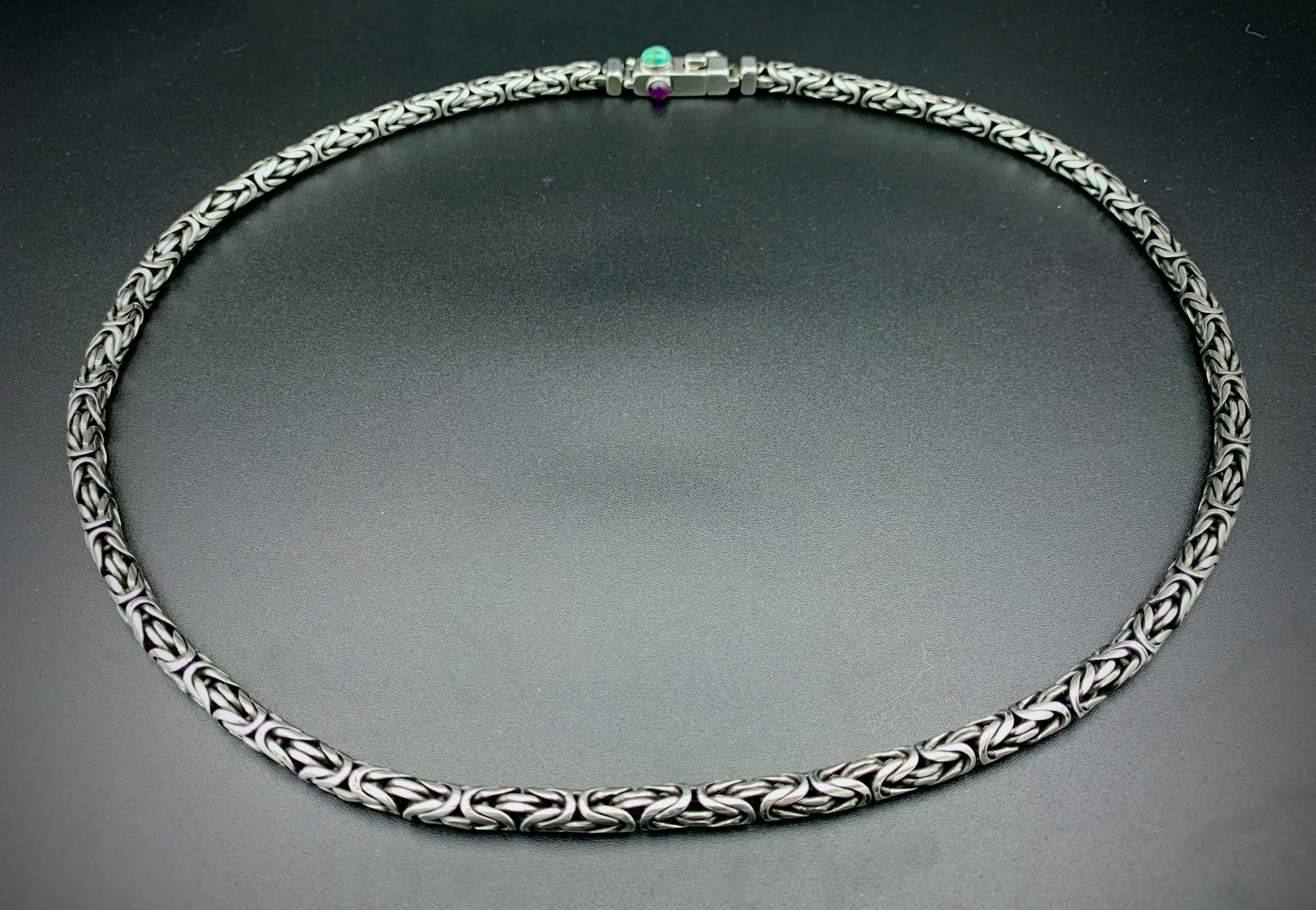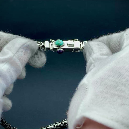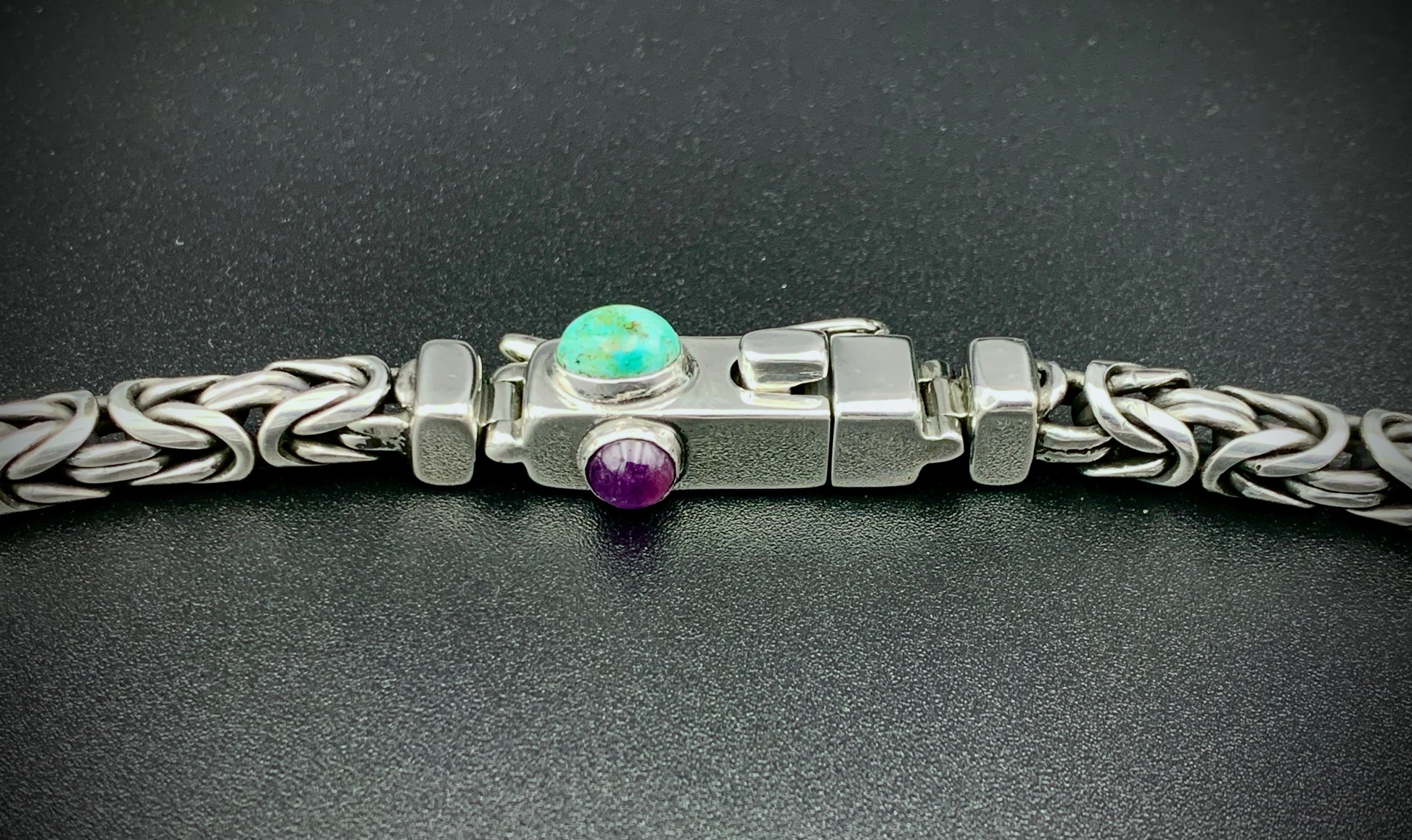 Handmade Byzantine chain necklace crafted from solid sterling silver. All wire and sheet material used in this piece was custom-crafted from hand-poured molten silver in my solar-powered, off-grid studio, and meticulously assembled into a timeless work of art that is made to last for many generations. Handmade box clasp with safety catch featuring vibrant turquoise & amethyst cabochon settings, including handmade hinges to allow the clasp to perfectly fit the form of your neck. The 28-inch size contains approximately 500 individually assembled/soldered silver links, takes about 50-60 hours to make, and weighs over 5 ounces! Step into the timeless old-world beauty and strength of the Byzantine chain with this bold, elegant necklace!