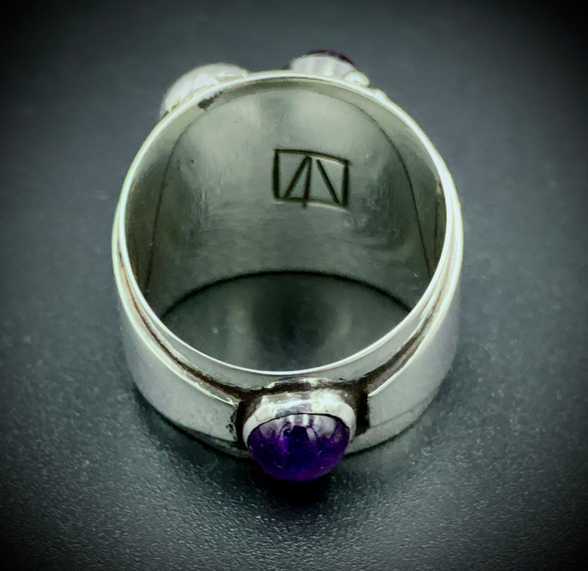 This one-of-a-kind ring is handmade from solid sterling silver, custom-crafted into a timeless piece of art that is made to last many generations, and created as a reminder to step into your power! Multilayered band design with oxidized background, multiple turquoise bezel front settings, one amethyst cabochon tube front setting, and a hidden amethyst cabochon tube setting at the back of the band. This design creates a rich, texture-filled surface with a smooth, seamless interior band, making it stylish and extremely comfortable to wear. All sheet material used in this piece was custom-crafted from hand-poured molten silver in my solar-powered, off-grid studio.