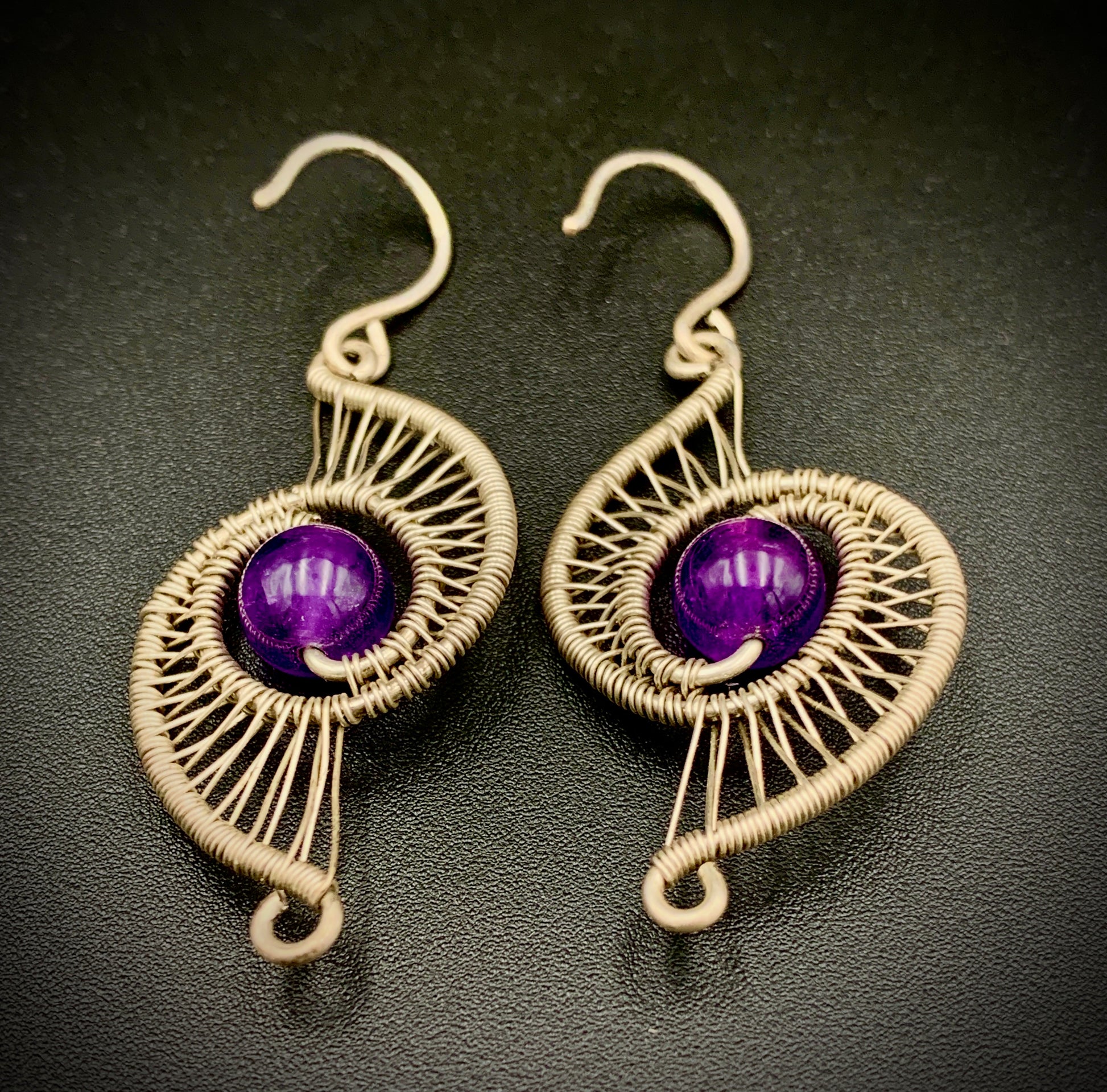 These one-of-a-kind, wire-wrapped earrings are handcrafted from sterling silver wire and amethyst beads, with sterling silver ear hooks. Made with love in my 100% solar-powered, off-grid silversmithing studio!