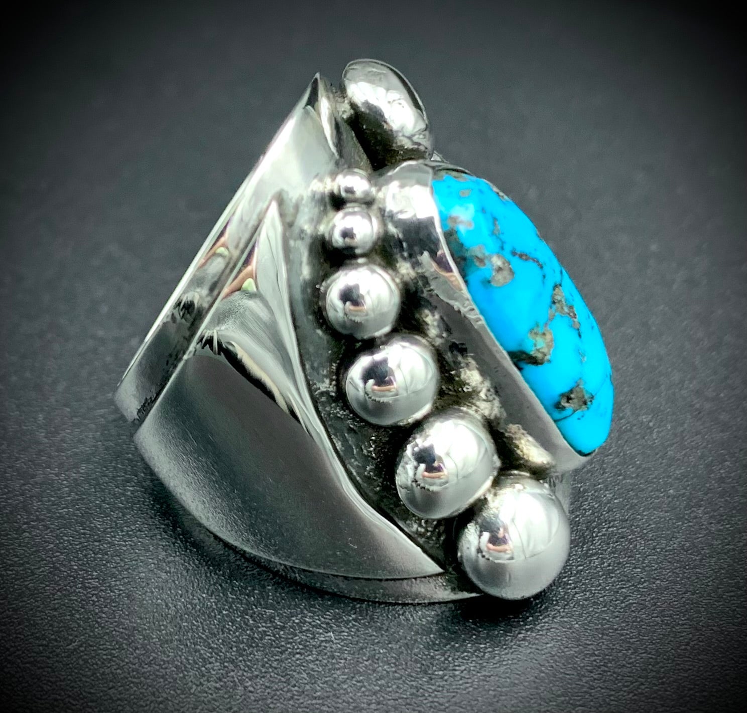 This one-of-a-kind ring is handmade from solid sterling silver, custom-crafted into a timeless piece of art that is made to last many generations, and created as a reminder to step into your power! Multilayered band design with oxidized background, featuring a large turquoise cabochon saddle-style front setting, all soldered over a seamless inner band. This design allows for a rich, texture-filled surface with a silky smooth interior band that makes it stylish and extremely comfortable to wear. All wire and sheet material used in this piece was custom-crafted from hand-poured molten silver in my solar-powered, off-grid studio.