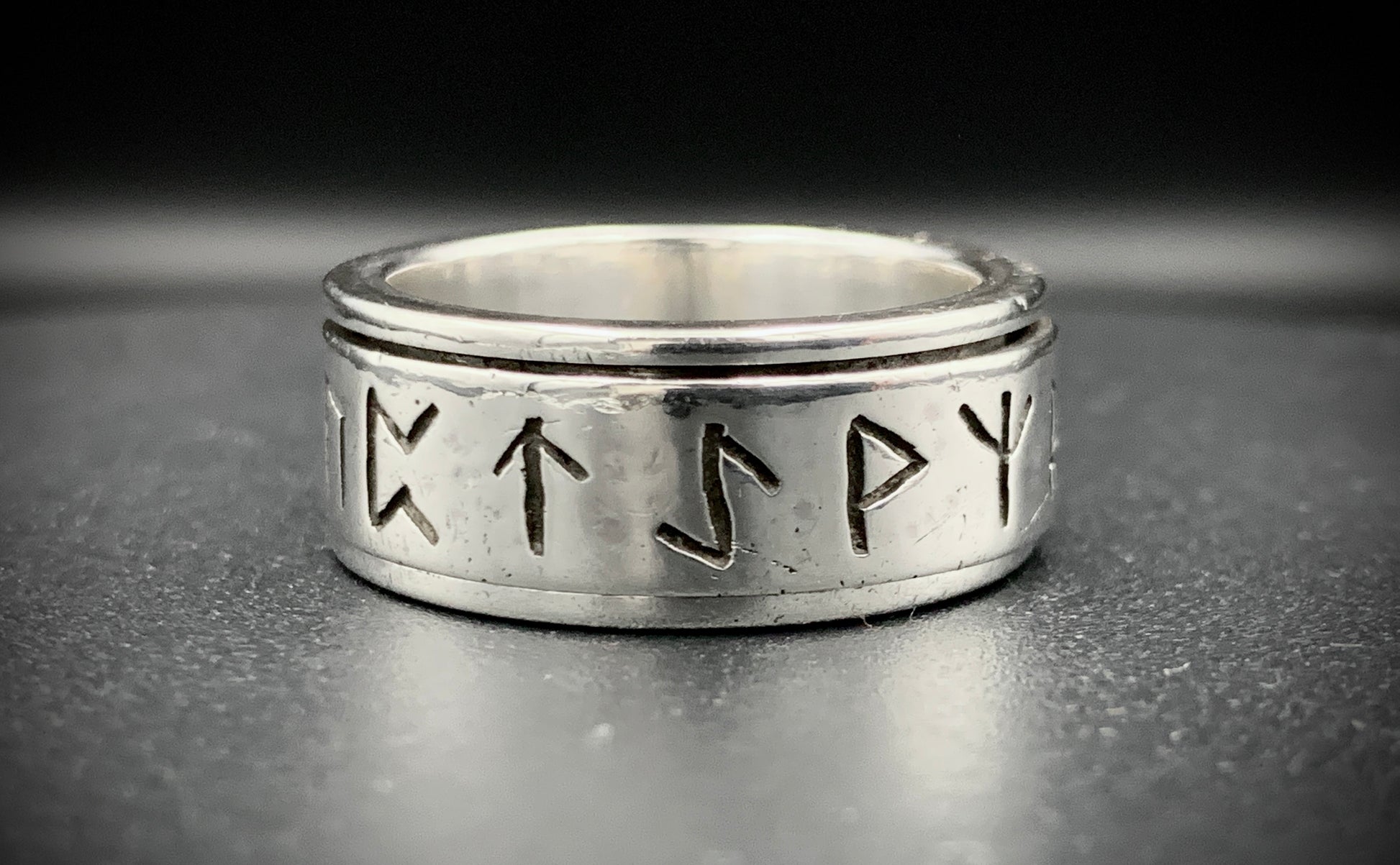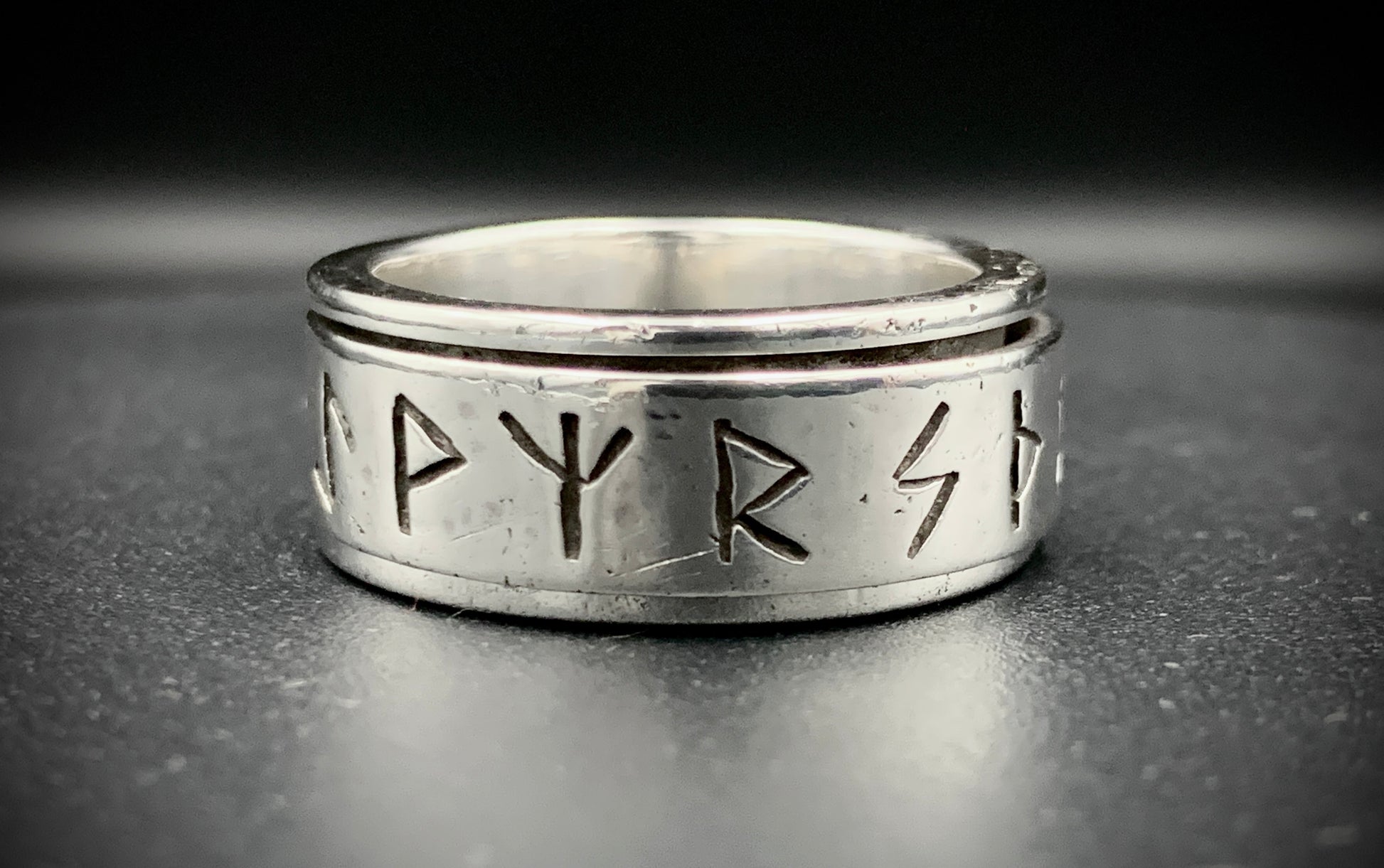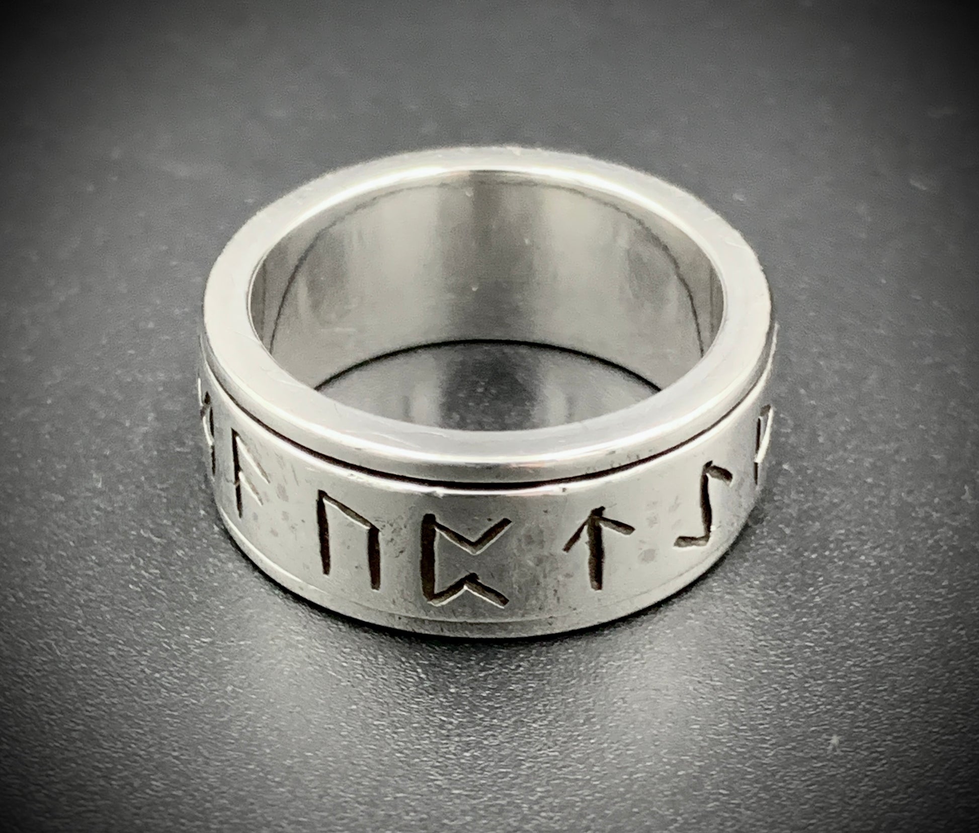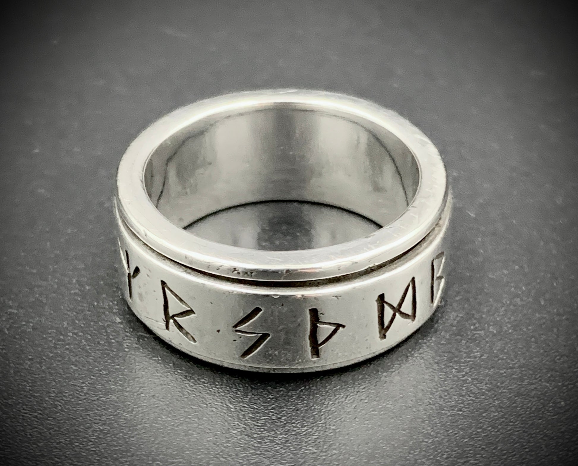 This one-of-a-kind ring is handmade from solid sterling silver, custom-crafted into a timeless piece of art that is made to last many generations. This design incorporates a hand-stamped Viking rune band over a thick base band to create a fully spinning ring. Walk the path of the Northern Mystic, drawing guidance and knowledge from the Elder Futhark runic alphabet. All sheet material used in this piece was custom-crafted from hand-poured molten silver in my solar-powered, off-grid studio.