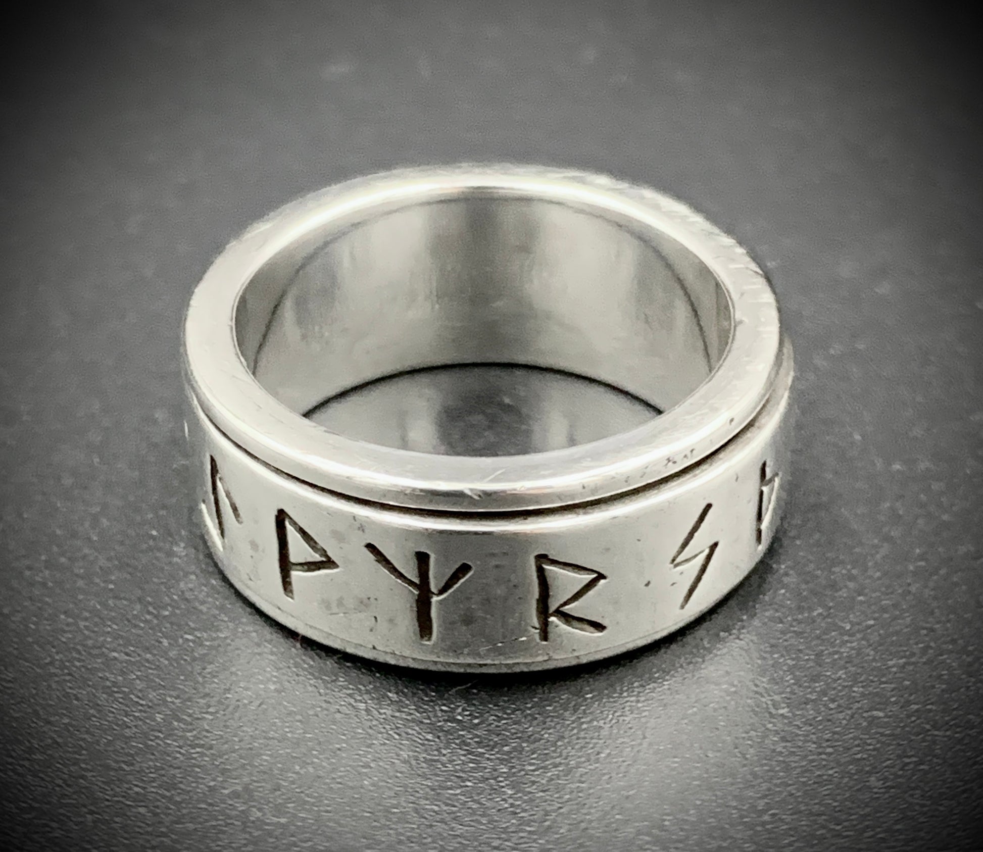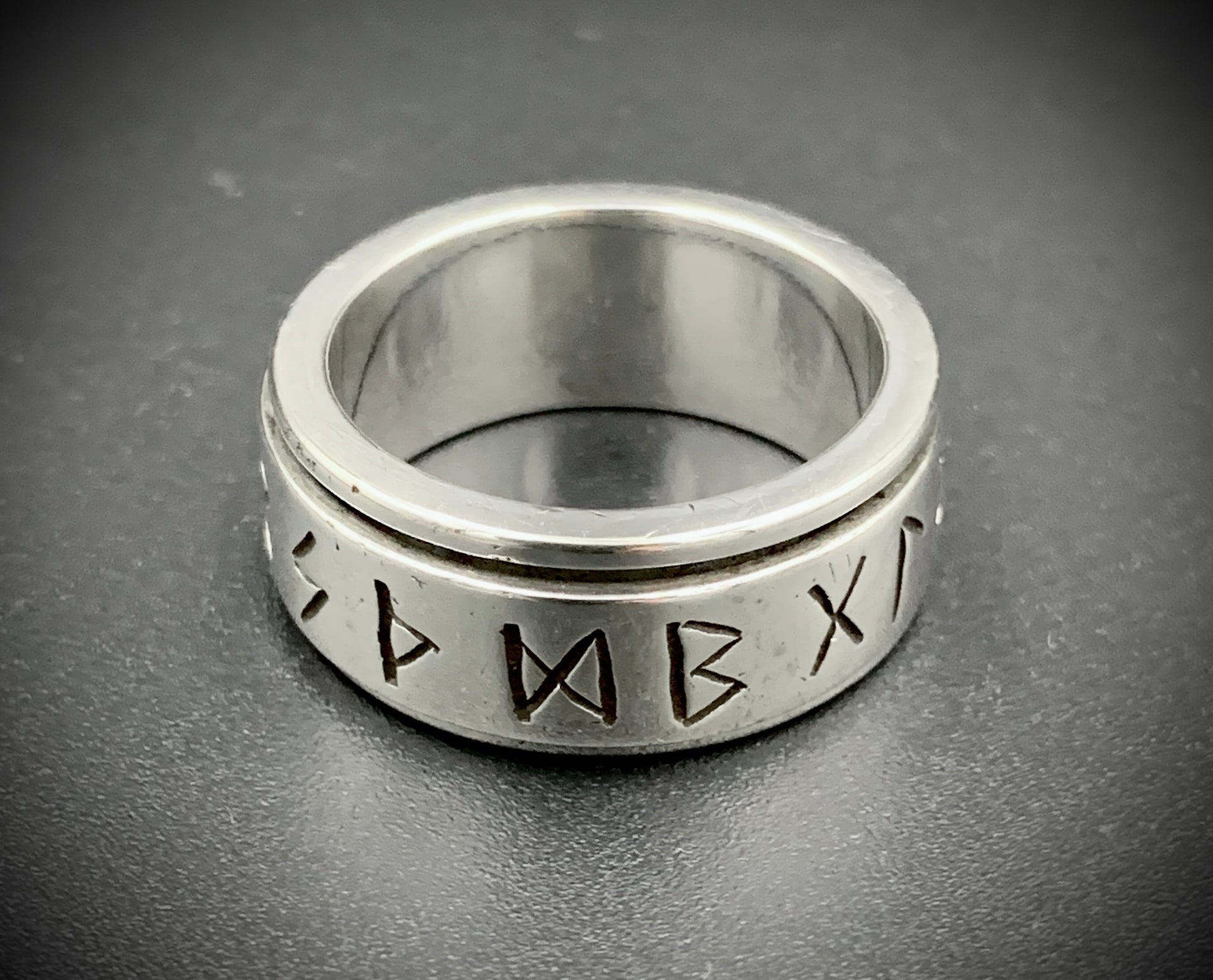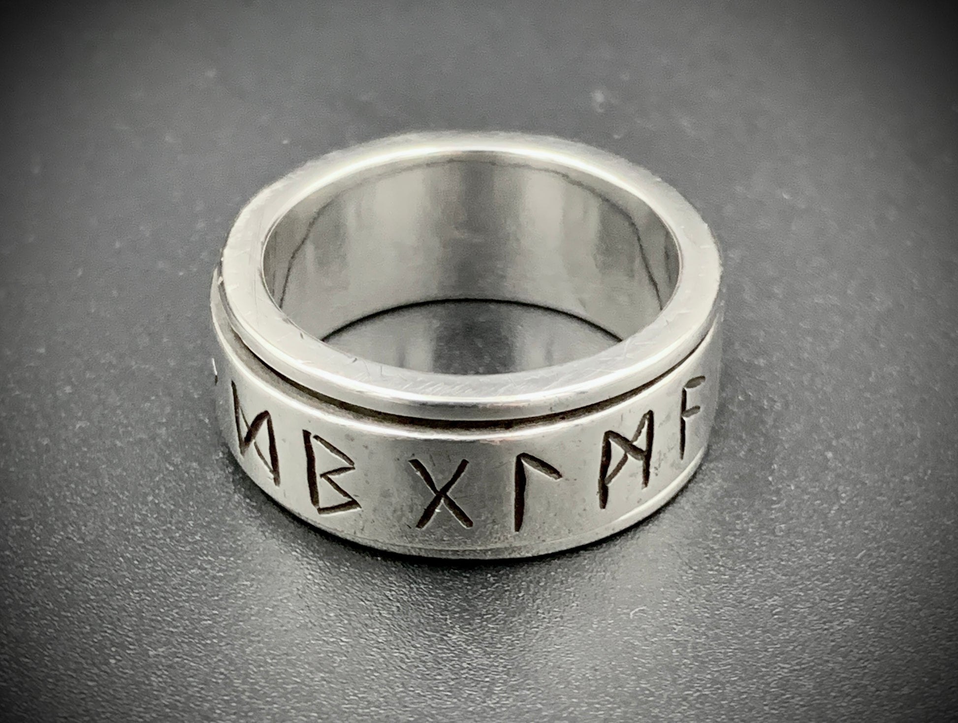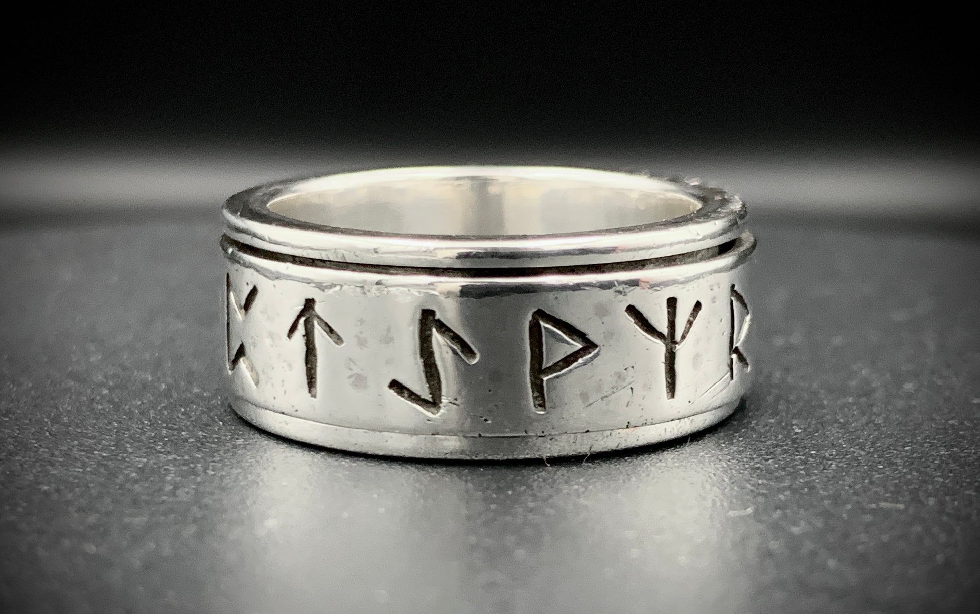 This one-of-a-kind ring is handmade from solid sterling silver, custom-crafted into a timeless piece of art that is made to last many generations. This design incorporates a hand-stamped Viking rune band over a thick base band to create a fully spinning ring. Walk the path of the Northern Mystic, drawing guidance and knowledge from the Elder Futhark runic alphabet. All sheet material used in this piece was custom-crafted from hand-poured molten silver in my solar-powered, off-grid studio.